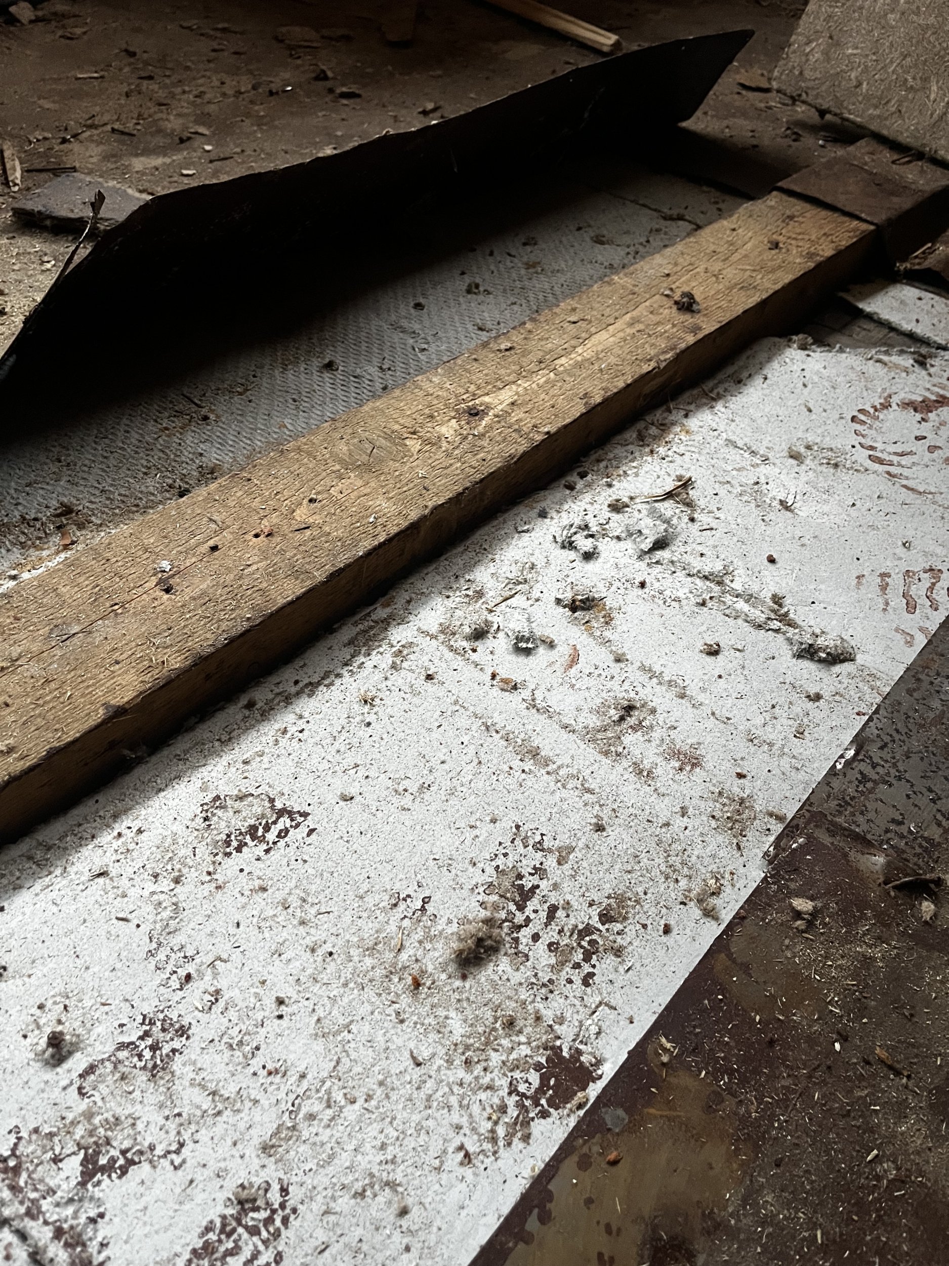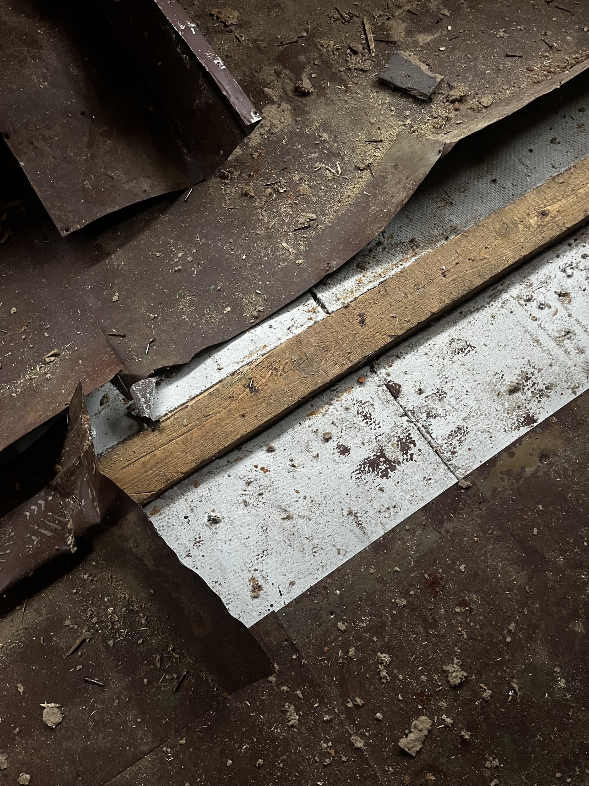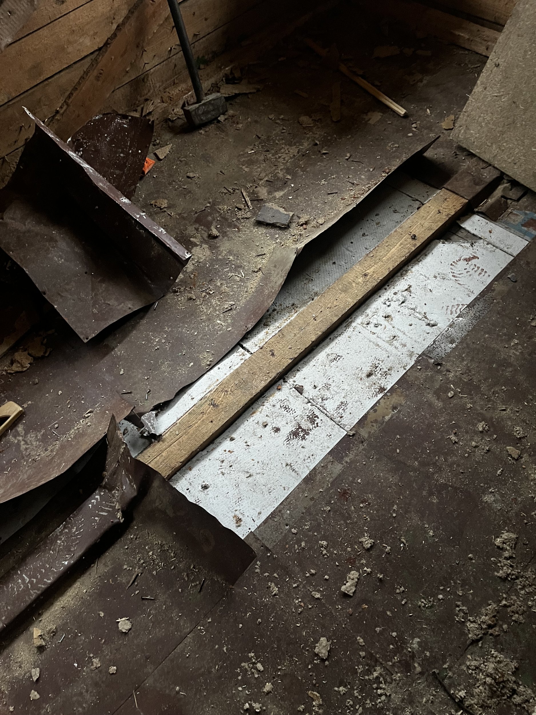 Suvila 2 korruse põrand kaetud plekiga ja pleki all materjal, mis tundub olevat asbestpapp - kindel ei ole/testitud ei ole.