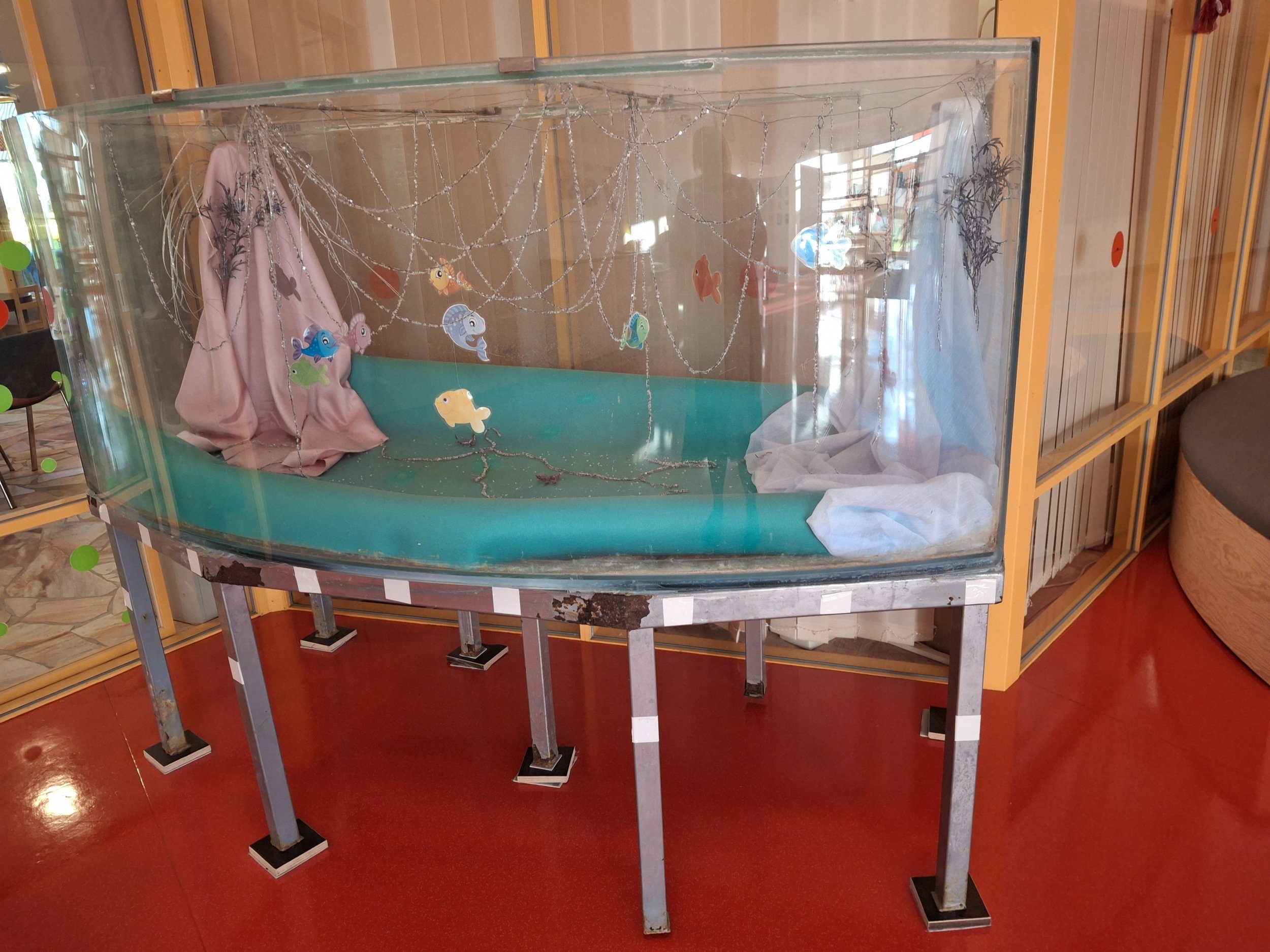 Lasteaeias seisab suur kasutatud akvaarium, mis tuleks puhastada ja ühenduskohad silikoonida, seejärel proovida veepidavust ja hankida lisaseadmed, mis on vajalikud et kalad saaks akvaariumis olla.
