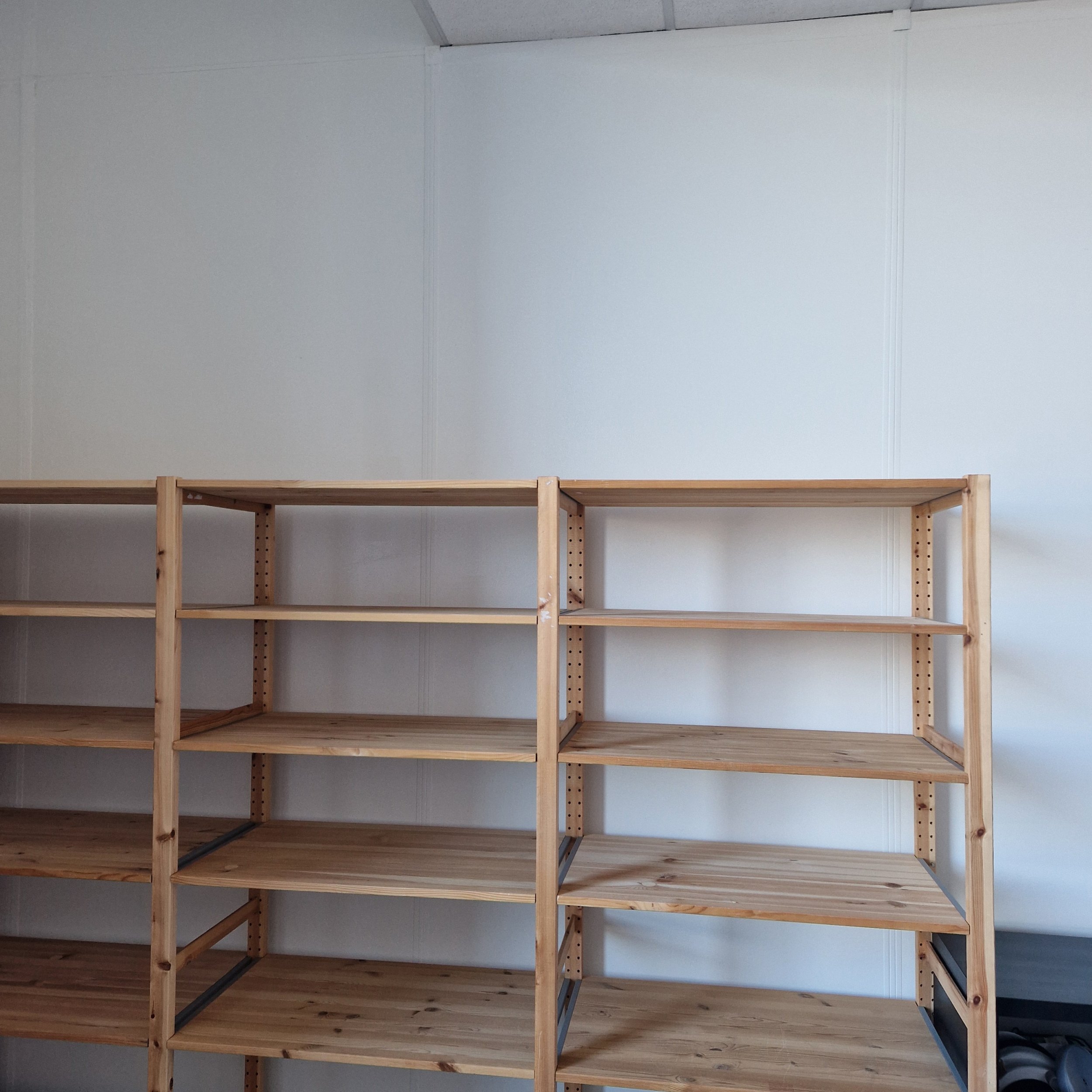 Pildil olevate riiulite seina kinnitamine selliselt et jääksid seinast ca 10 cm eemale. Olemas vajalikud nurgikud vaja valida sobivad kruvid, tüüblid. Seinas asetseb puitplaat.