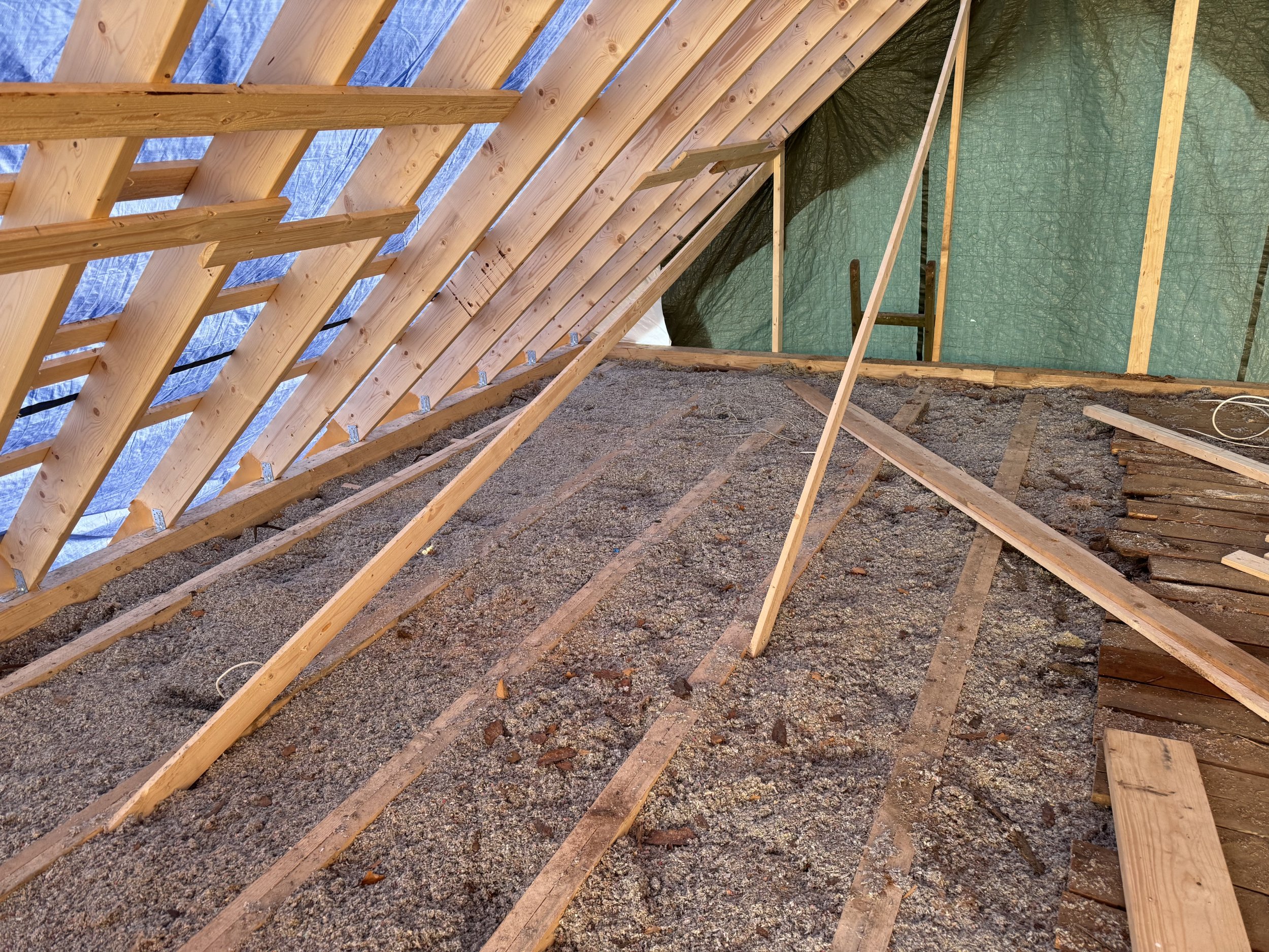 3. Ühes nurgas 2,4x6,3m ei ole laage ja tuleks paigaldada 50x150 2,4m pikast materjalist laagid välisseina ja kandva siseseina vahele. Välissein on ümarpalk mille kohal väikse vahega 150x150 prussist vöö (laagid algavad vööst 2cm altpoolt). Vahesein on 150 lai pruss kuid seal on teise poole talad ka ees ja ei ole loodis, ehk tuleb mõlemat otsa rihtida paika ning siduda korralikult mõlemi seinaga.