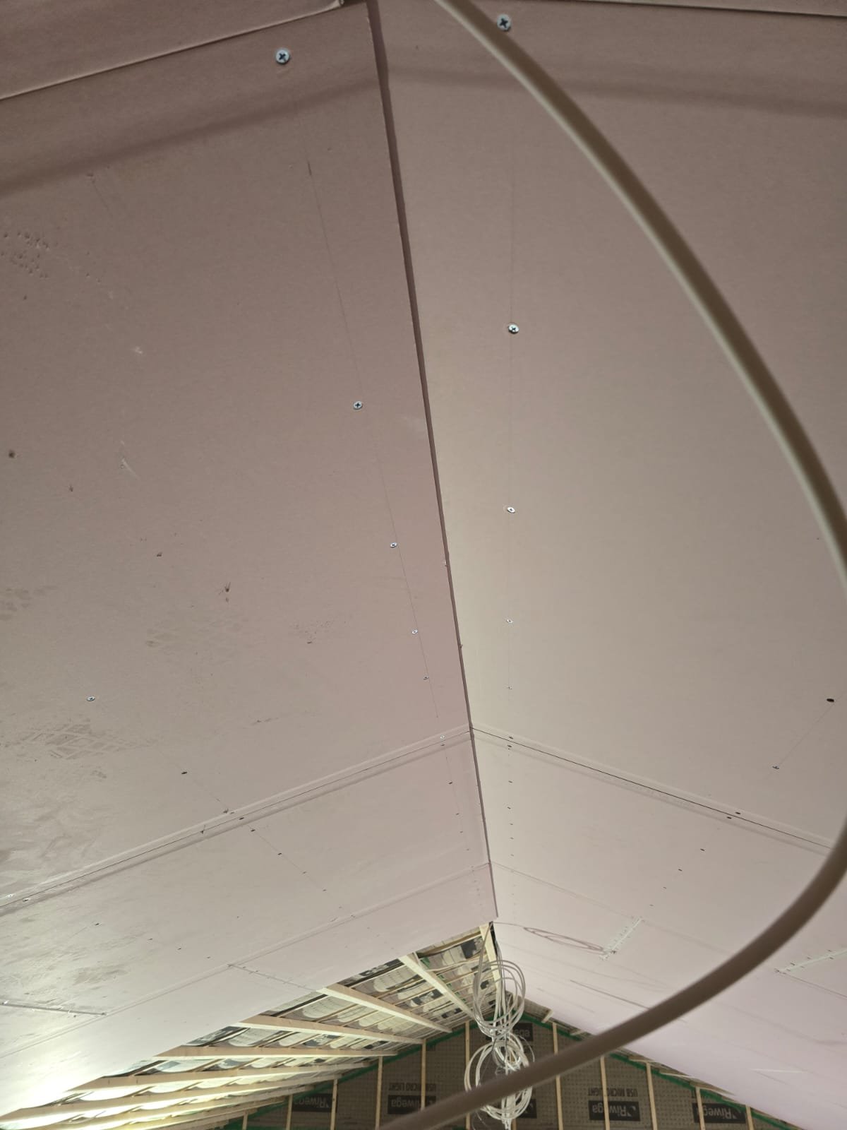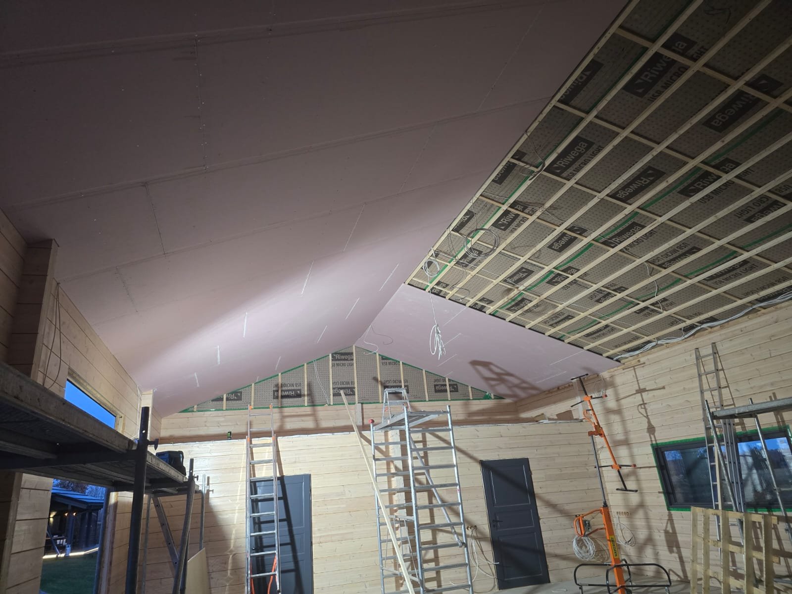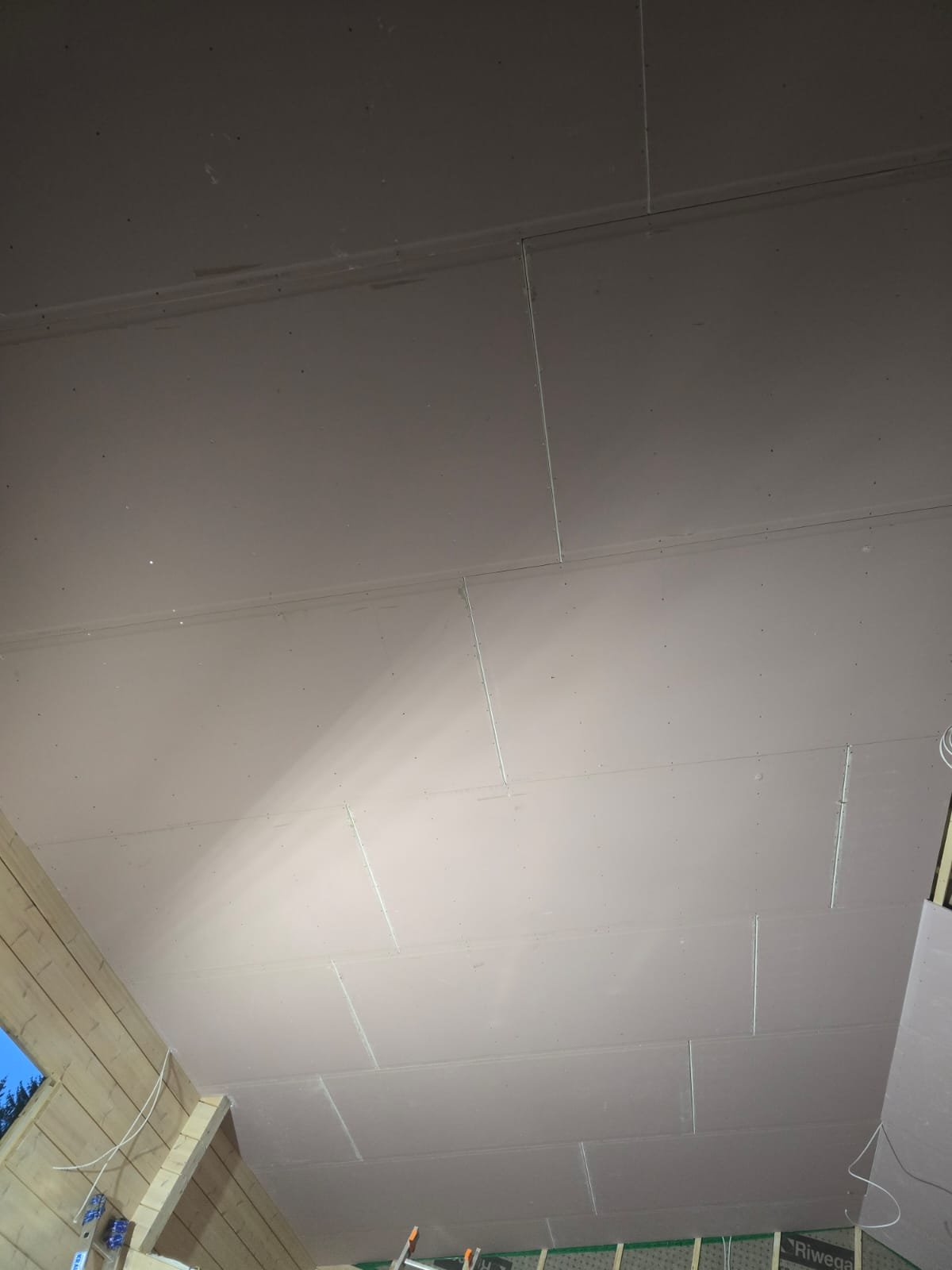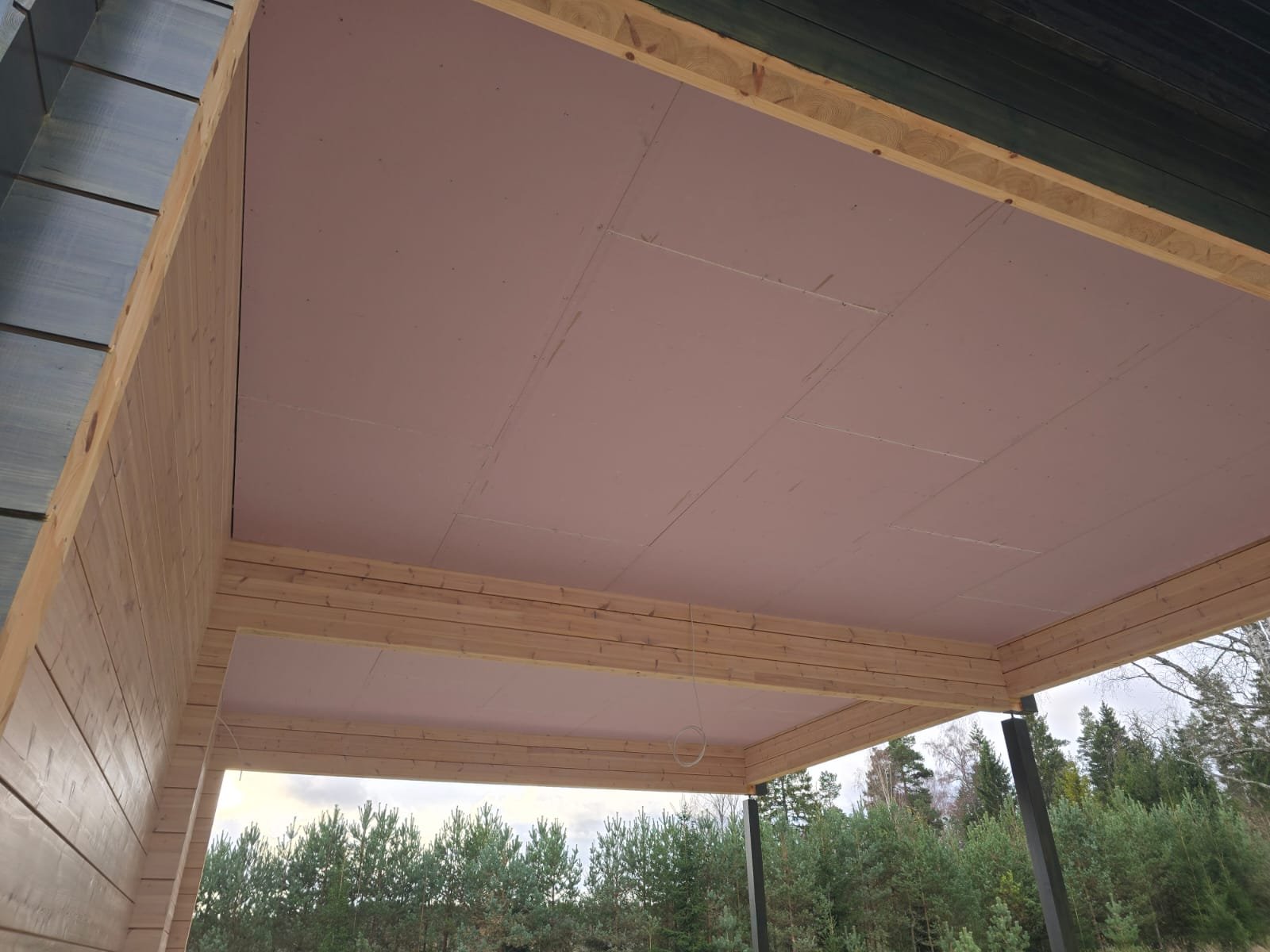 Lauspahteldus + 2 kihti valget värvi. Ääred vaja akrüüliga täita, Kaldlae tipp on 5m. kõrge. Sirge lae kõrgus 3m.