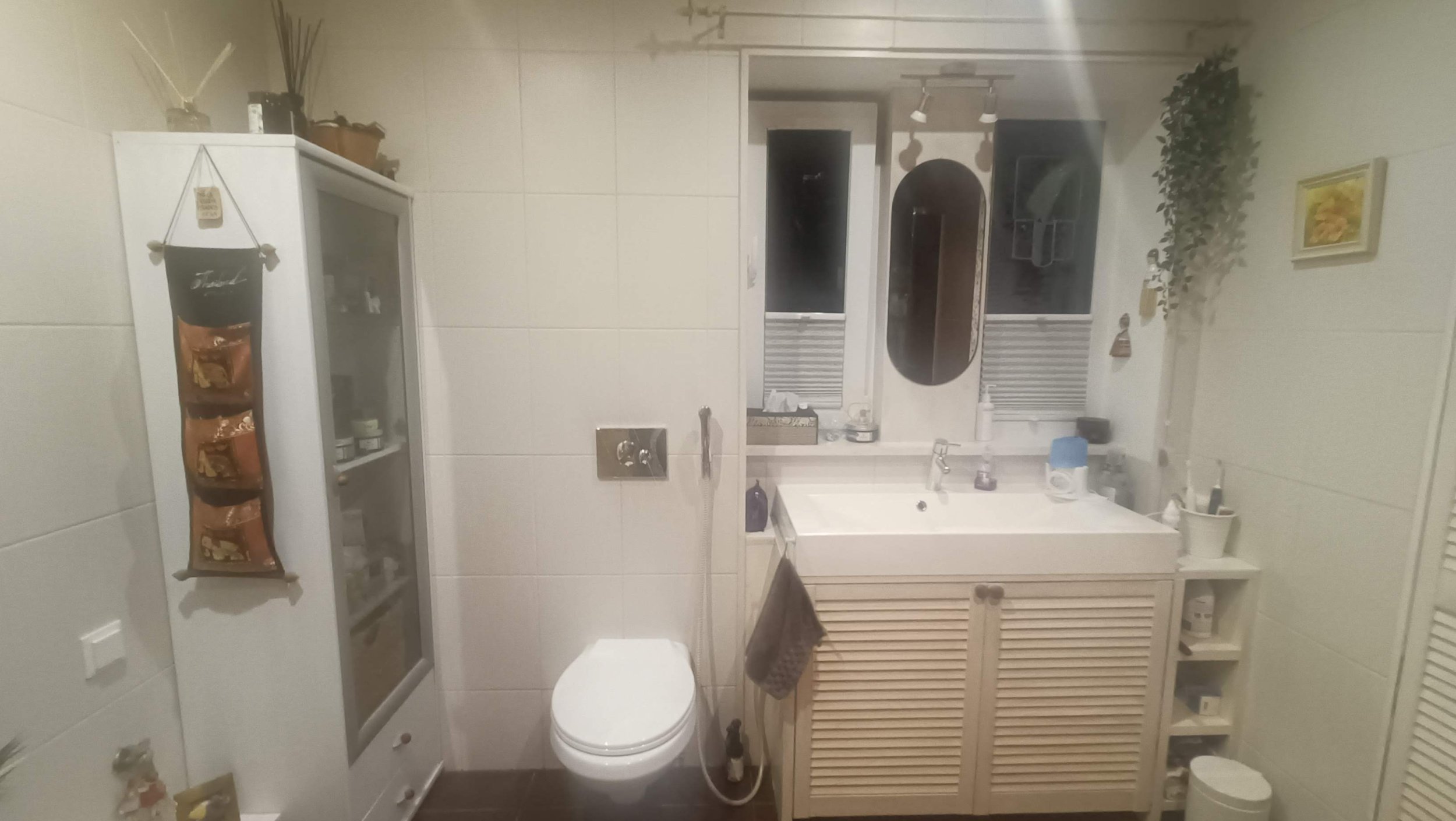 Vannitoas läheb vahetusse aken( praegu 2 kitsast akent, asemele 1 lai ja kõrgem) seega aknapaled, viimistlus ka väljastpoolt. Vahetusse läheb wc pott, paak seina sisse peidetud ja see seina tagune on paagi laiuses tühi. Kogu see sein maha, asemele ehitada nurka kapp, kõrval wc poti paak peidetuna seina sees, mille kohal riiulid. Kraanikauss samuti vahetusse, kraanikausi kapp sarnane praegusele. Ilmselt tuleb sellesse seina panna ka pisut soojustust. Lagi- olemasolevad plaadid ära, asemele sisevoodrilaud, valgustid süvistatud. Sein 2,7( L)x 2,4(K)m. Lagi 2,7x2,7m. Vajadusel el. juhtmete korrastus lae taga,
