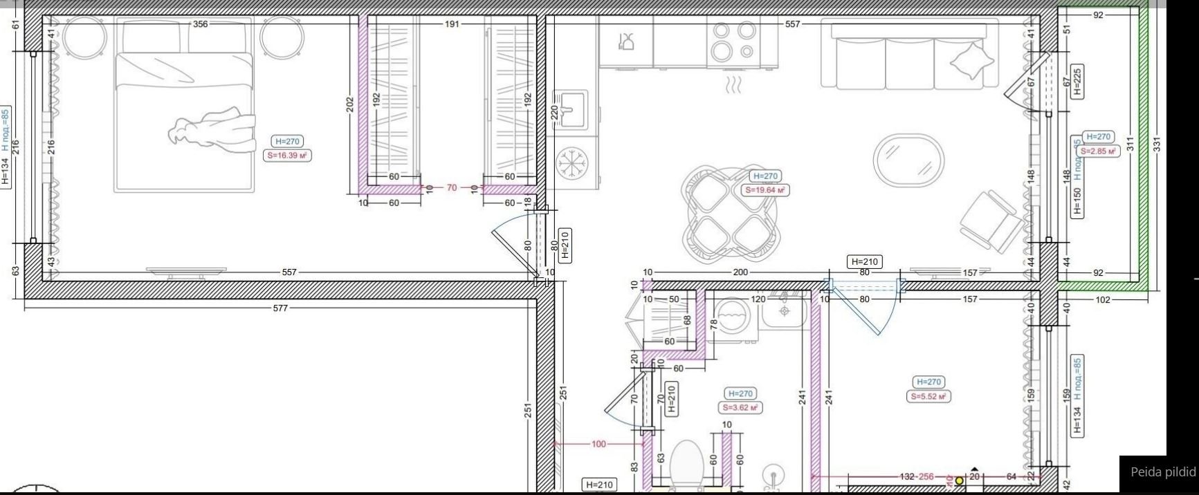 Kahetoalise korteri ümberehitus kolmetoaliseks ( 47m2) - kapitaalremont. Asukoht: Põhja-Tallinn