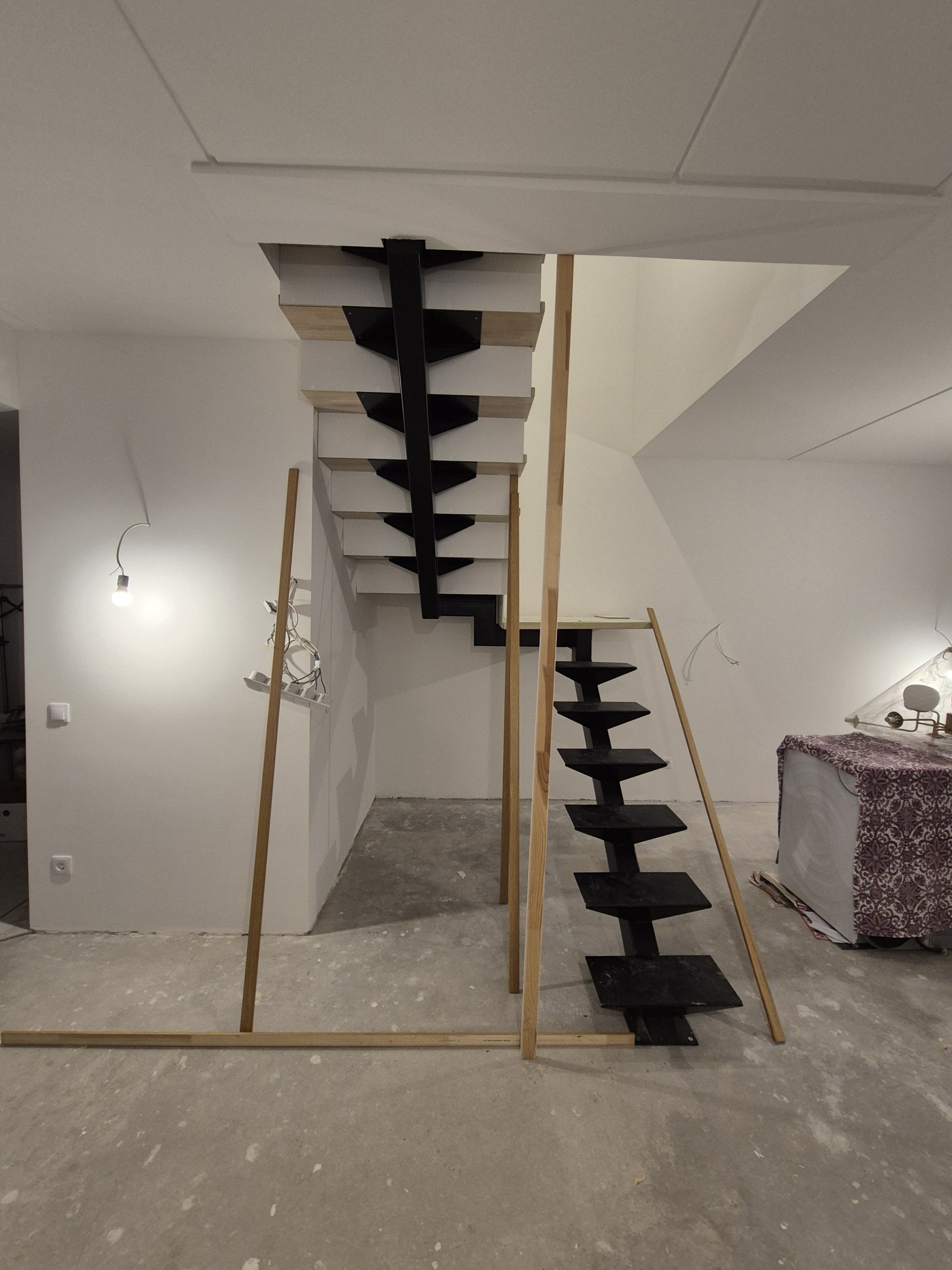 On vaja paigaldada trepialuse ja garderoobi siseseinad. Ei ole vahet, kas neid tehakse kipsplaadist või fibost. Valin seda, mis on soodsam / Нужно установить стены для гардеробной и под лестницу из гипрока или из FIBO - без разницы. Выберу те, что дешевле.