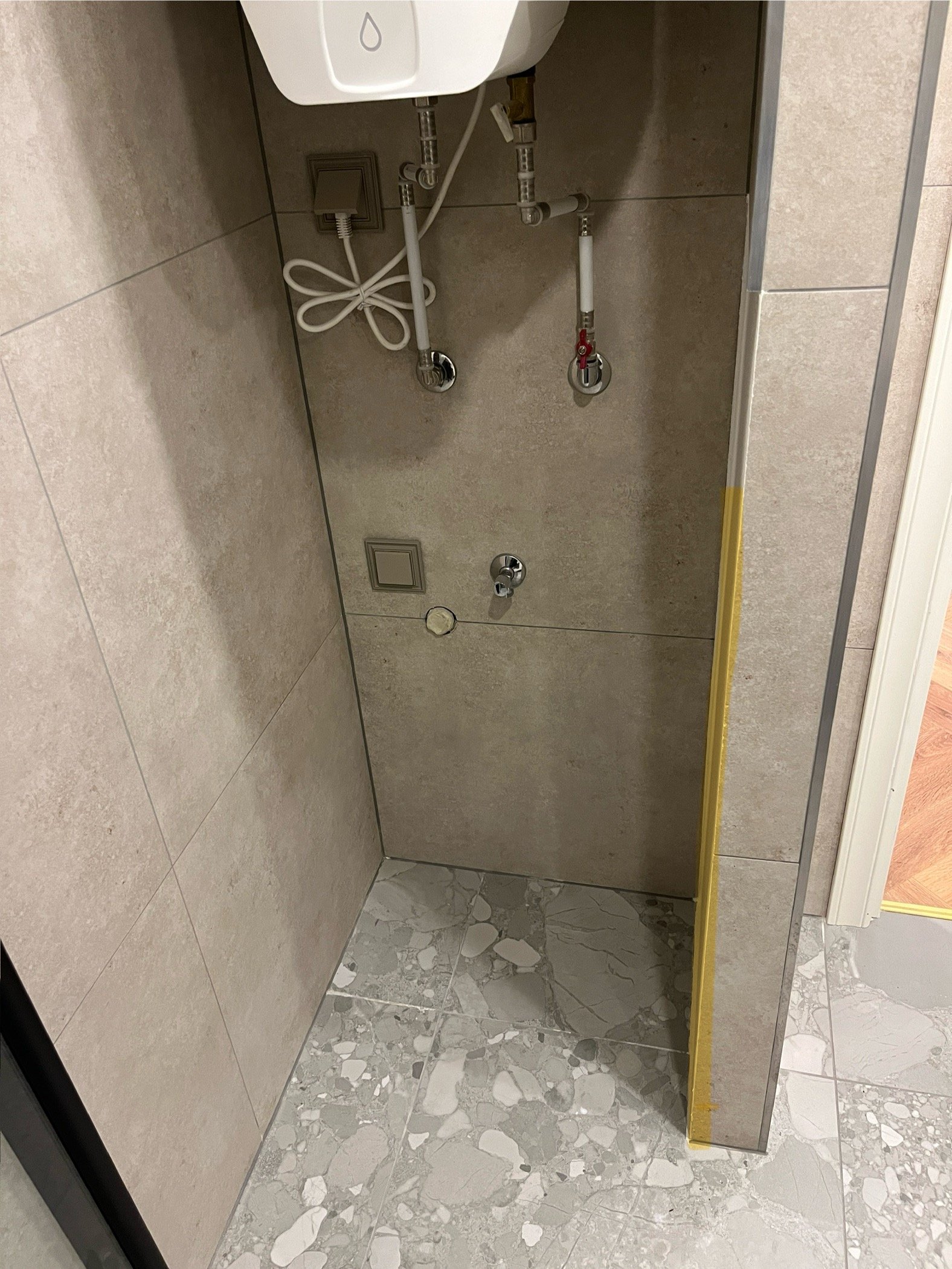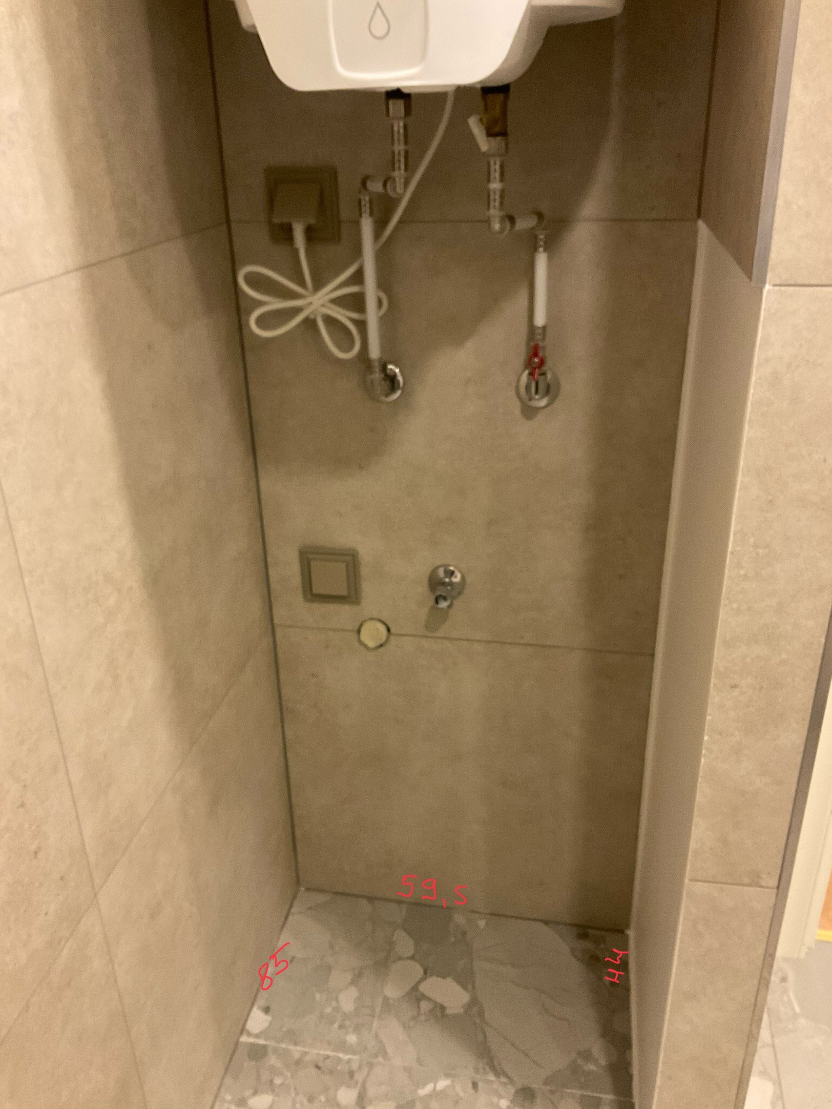 Vannitoas on eelneva remondi käigus jäetud pesumasina jaoks liialt kitsas vahe (59,5cm). Pesumasin-kuivati mõõdud aga on 60 cm ning selle jaoks oleks vaja seina veidi ümber ehitada. Pildil kollasega märgitud seina liigutada ei saa kuna seal on püstakud. Üheks võimaluseks oleks ilmselt vasakult plaadid ära võtta ning seina viimistleda nii nagu paremal ääres tehtud on.