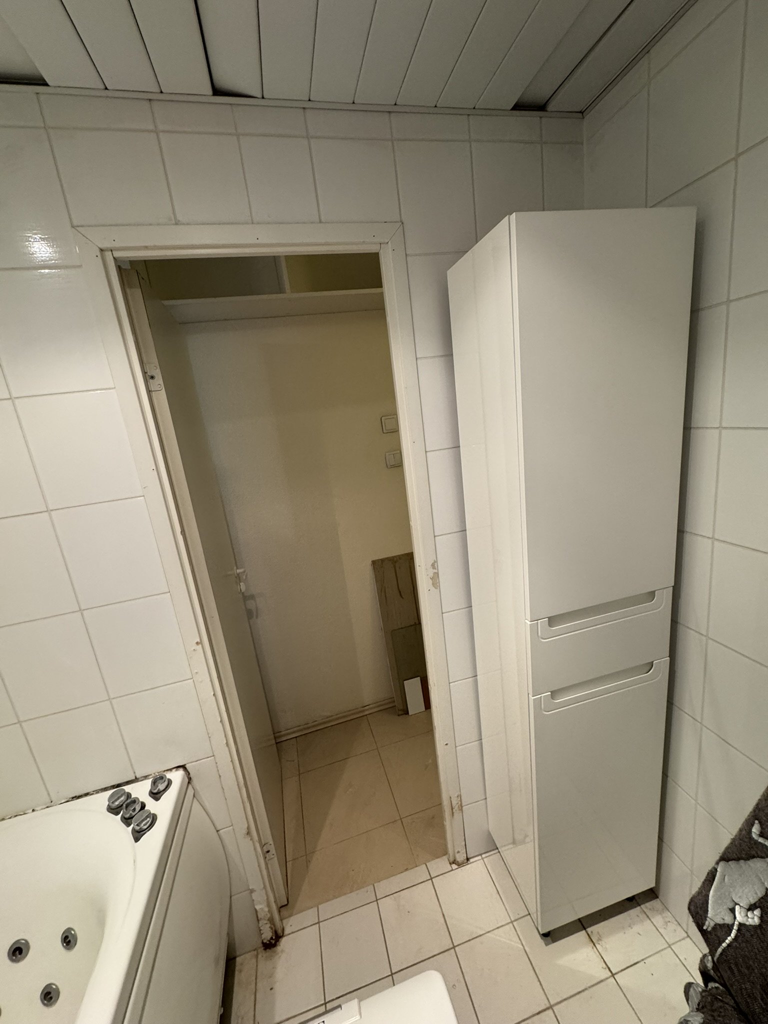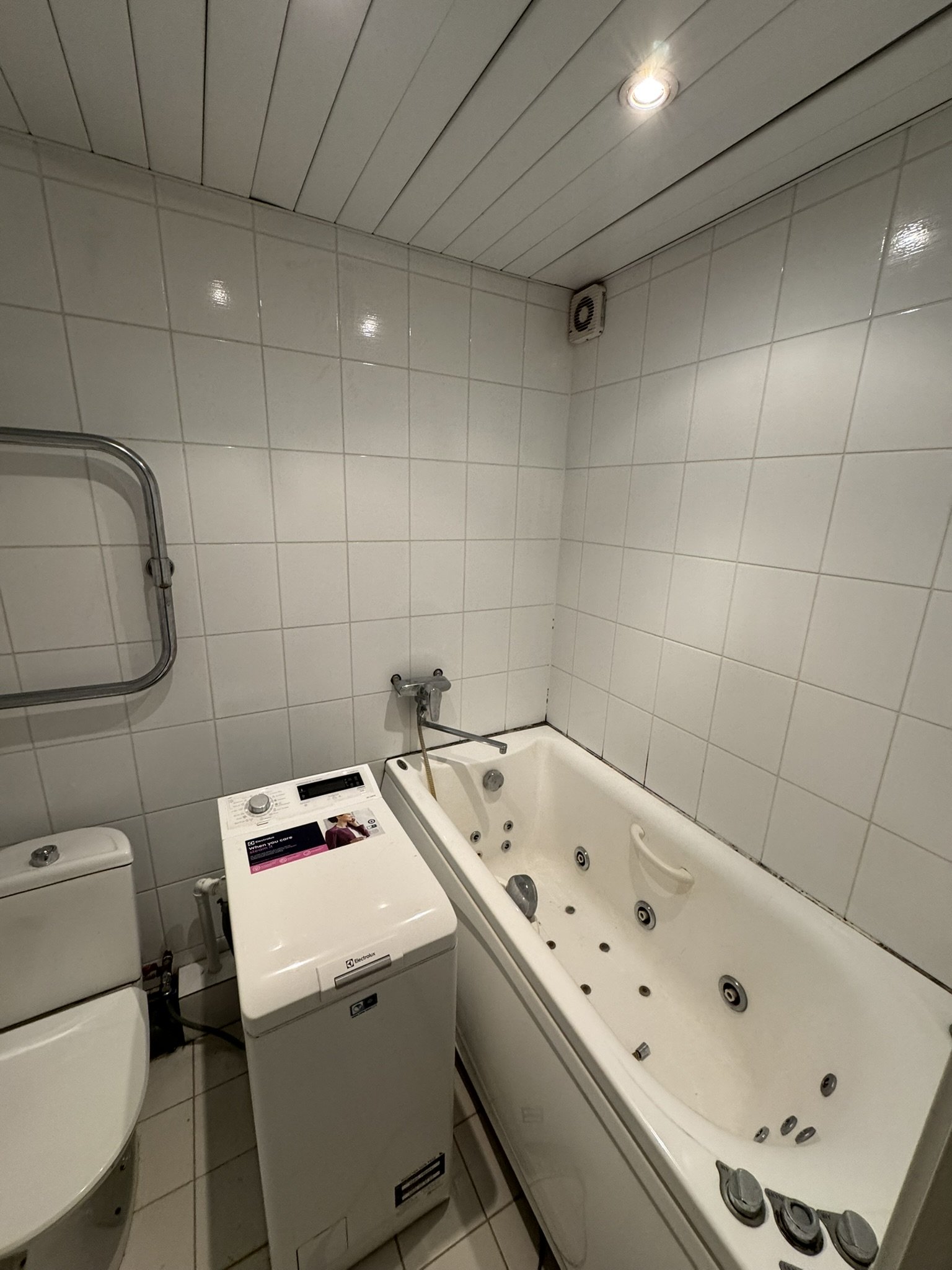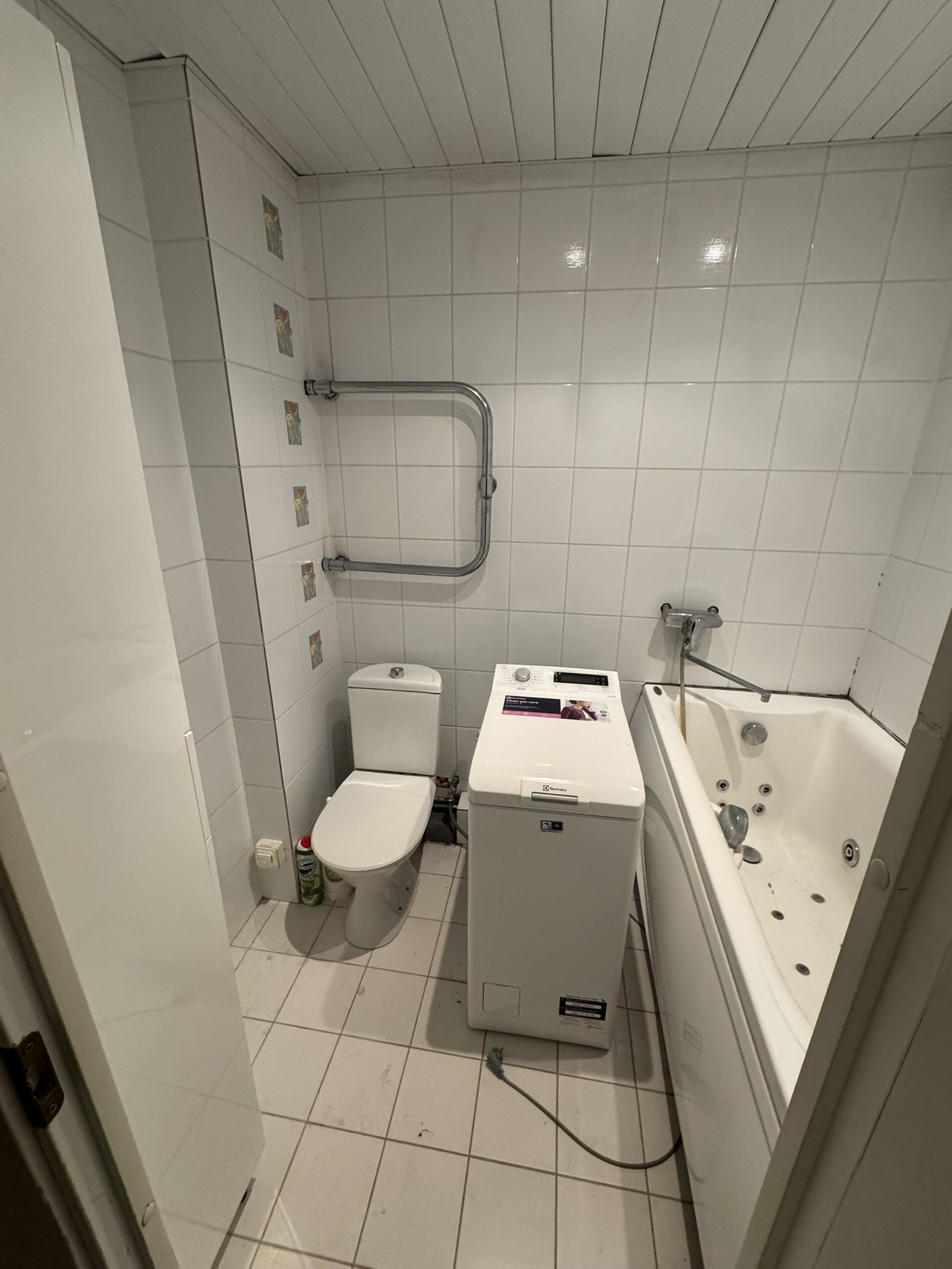 Tavaline 5 kordne 1968 ehitatud paneelelamu, esimese korruse vannituba. Vaja on asendada vann dušinurgaga, viia pesumasin vanni jalutsi kohale (uksest sisenedes paremale), ning pesumasina praegusele asukohale tekitada segisti + kraanikauss. Ruumil on elektriline põrandaküte ja elekter ripplae peal. Vanni tagune ala on plaaditud. Ukseliistud on saanud niiskust ning vajavad vahetust. WC poti tagune plaaditud aste vajab lõpetamist. Piltidel näha olev kapp vajab seina külge kinnitamist.