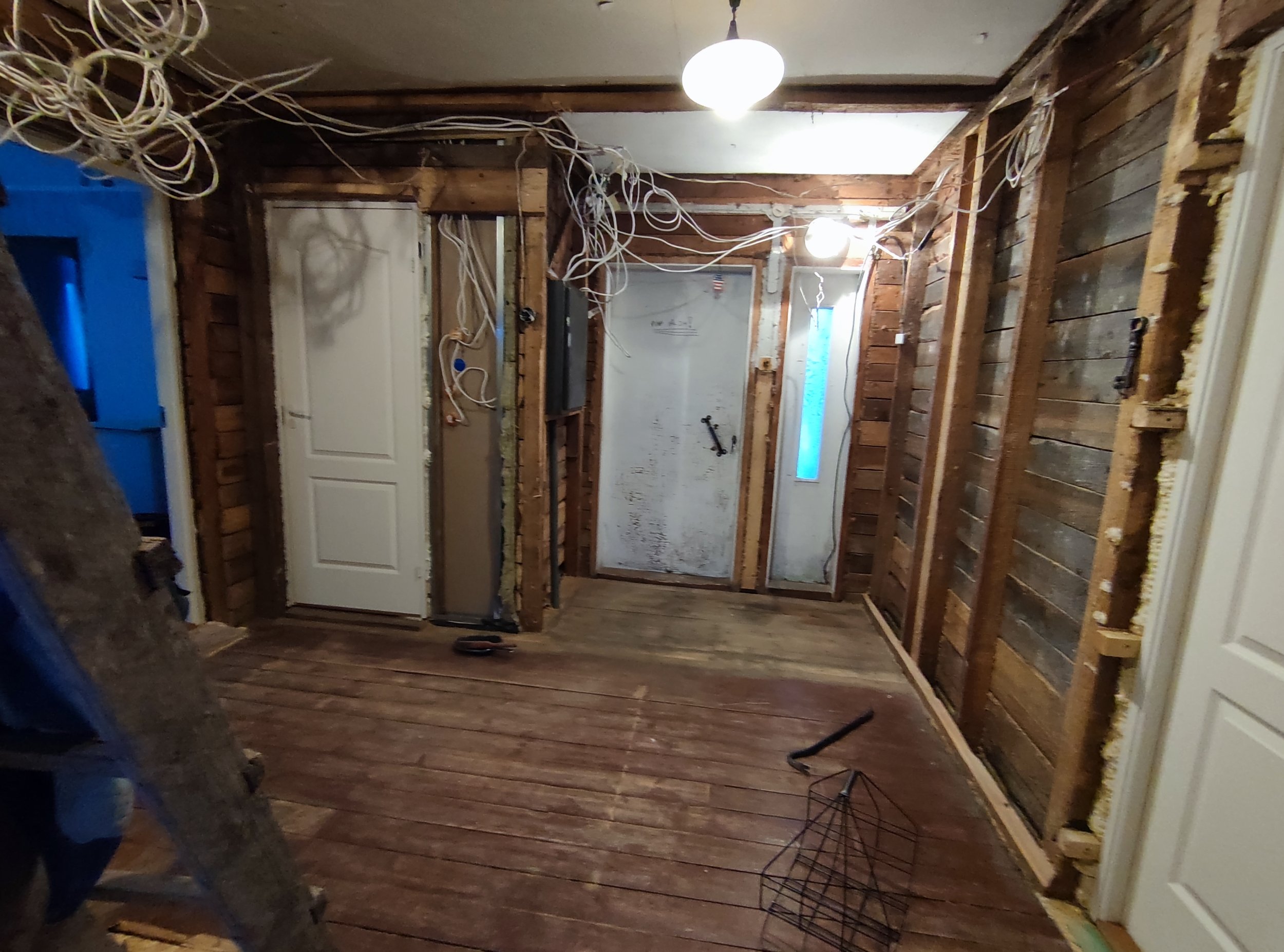 - Seinad puhtaks kuni välimise musta lauani (seestpoolt: kips, pooltel seinadel metallkarkass 50mm villaga, tuuletõkkeplaadi laadne pehme materjal, must laud, paber, saepuru sõrestiku vahel (150mm).