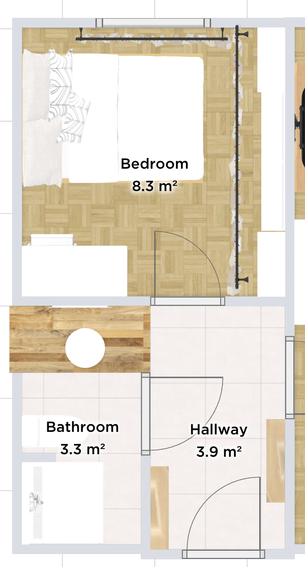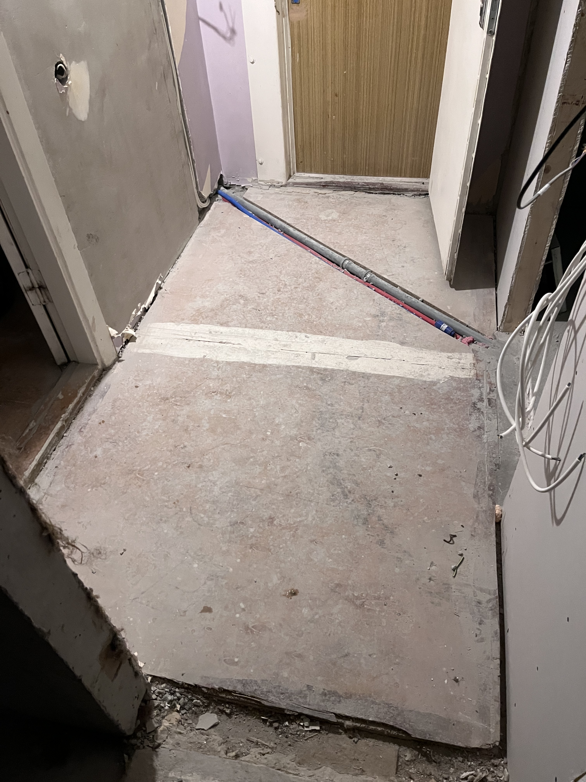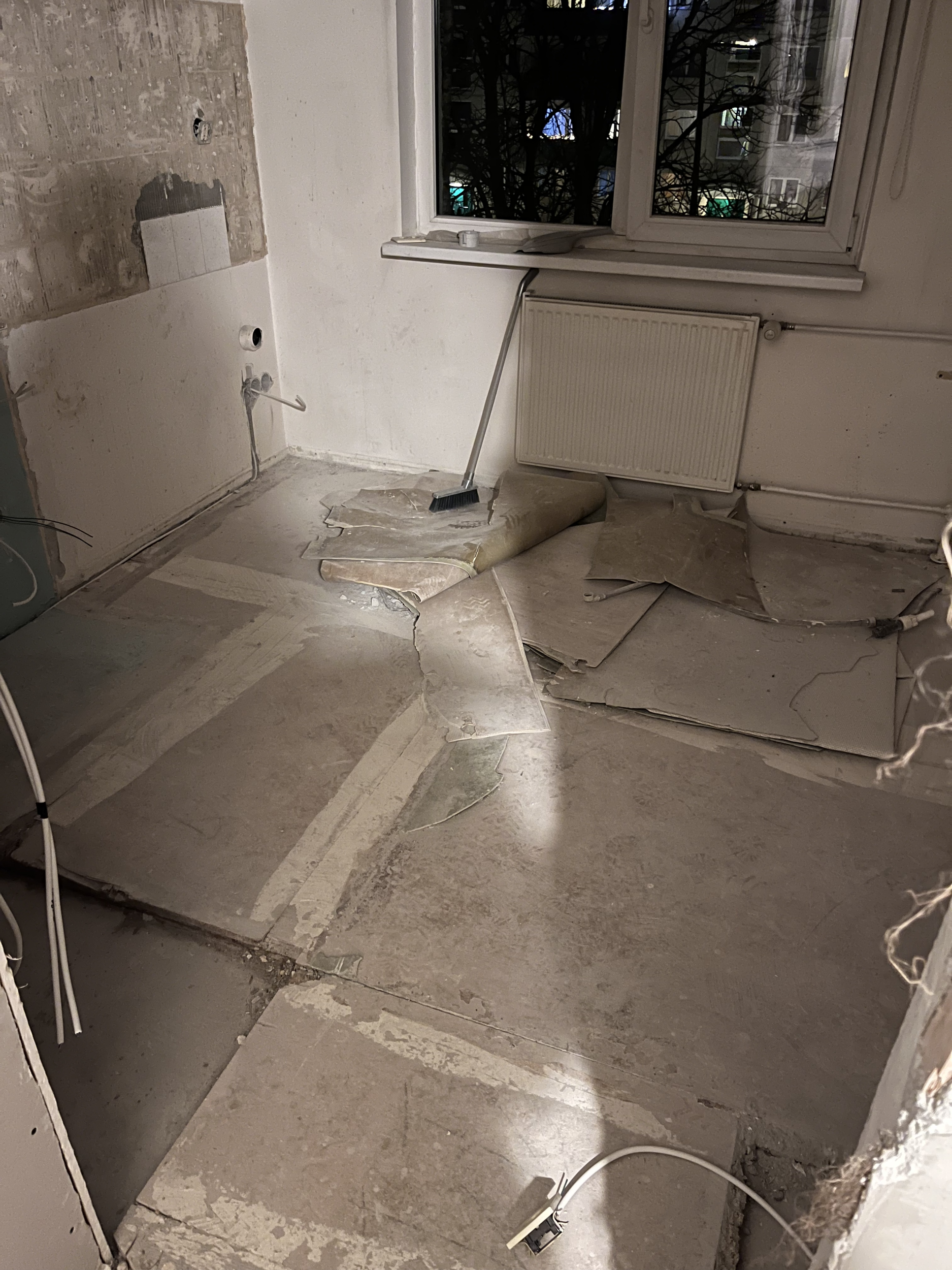 Üks tuba põrandal on vana aluskiht (puitlaast), kui saab kasutada võib alles jääda. Kaks kohta, kus on betoonini puhas, see osa oleks vaja tasandada nt osb plaadiga ja uus põrand panna. Toa suurus ~8.3m2.