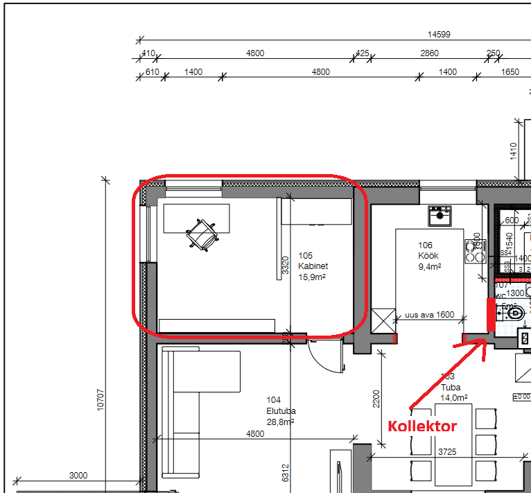 Tuba ise on ca 16m2, s.h sisseehitatud kapi osa. Põrandakütte kollektor asub kõrvaltoas (märgitud pildil). Torud oleks vaja vedada kõrvaltoas kollektorisse mööda välisseina (välisseinas jooksu ulatuses oleks vaja küttetorud korralikult soojustada). Kõrvaltuba (projektil märgitud "106 Köök" on hetkel tühi.