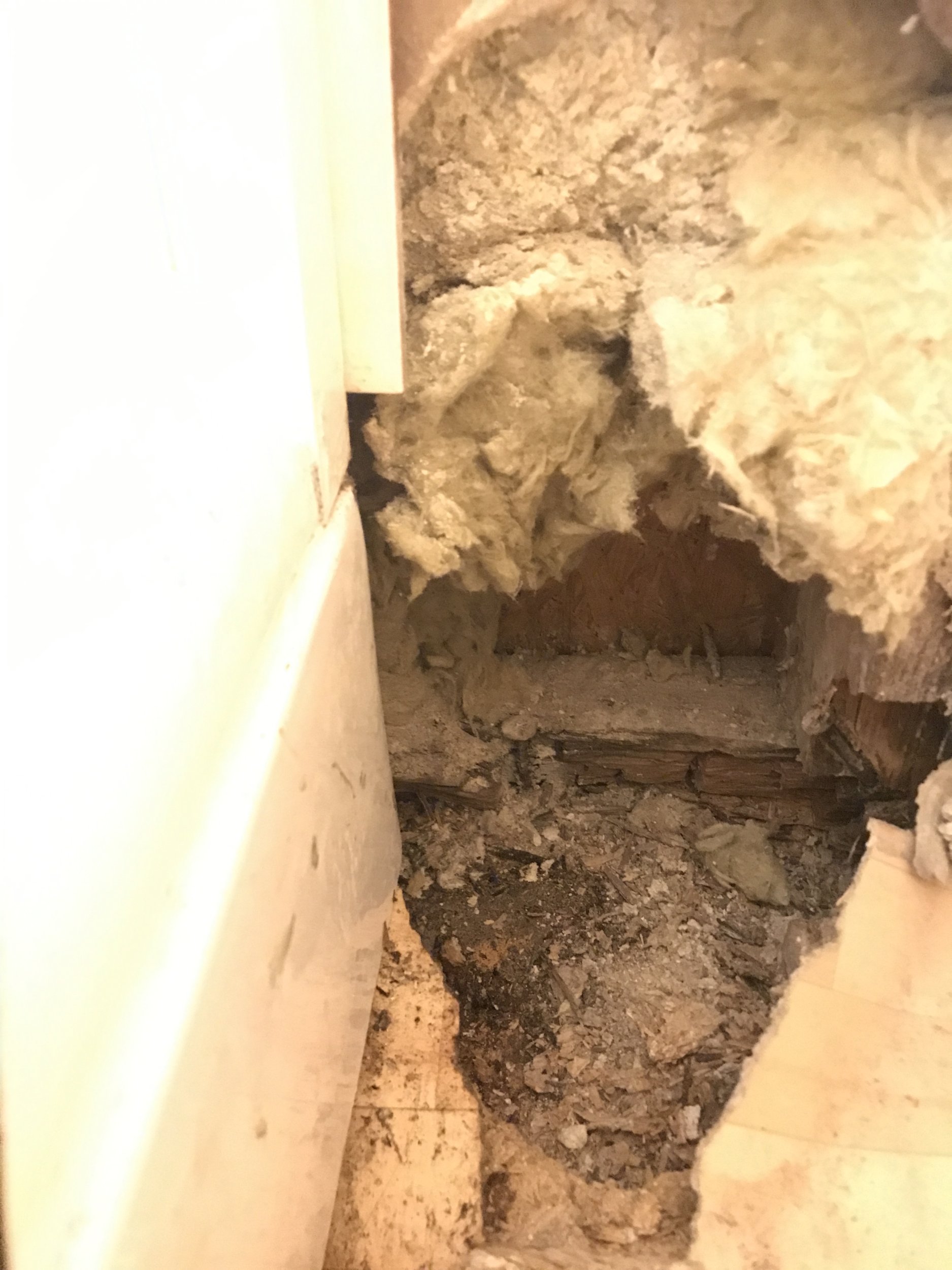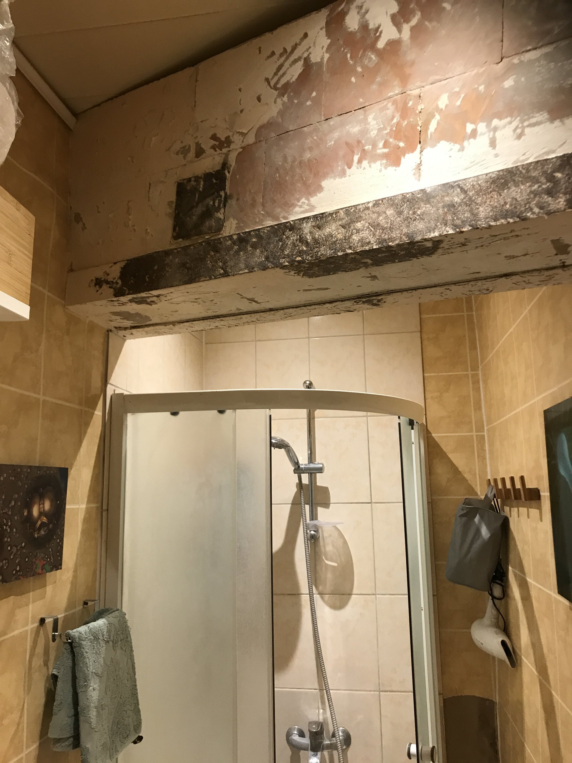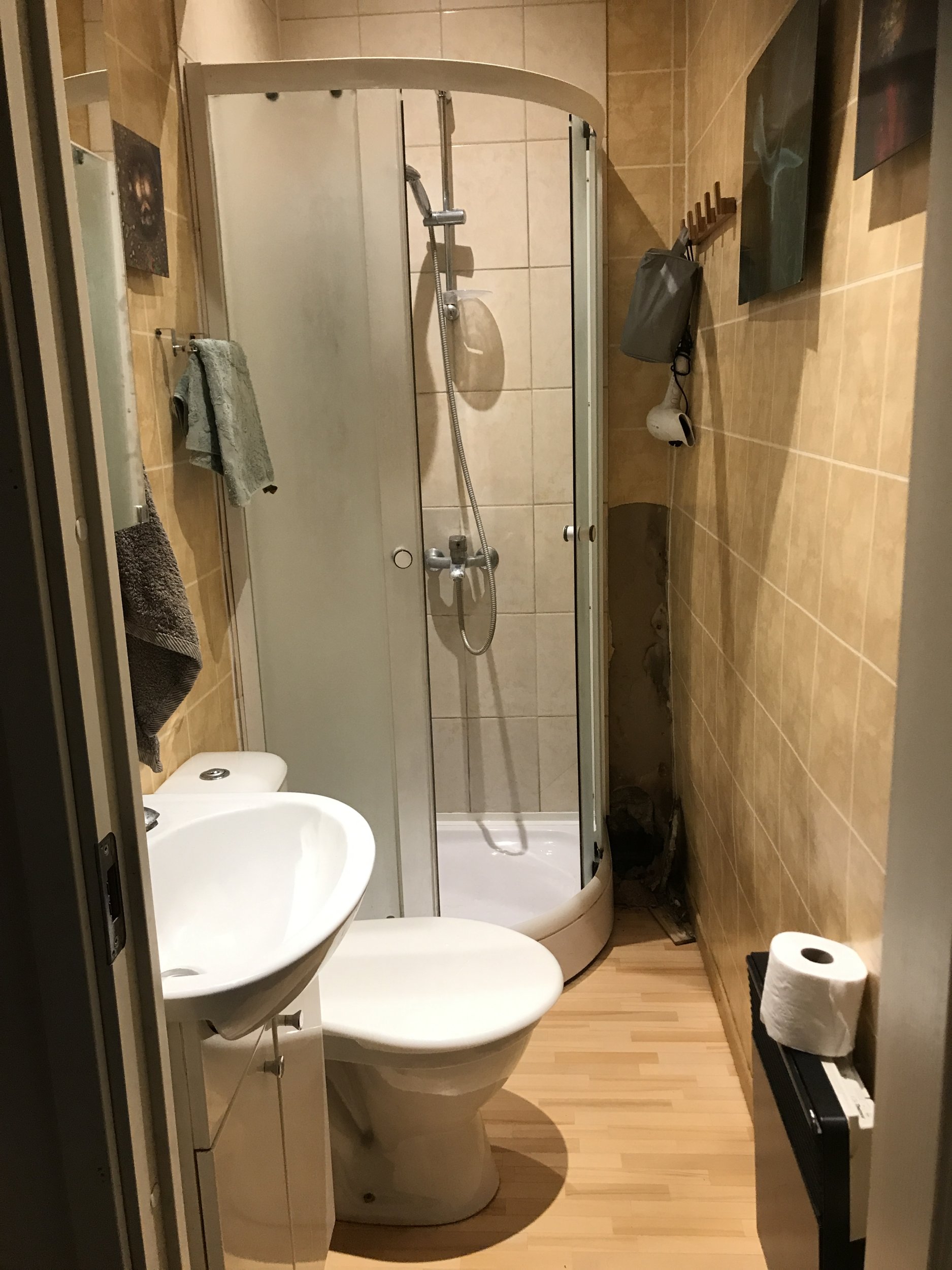 Väikses vannitoas on sein ja põrand veekahjustusega. Vaja vana dušikabiin eemaldada, otsaseinast kipsplaat eemaldada ja sein parandada, põrandal osaliselt (dušikabiini alt ja kõrvalt) samuti saepuruplaat eemaldada ja põrand parandada. Kogu seinalt vinüül eemaldada, põrandalt linoleum. Kogu põrand plaatida, sein osaliselt plaatida dušikabiini osas ja kraanikausi kohal). Ülejäänud sein parandada (karta on, et vinüüli all on vana ja pudenev krohv) ja viimistleda. Paigaldada uus dušikabiin, dušisüsteem ja vahetada WC-pott. Kraanikauss ja kapid selle kohal ja all võiksid jääda, aga ilmselt tuleb vahepeal ära võtta ja tagasi panna.