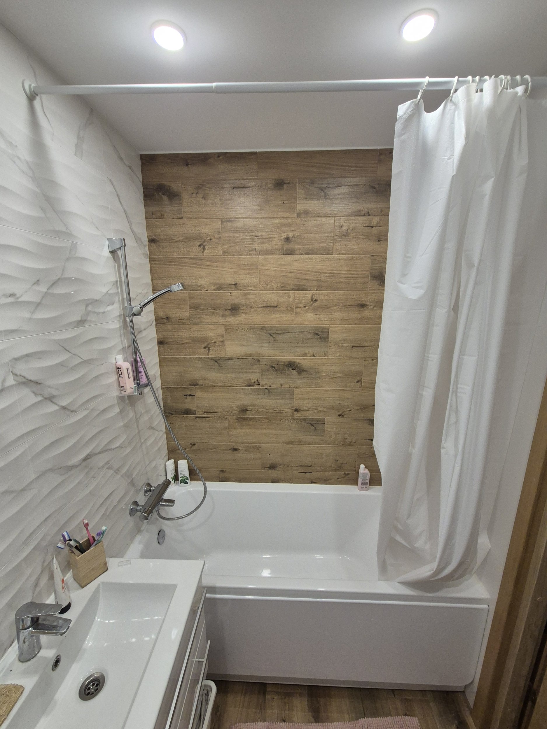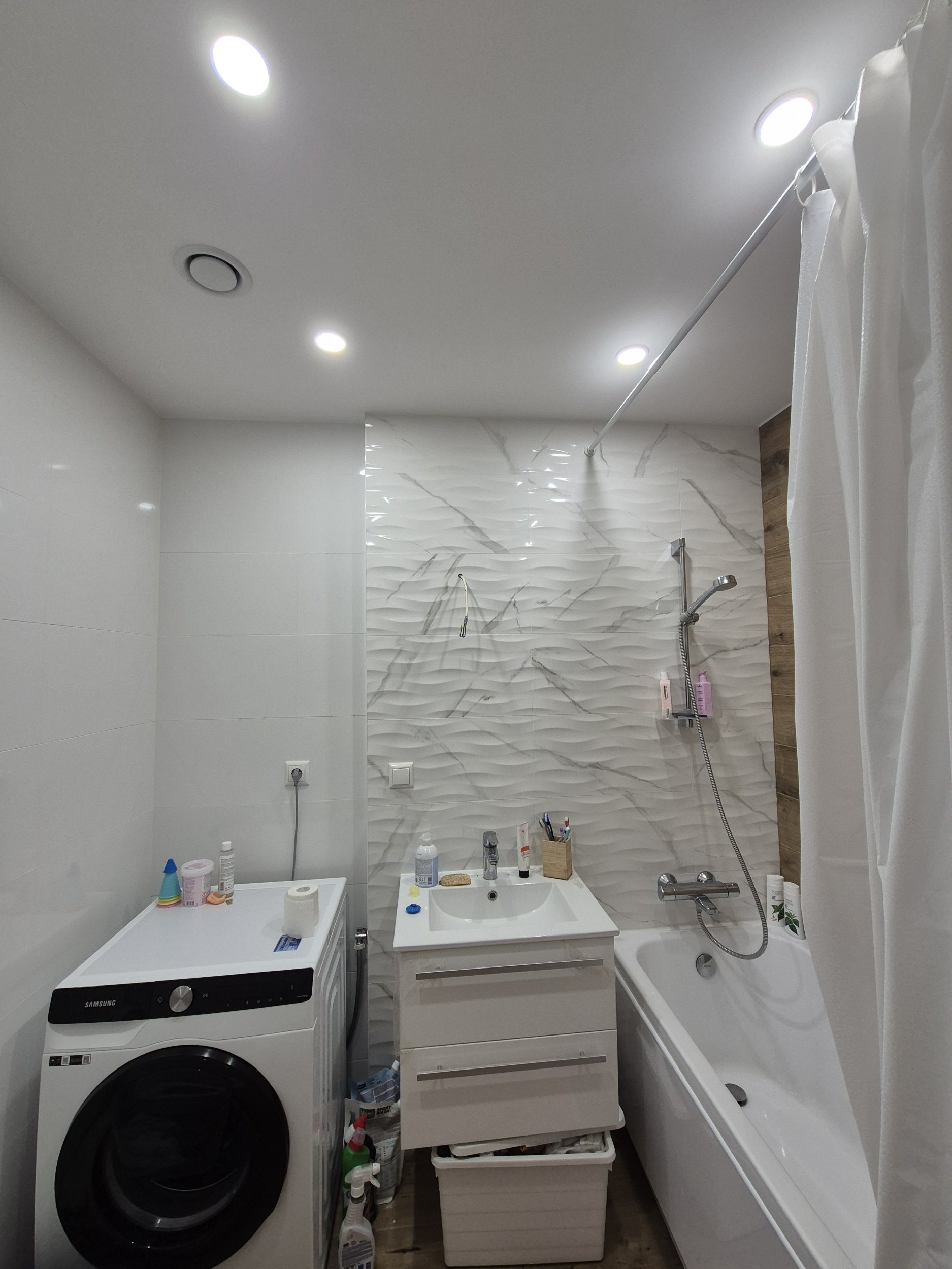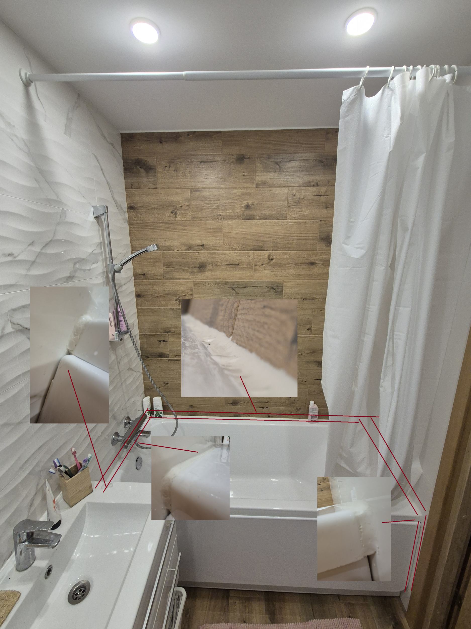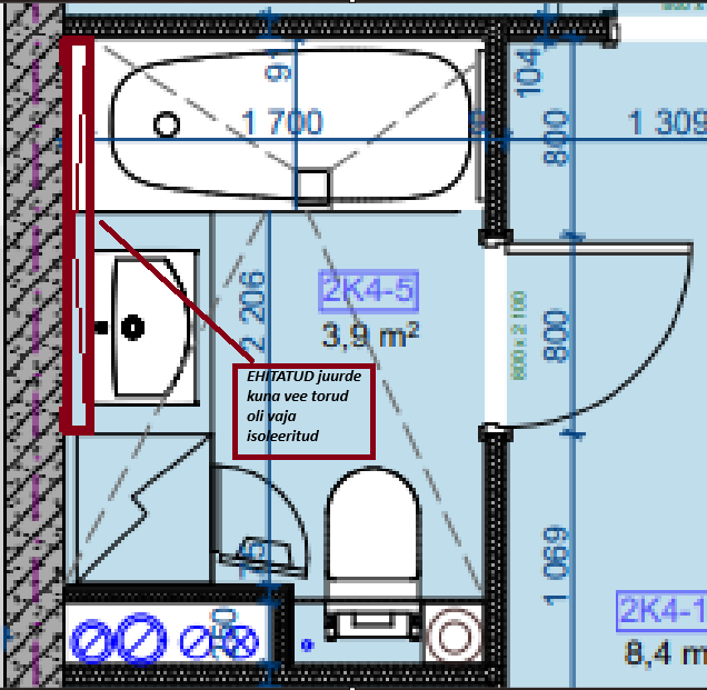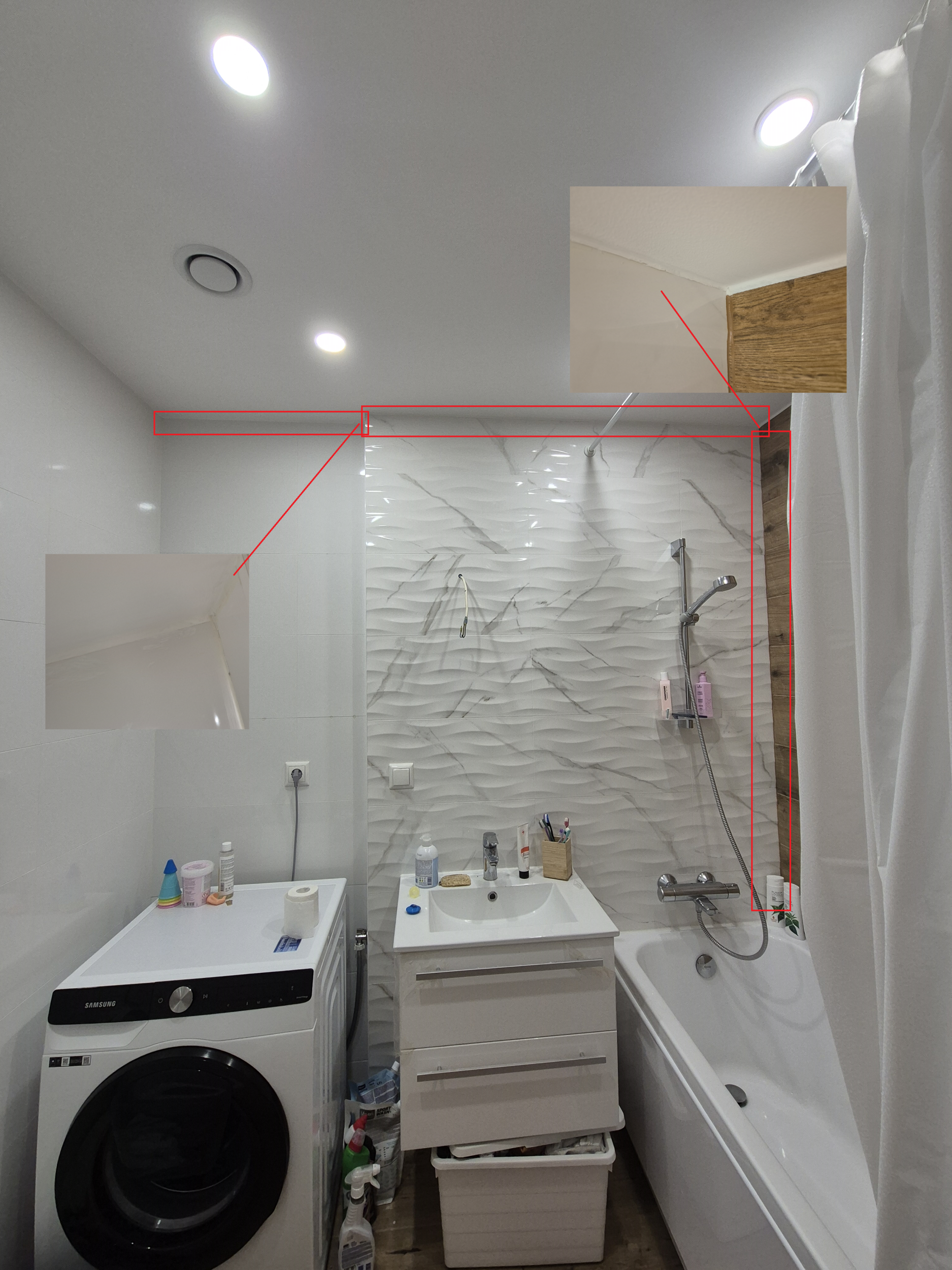 Vannitoas oli ümberehitus ( lisandatud karkas ja uued plaadid vee torud oli vaja isoleerida ) vann oli ümber paigaldatud ja tehtud silikooni tööd ja laes oli lastud akrill lae ja plaadide vahel. sooviks seda kõiki korda teha.