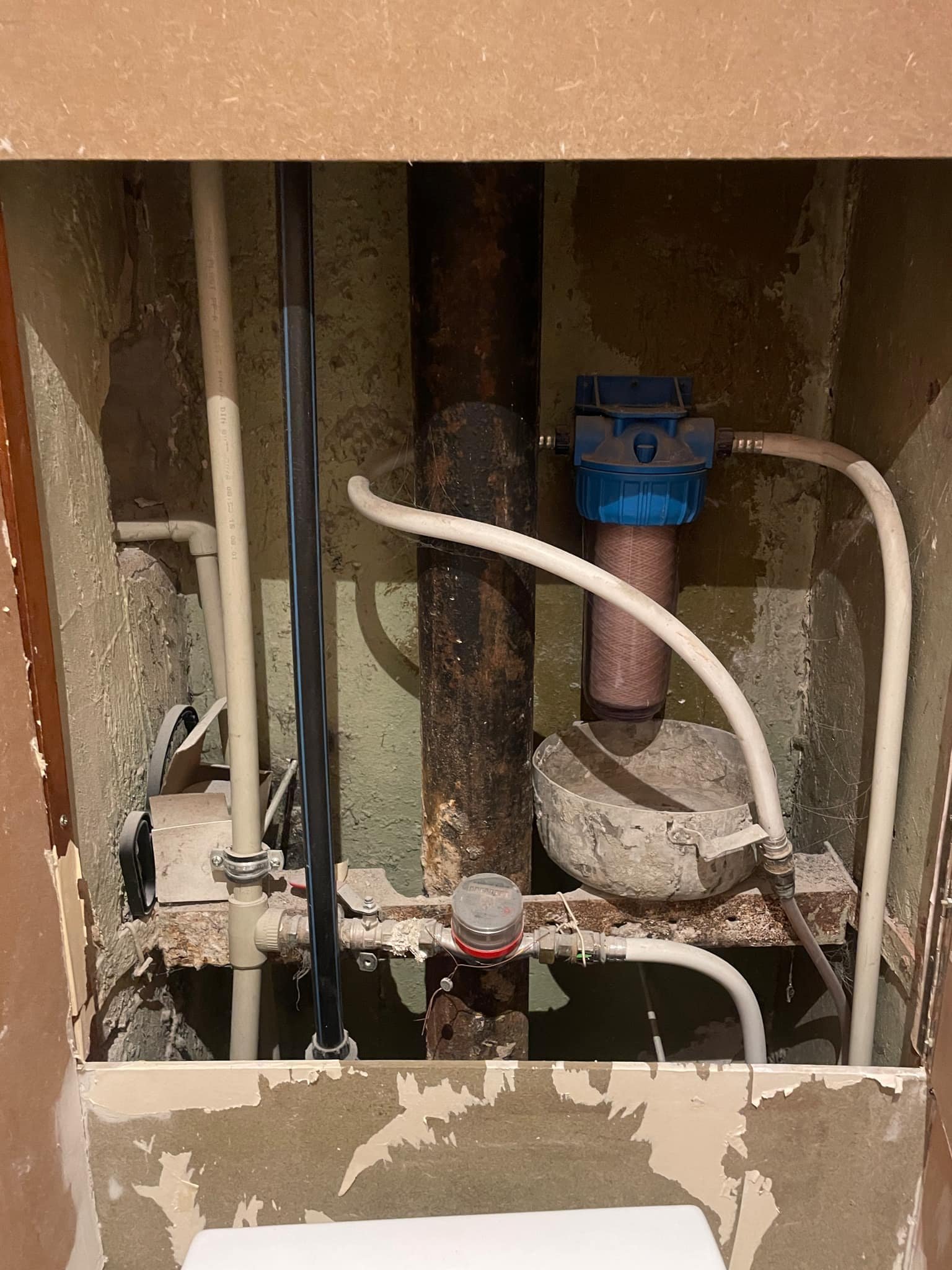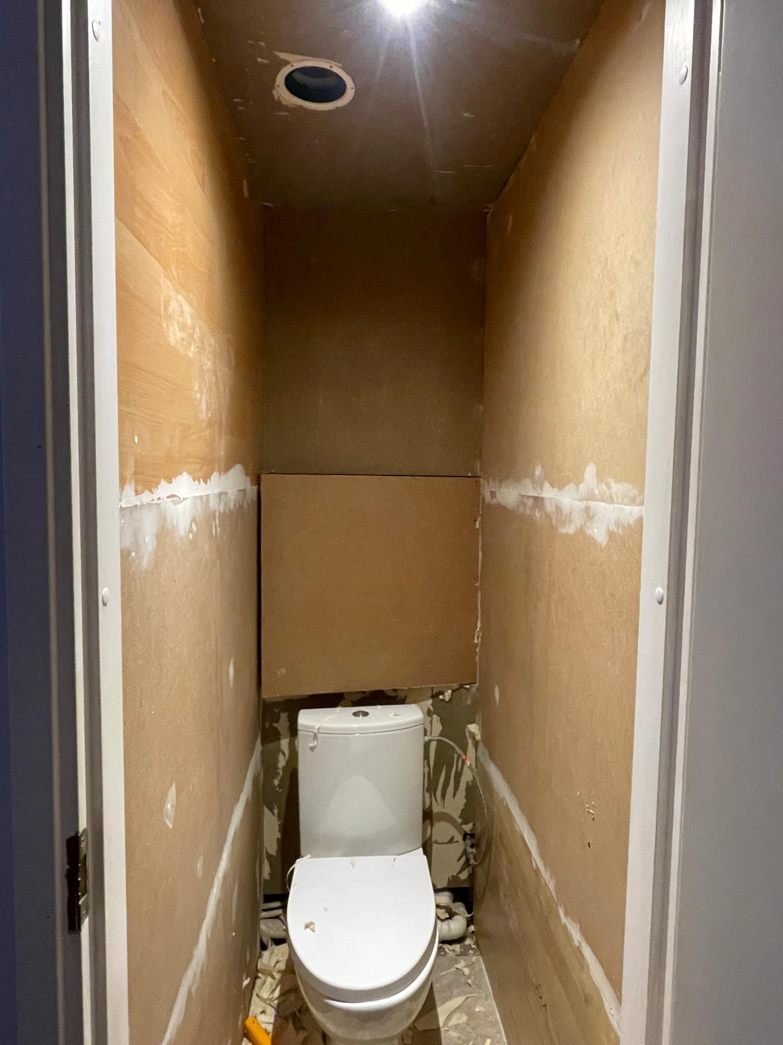 Tööd: külgmiste plaatide eemaldamine + 5,2 m2 osa krohvimine ja pahteldamine + tagaseina kipsplaat koos kipsiluugiga + lakke kipsplaat.
