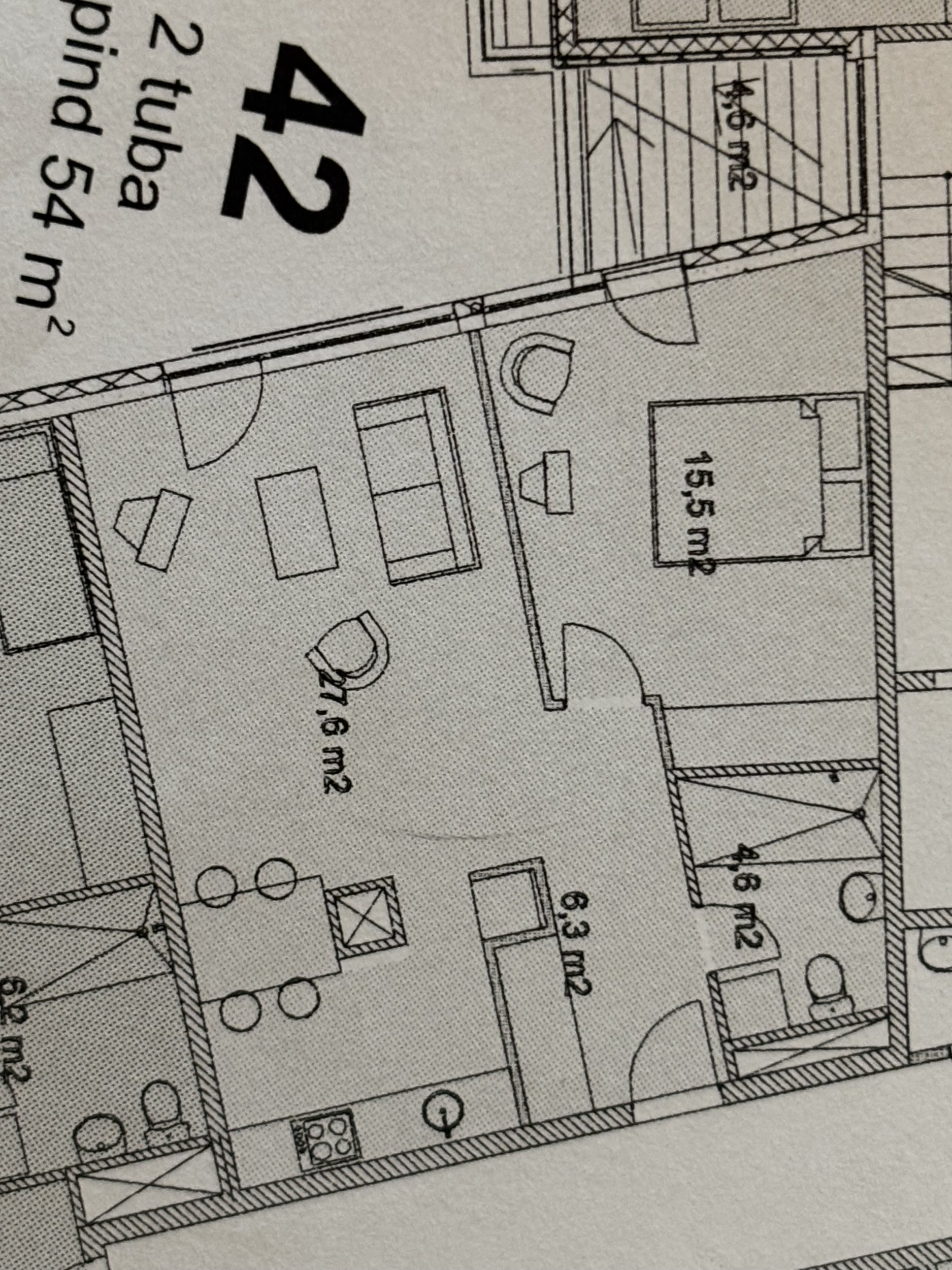 Toad, kus toimuvad tööd: 15.5 rm (magamistuba); 25.7 rm (elutuba-köök); 6.3 rm (esik).