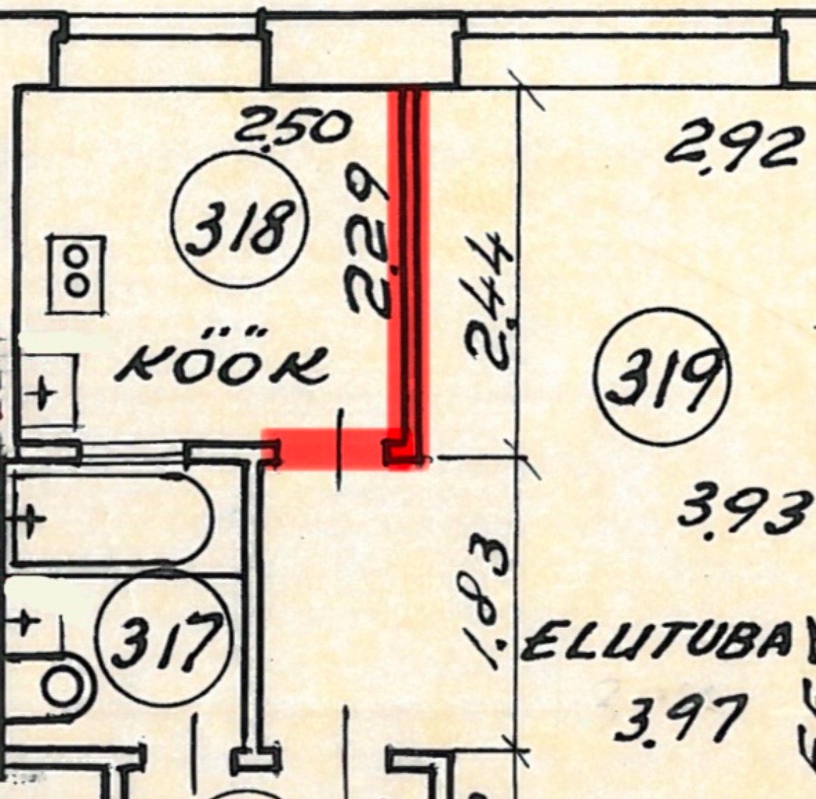 Köögi ja elutoa vahelise seina lammutus (pildil märgitud punasega). Seinas elektrikaabel.