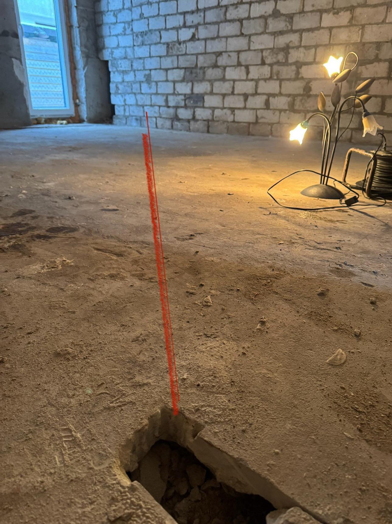 Lõhkuda põrandat, et oleksid vajalikud kalded olemas (pildil näidatud punasega uue kanalisatsioonitoru liikumise suund (seda on u 5m +-50cm).