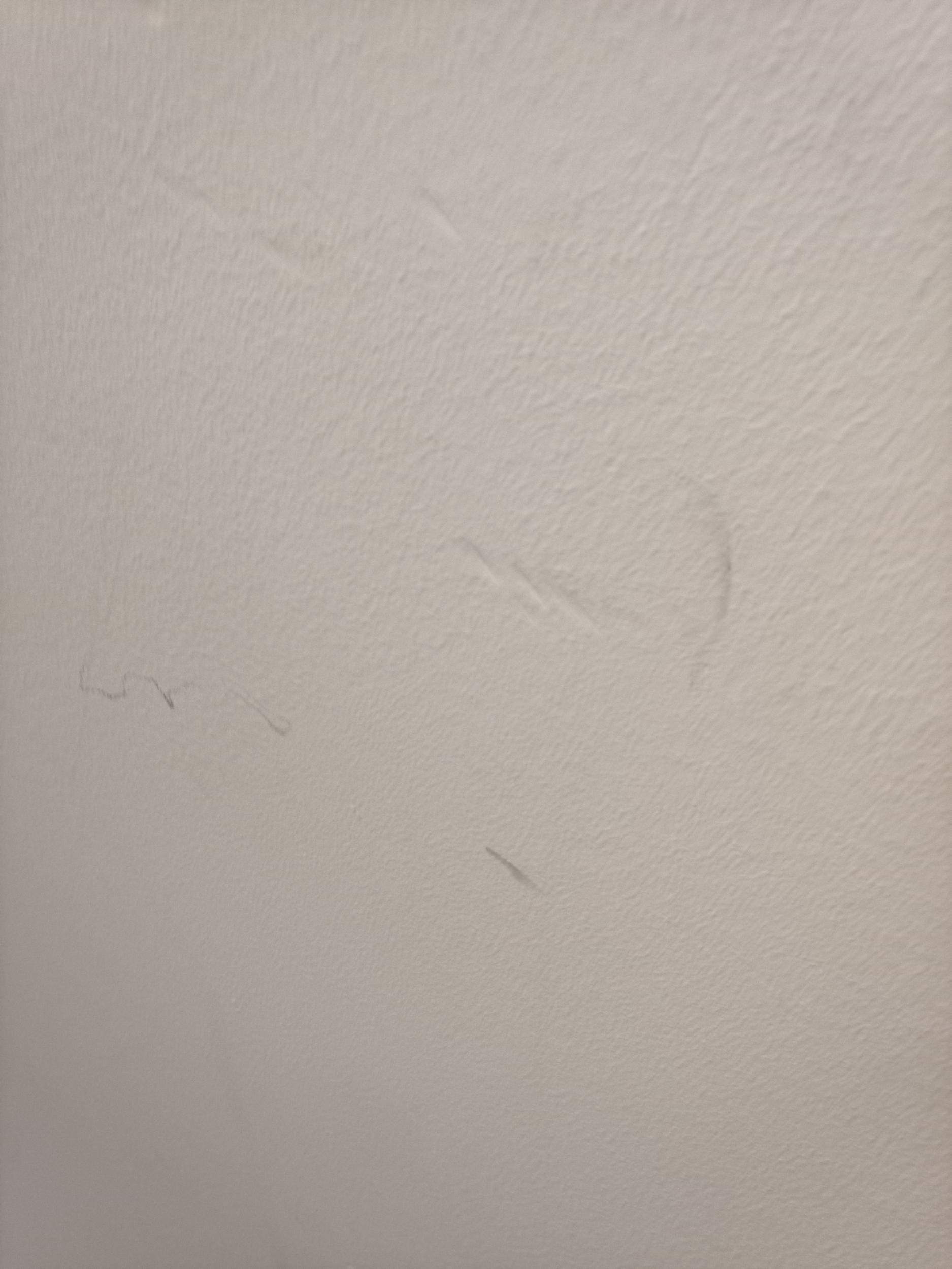 Seinal ühes kohas 3-4 väikest kriimu (näha piltidel), mis ei ole sügavad. Need oleks vaja esmalt pahtliga üle käia ning seejärel sein värvida.