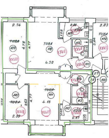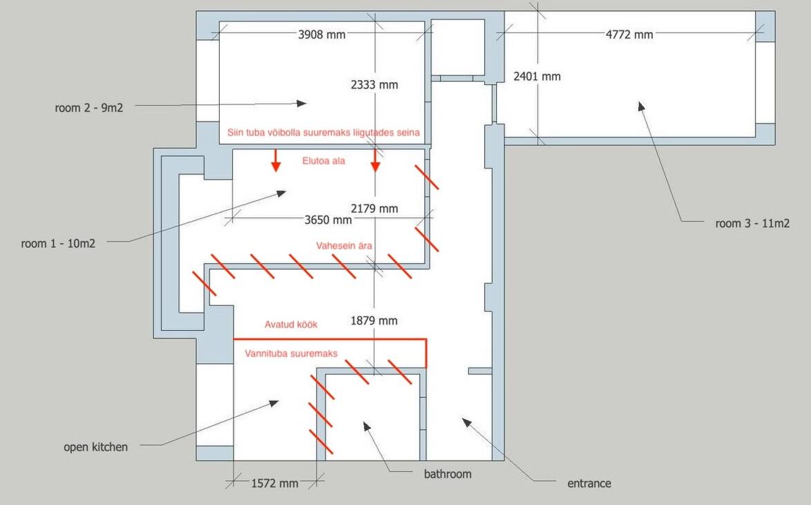 1) Korteri vaheseinte muutmine (sh vana projekti uueks tegemine) - Pilt plaan-uus.jpg näitab soovitud lahendust. Uuel projektil peab kõik vajalik ehitajale olemas olema. Pilt plaan-originaal.png on vana plaan koos võibolla vajaminevate detailidega. Originaalil kollane joon tähistab vaheseina, mille eelmine omanik oli teinud, kuid see tuleb eemaldada.