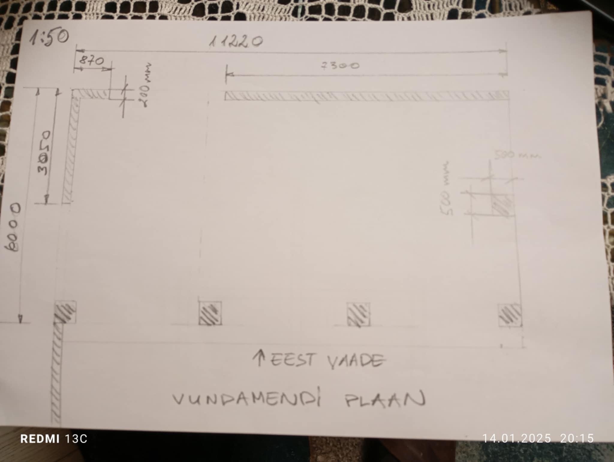 Vundamendil lisana on olemas püsti postide jaoks laotud tumbad 500x500x500mm/ 5 tk eest vaade vundamendi plaan)plaan manuses-