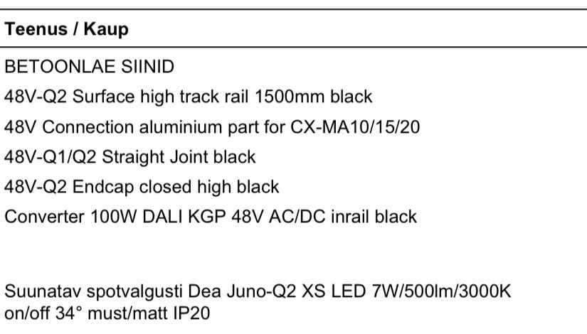 1) betoonlakke oleks vaja paigaldada Karizma siinivalgusti pikkusega 260cm koos Juno valgustitega (5tk). Kõik vajaminevad jubinad peaksid olemas olema (nimekiri näha pildilt)