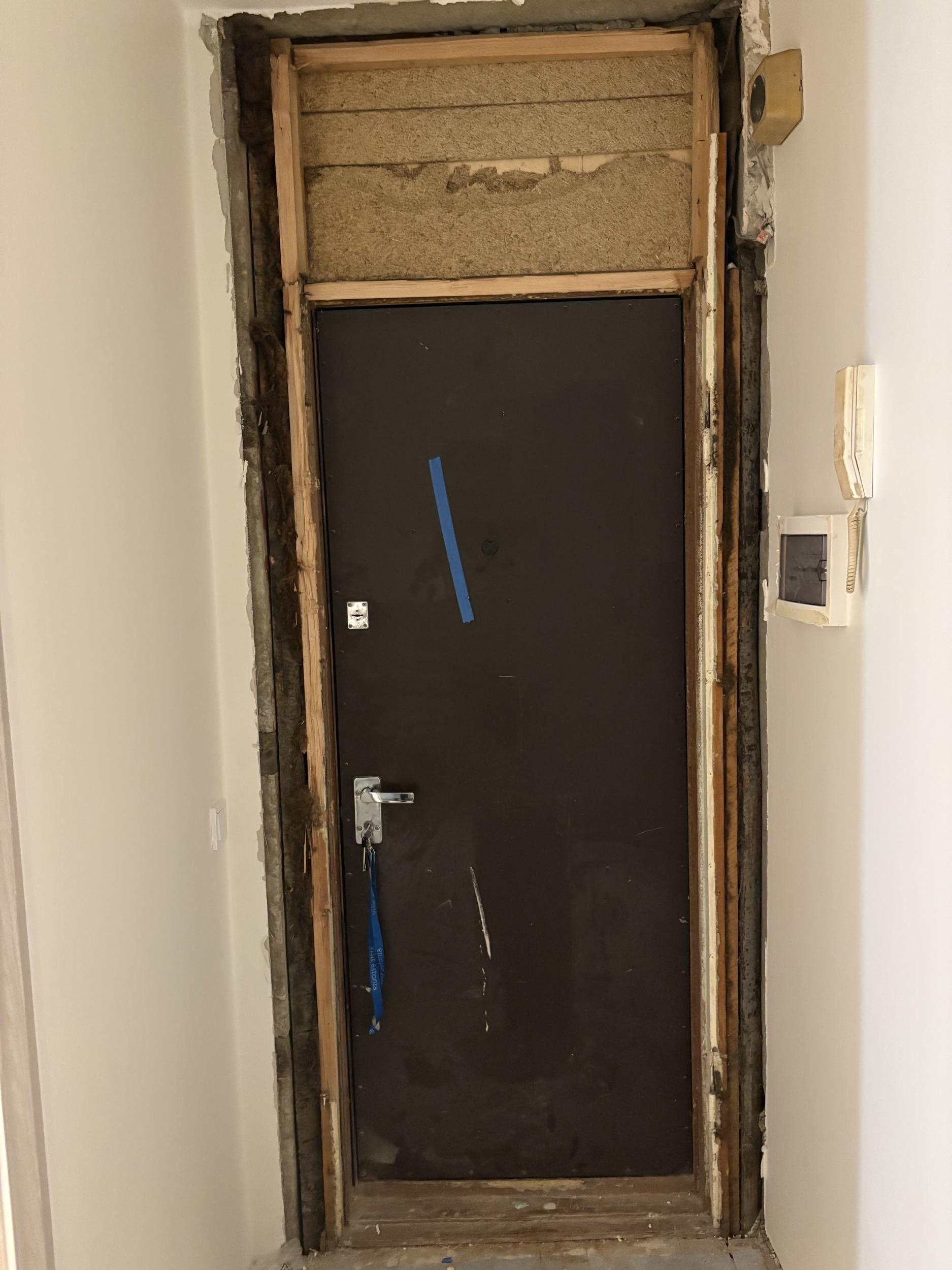 Hinna sees on vana ukse utiliseerimine uue ukse paigaldus ja uksepealse karkassi ehitus koos villaga täitmisega ja ettevalmistusega edasisteks värvitöödeks. Materjal on hinna sees.