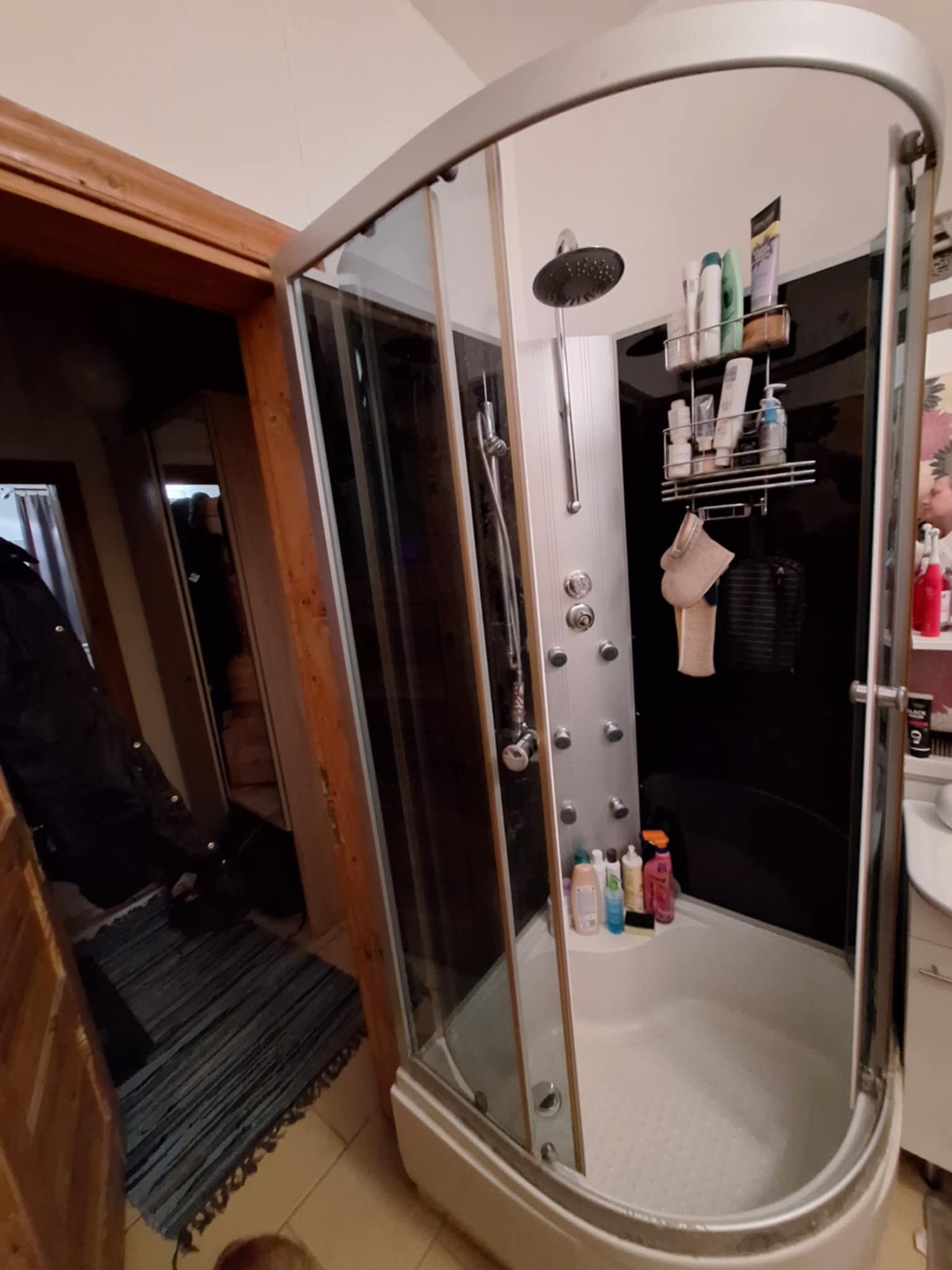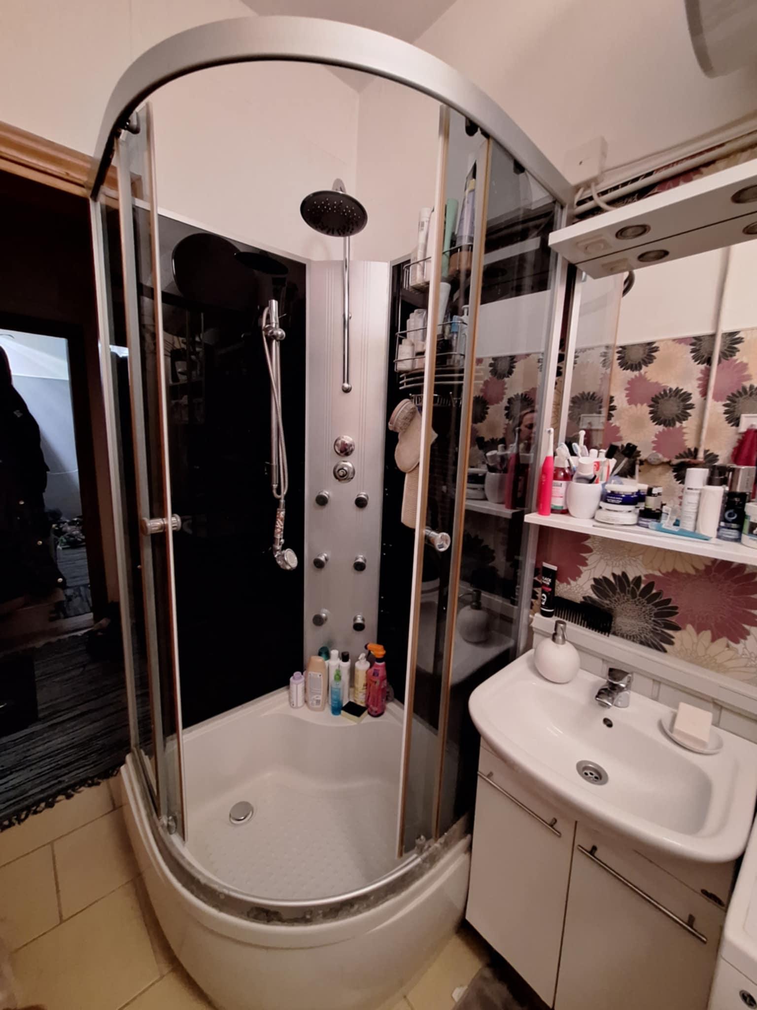 - paigaldada ristkülikukujuline duššikabiin koos alusega (ilmselt mõõtudega 70x90). Duššialus võiks olla võimalikult madala äärega. Kabiiniuks võiks olla sissepoole avaneva uksega