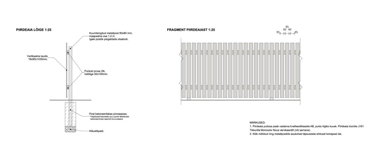 Metallpostidel vertikaalne puitlippaed, vastavalt hanke kirjeldusele. Aialipid ja horisontaalid on krunditud + 2x värvitud. Tsingitud ja pulbervärvitud postid on betoneeritud pinnasesse. Omame piirdeaedade ja väravate paigaldamisel igapäevaseid kogemusi üle 16a. Garantii vastavalt seadusele. Lisasoodustuse võimalus peale objektiga tutvumist. Vastame meeleldi tekkivatele küsimustele.