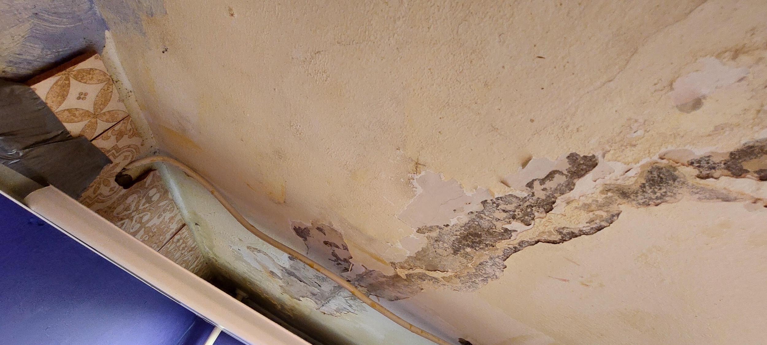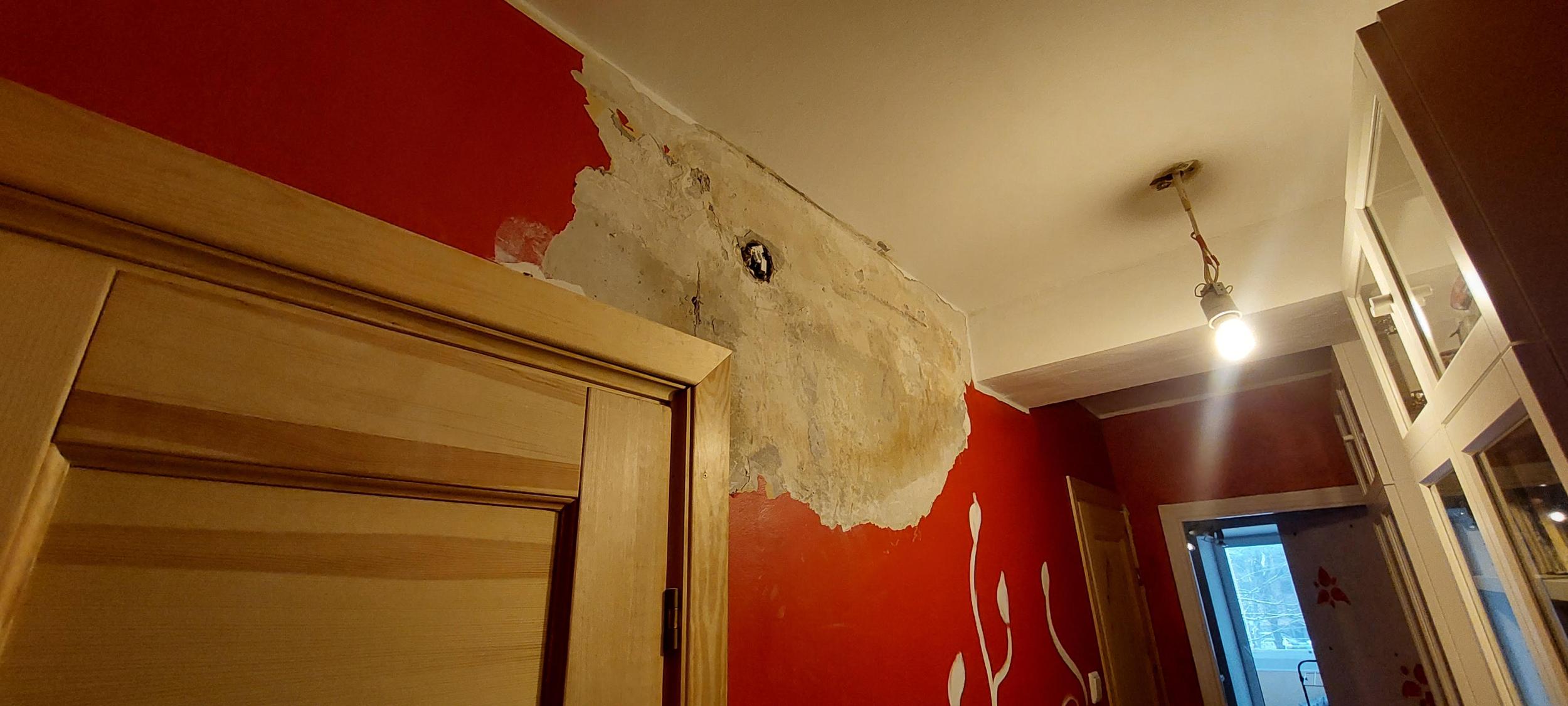 Ülemise naabri tekitatud niiskuskahjustus vannitoa laes ja kordidori seinal. Vajan niiskuskahjustuse korrektset likvideerimist (probbleemi allikas leitud ja kõrvaldatud, vannitoa ripplae korrektset kinnitamist (hetkel halli ducktape'iga ja silikooniga), vahekoridori seina pahteldamist.