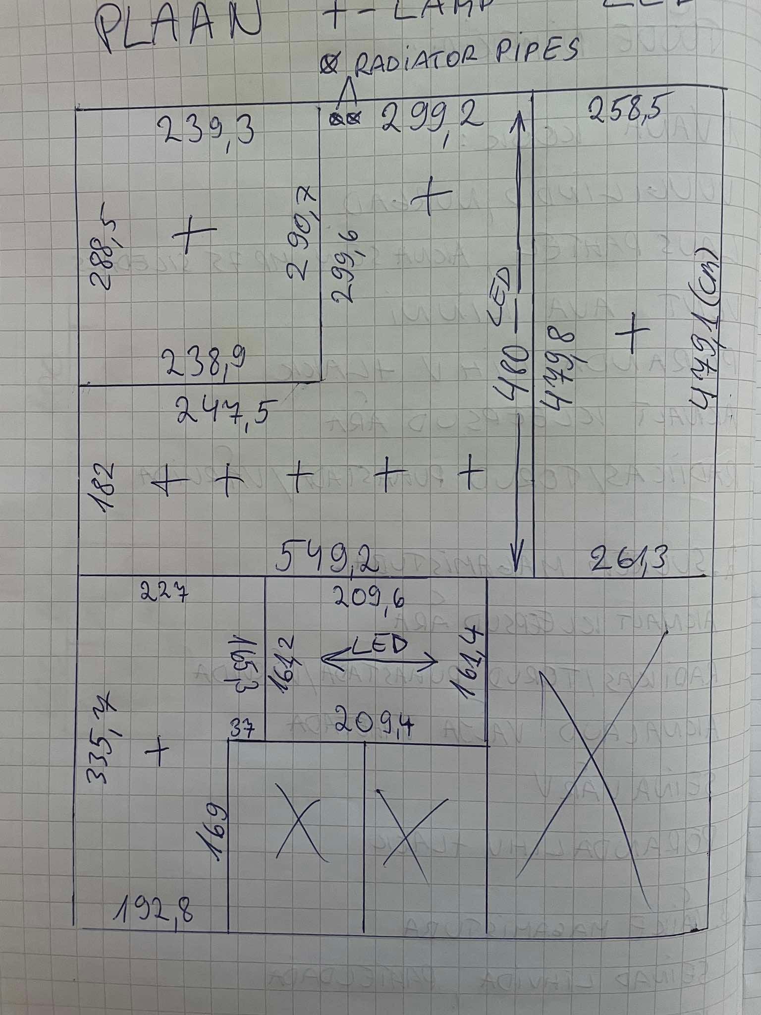Laed on ära mõõdetud laserkaugusmõõtjaga ja selle järgi on tehtud skeem. Ledid ja lampide asukohad on skeemil märgitud.