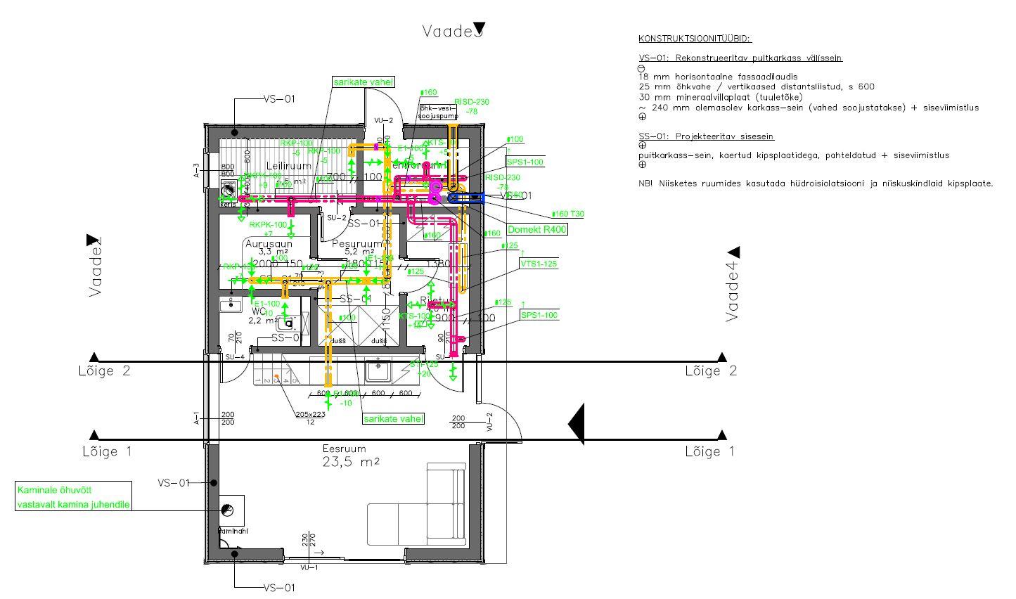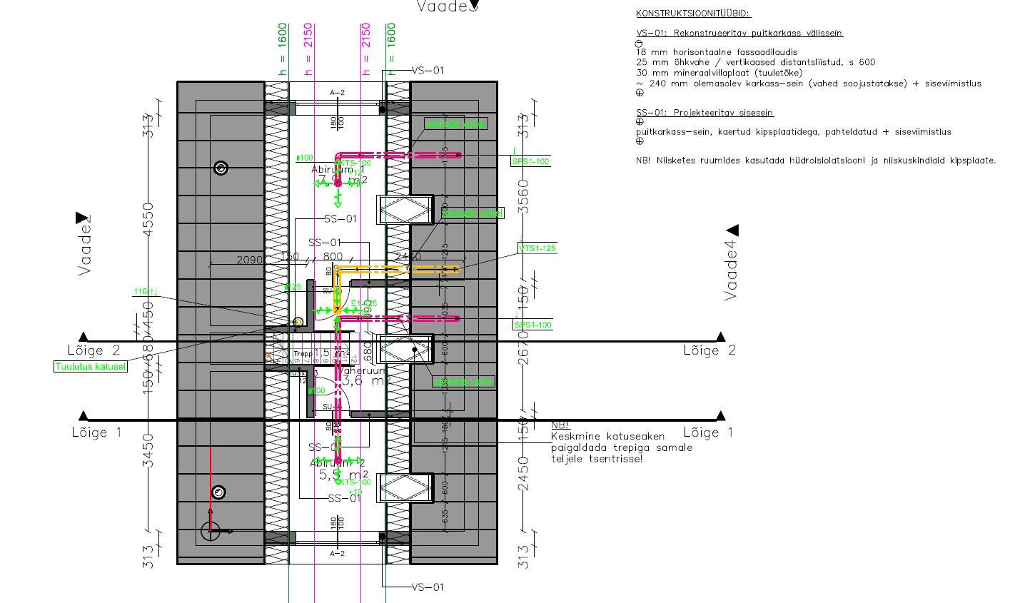 Enamus puitkarkassil kipsseinad ja torud laetalade all, 1 läbiviik 150mm fibost.
