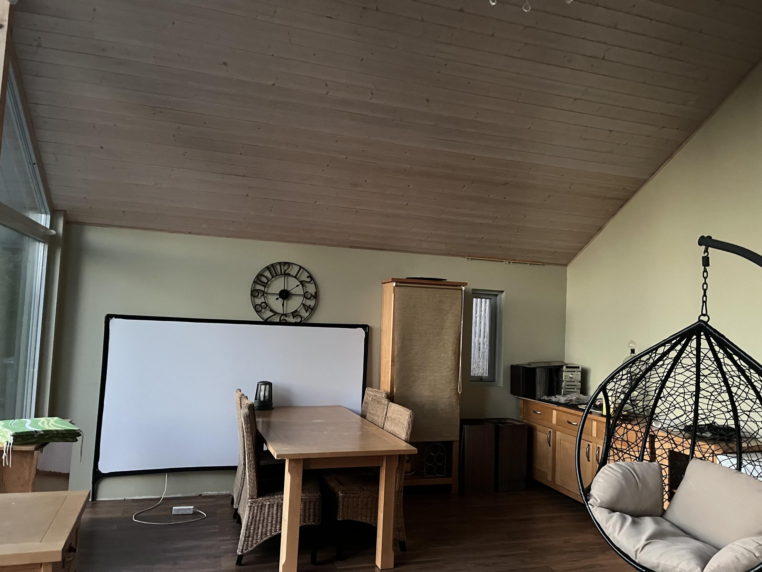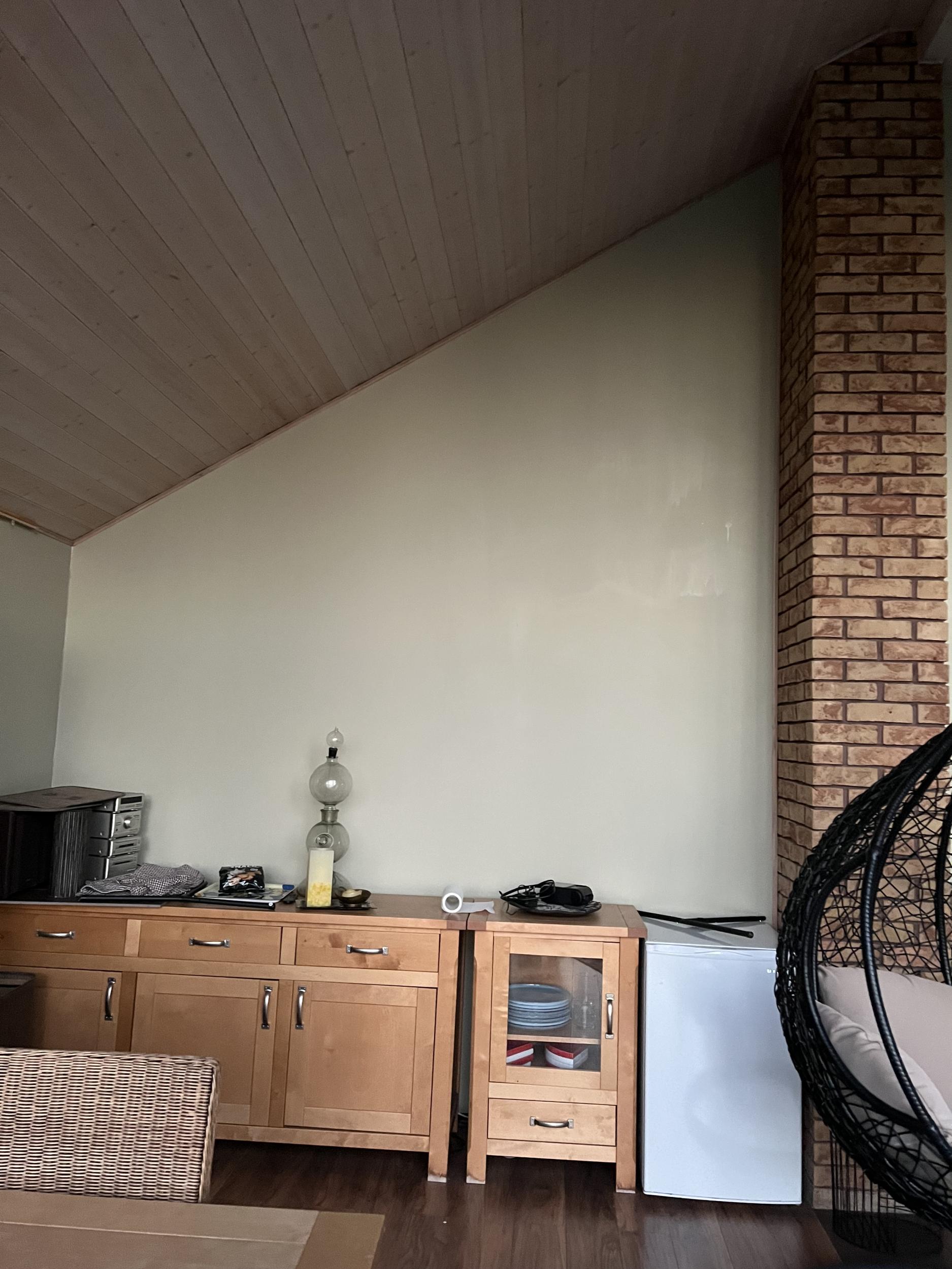 - Elutuba 35 m2, kolm seina (neljandas aknad) – u 45-50 m2 seinapinda. Varasemalt värvitud. Vaja teha väiksemad kohtparandused ning värvida 2 korda. Kahe seina kõrgus u 2,2m; kolmandal kõrgem koht u 5 m (kaldlagi)