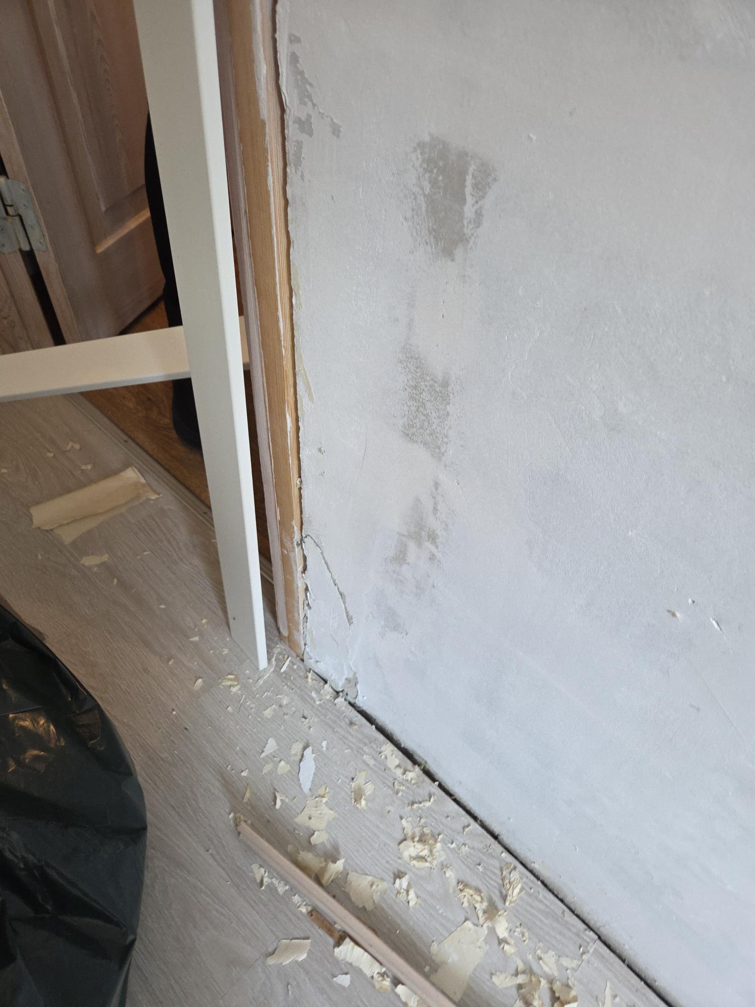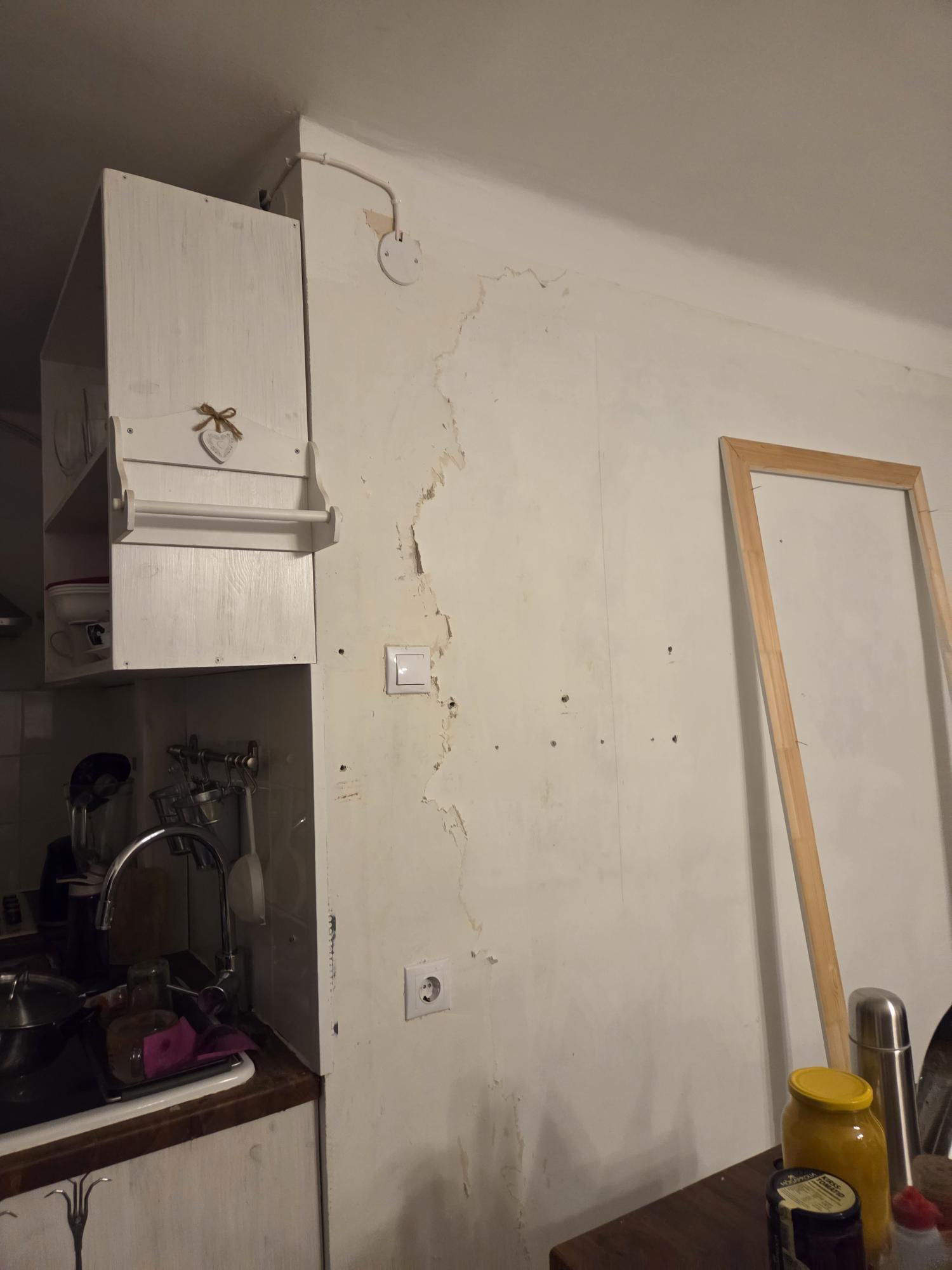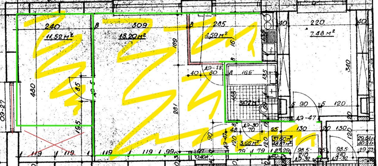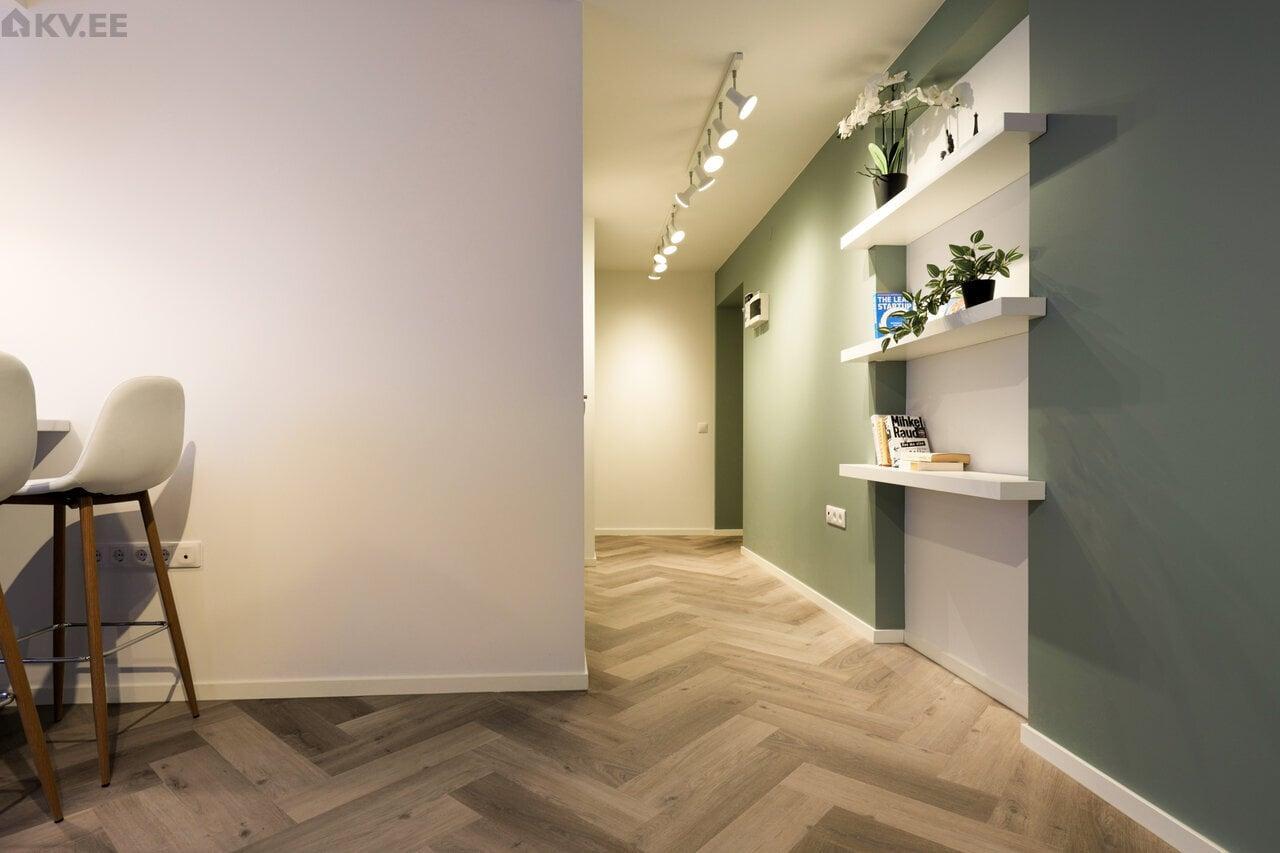 Roheline ala märgib värvitavat ja liistutatavat pinda, magamistoa aken on teise koha peal ja köögi siseseinu minu korteris ei ole. Vannitoa ja magamistoa ukse ümber on samuti tarvis liiste. Magamistoa uksele mõlemale poole. Tapeet on seintelt maha võetud. Seinad nõuavad pahteldustöösid, mõned nurgad korteris on päris koledad.