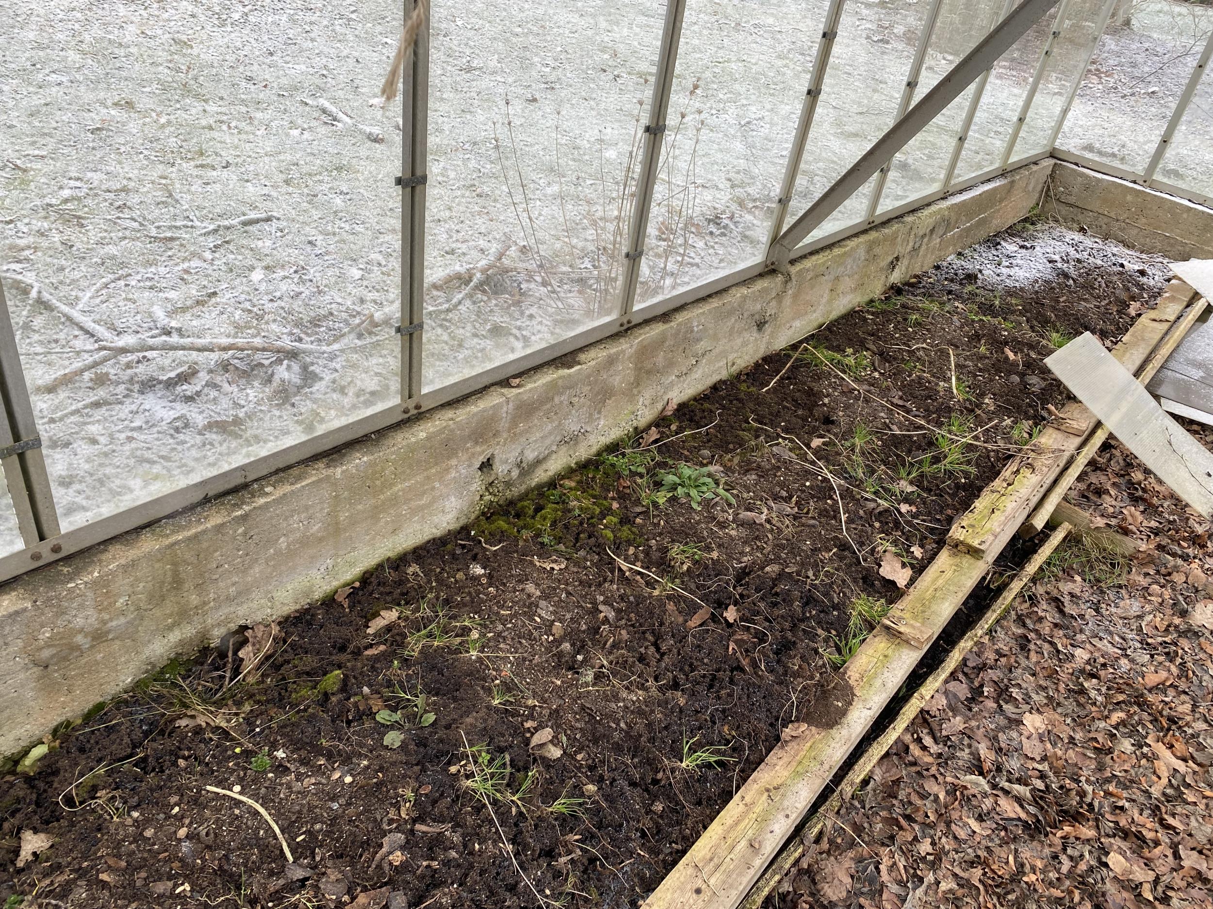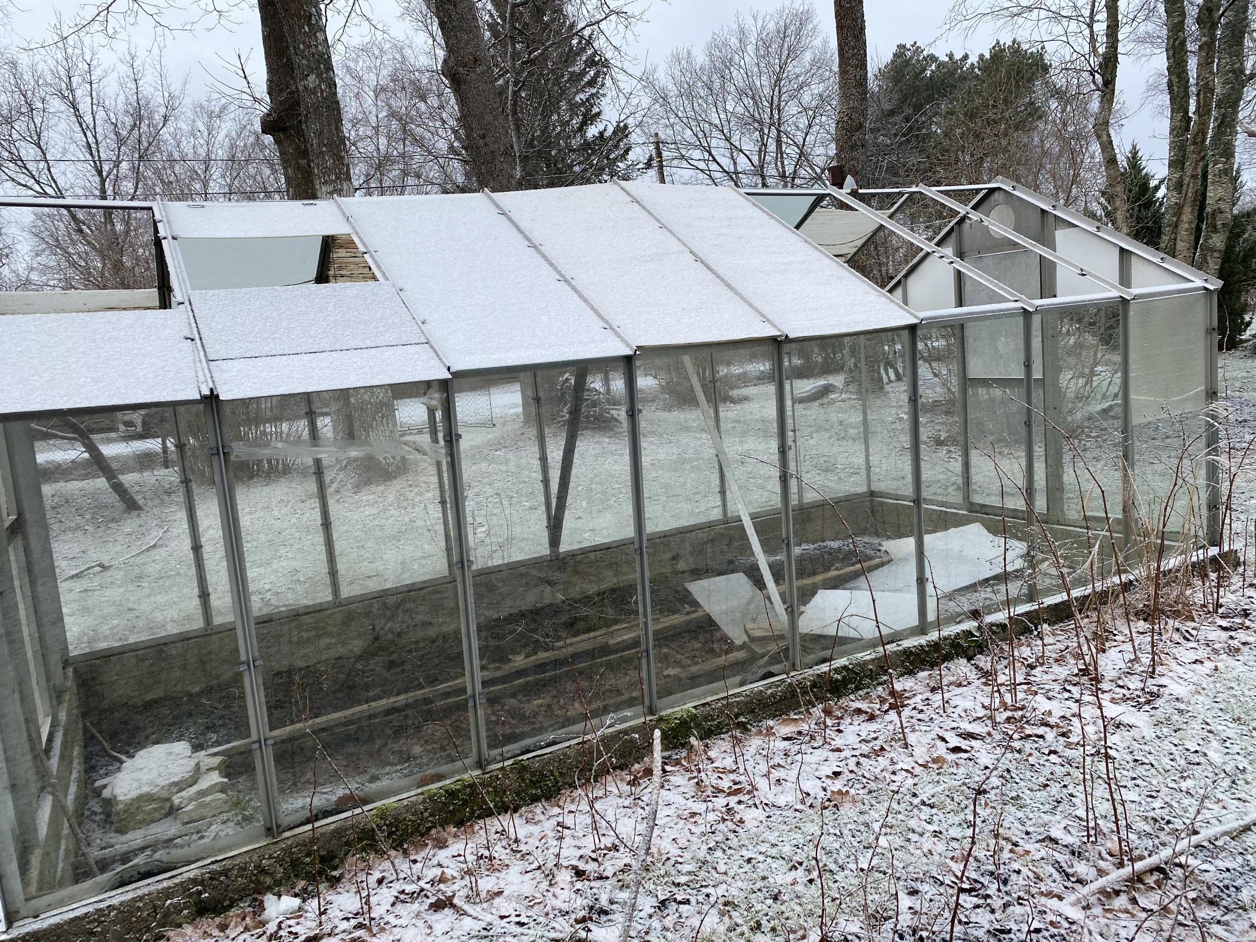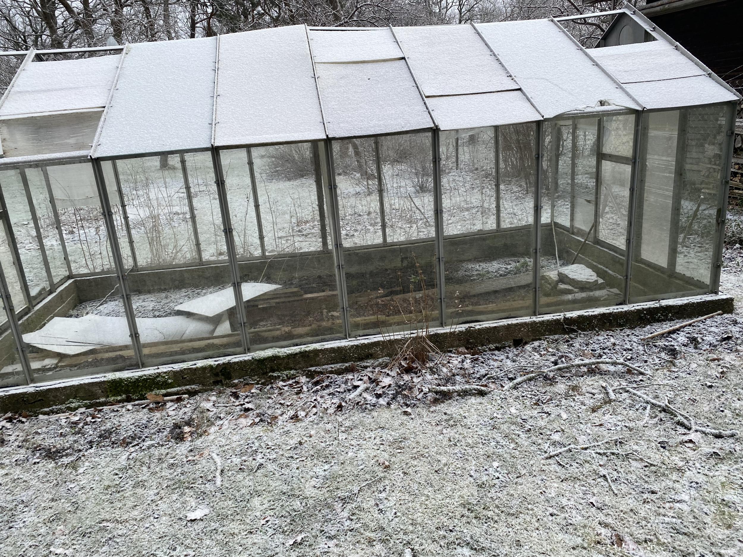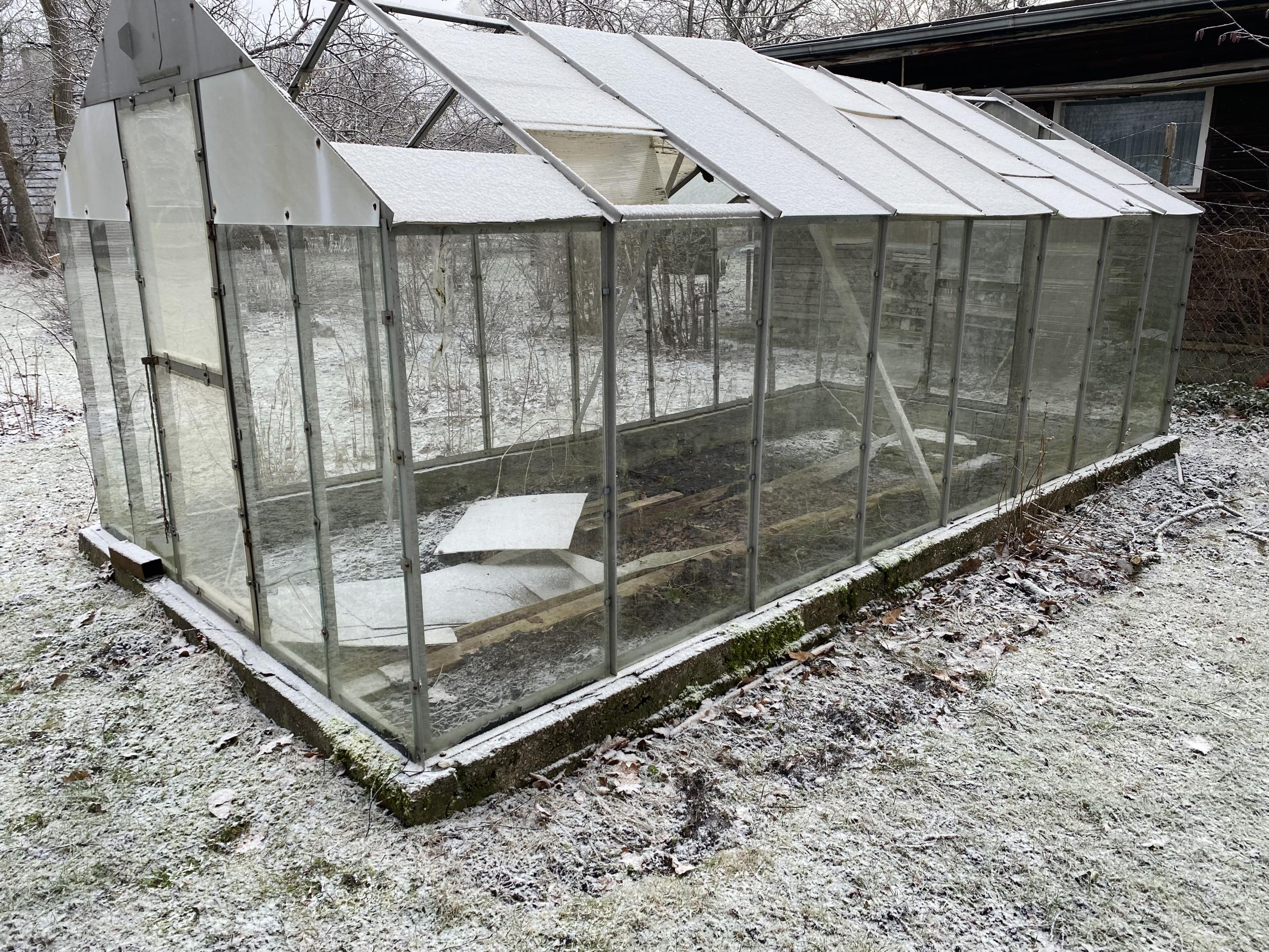 Väiksem kasvuhoone, metallkonstruktsioon, seinad klaasist, katust praktiliselt pole.
