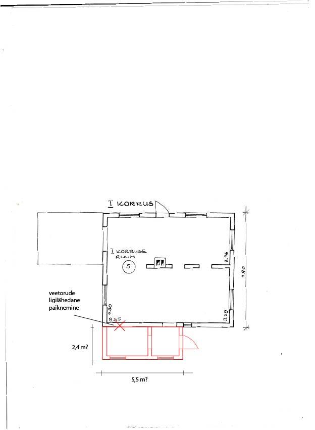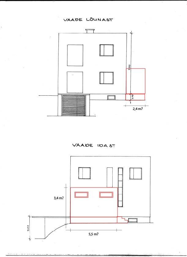 Juurdeehitise vajadus on tingitud WC ja vannitoa puudumisest. Joonistel punasega joonistatud ligikaudne idee ja mõõdud. Ligikaudne pindala 13 m2. (Võib vajadusel mõõtmeid muuta kuid peab jääma alla 20 m2. ) Juurdeehitisel võiks olla vahe sein. Lisada välisuks, trepp, ja kaks väikest akent. Maja ise ehitatud tuhaplokkidest ja vundament betoonist (materjal võiks olla sarnane, nt fiboplokk vms). Kuna teisele korrusele on planeeritud rõdu, siis katus võiks olla tasapinnaline, kuid rõdu piirded jms pole praegusel hetkel vajalik. Soovime hinda ilma siseviimistluseta.
