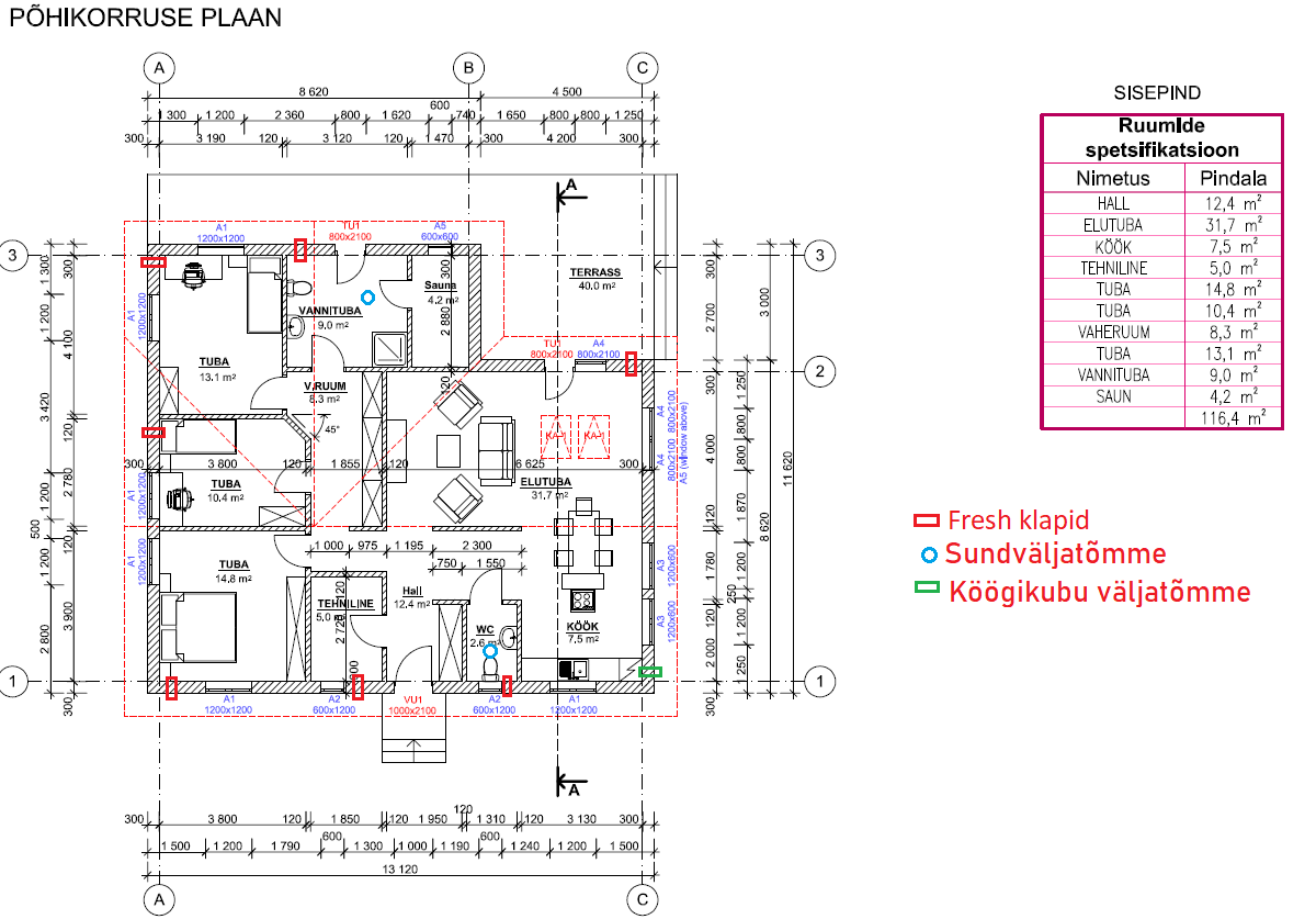 Hetkel majas ventilatsioon loomulik läbi fresh klappide. Soov asendada see tsentraalse soojustagastusega ventilatsiooniga. Maja on valmis ja vahelae peal on puistevill. Joonisel toodud hetke sundväljatõmbed ja fresh klapid.