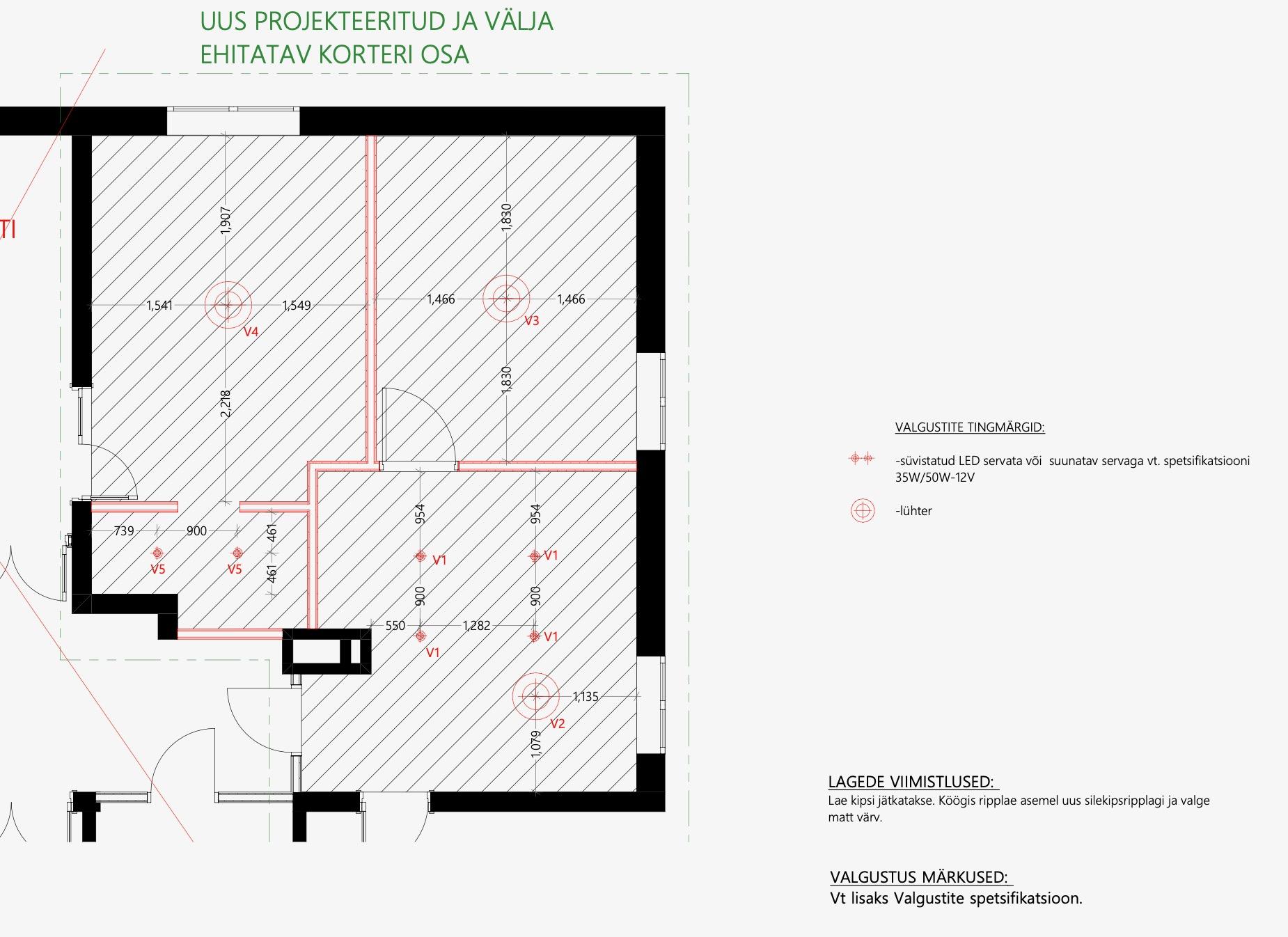 * Elektriühendused, lülitid, valgustid vastavalt joonisele välja ehitada või ümber tõsta