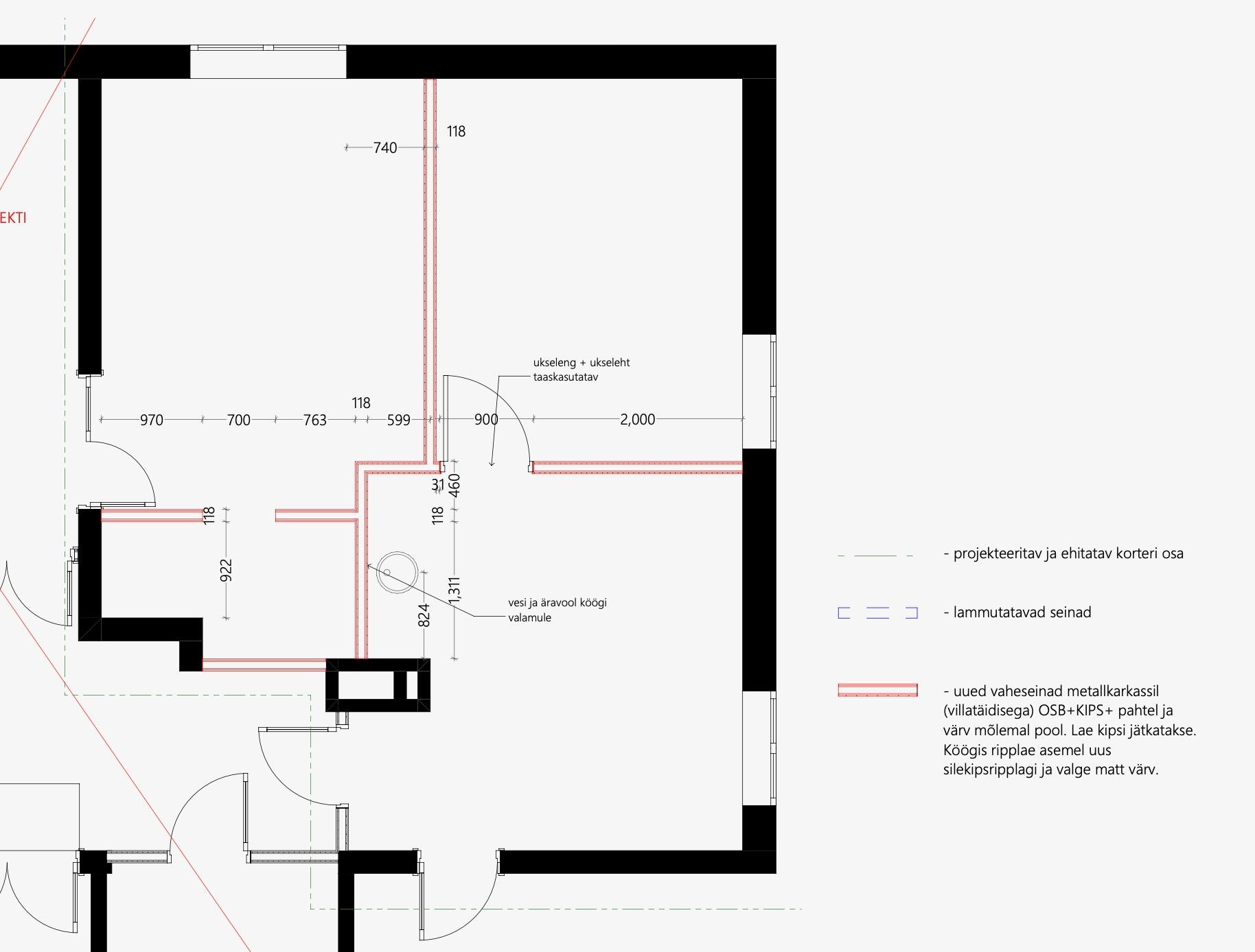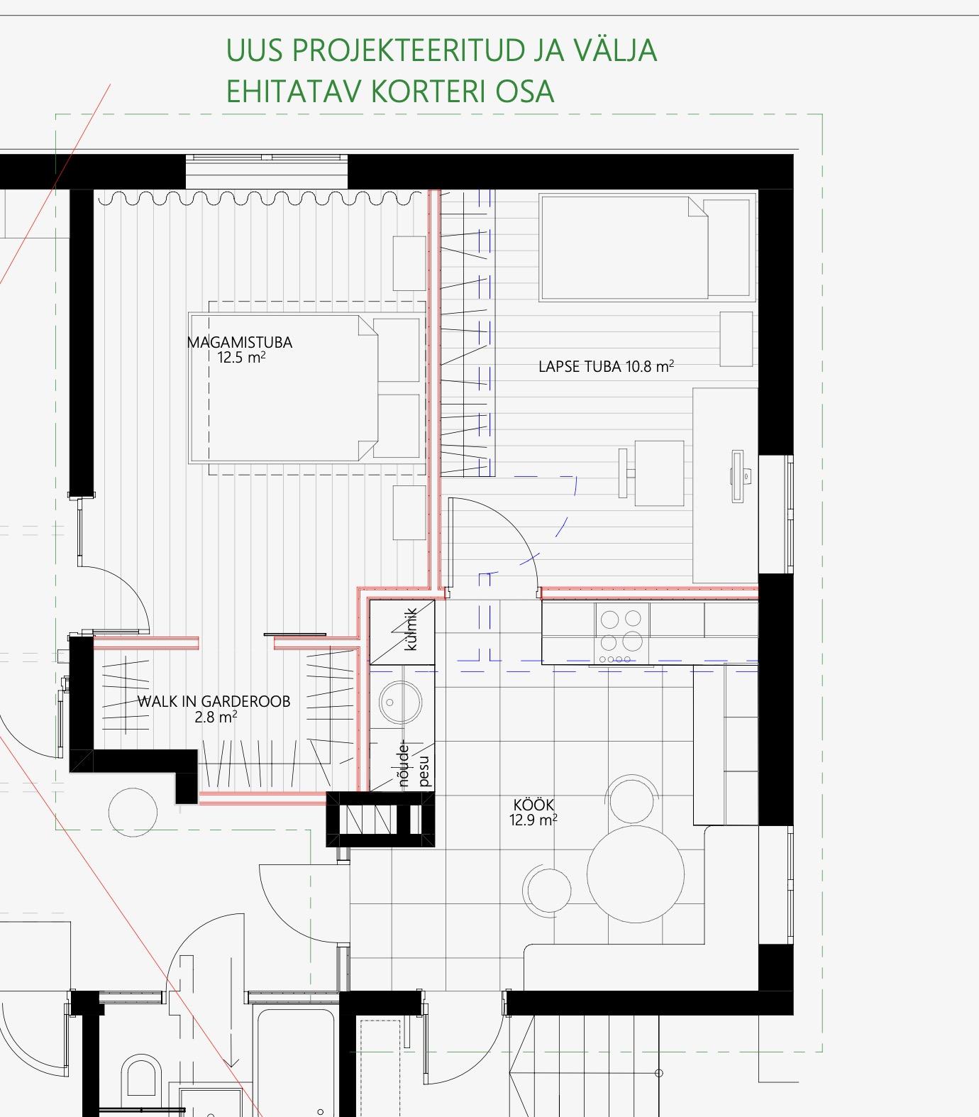 Korter asub esimesel korrusel. Joonisel on ehitatavad, uued seinad märgitud punasega ja lammutatavad seinad märgitud sinise katkendjoonega.