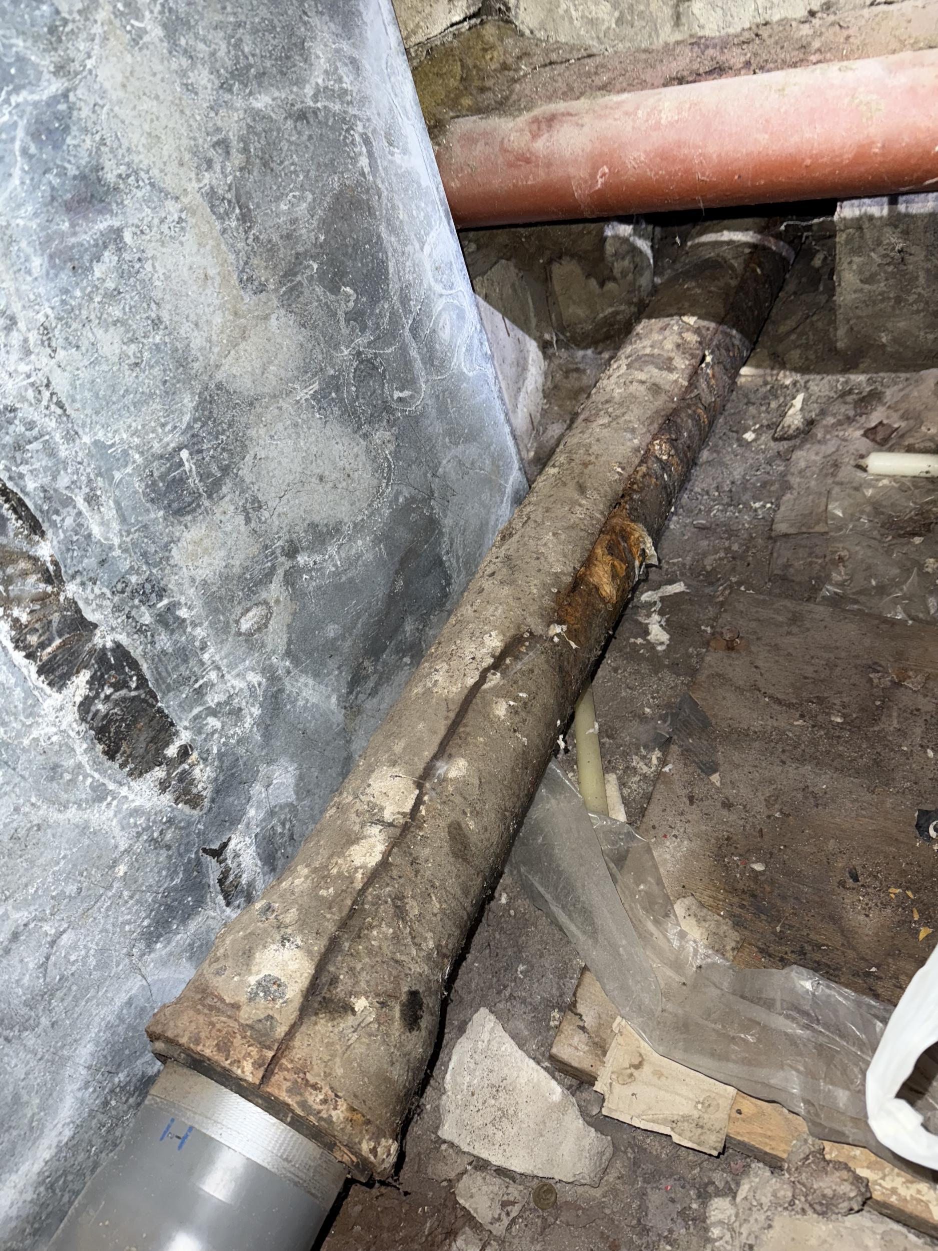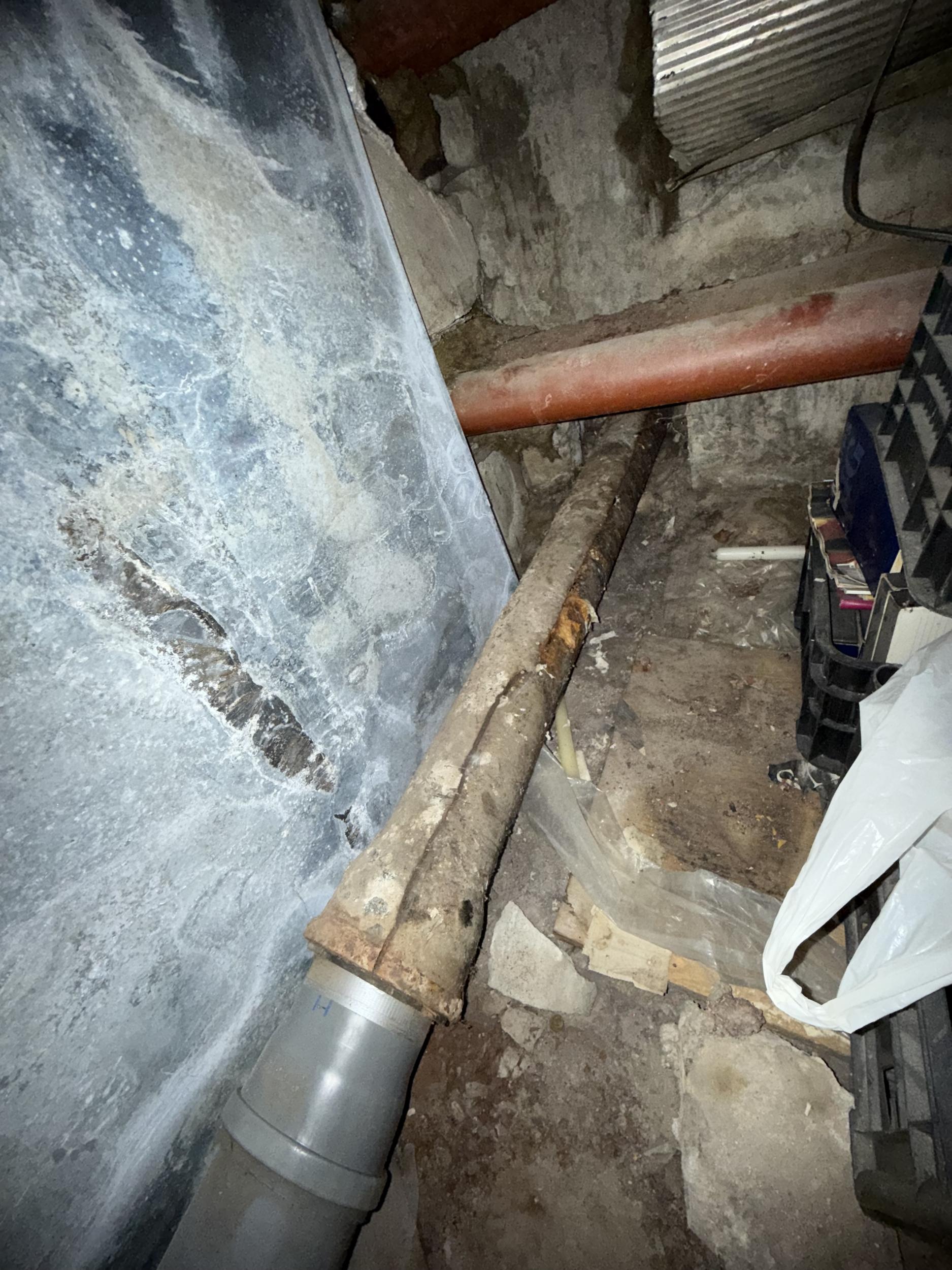 Püstiku lõppäravoolu toru osaliselt purunenud. Asukoht keldris.