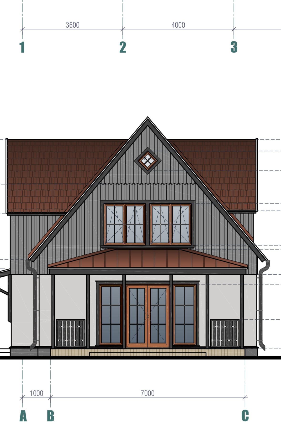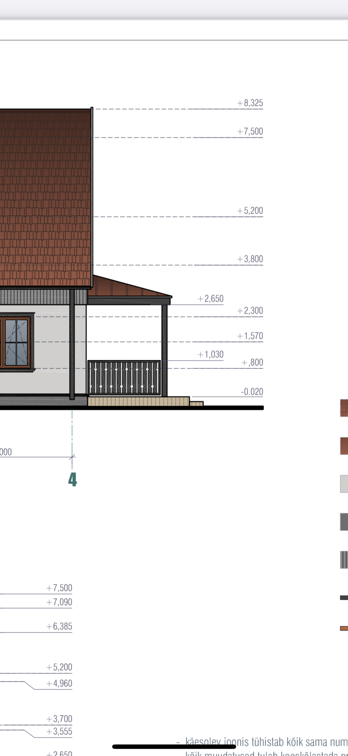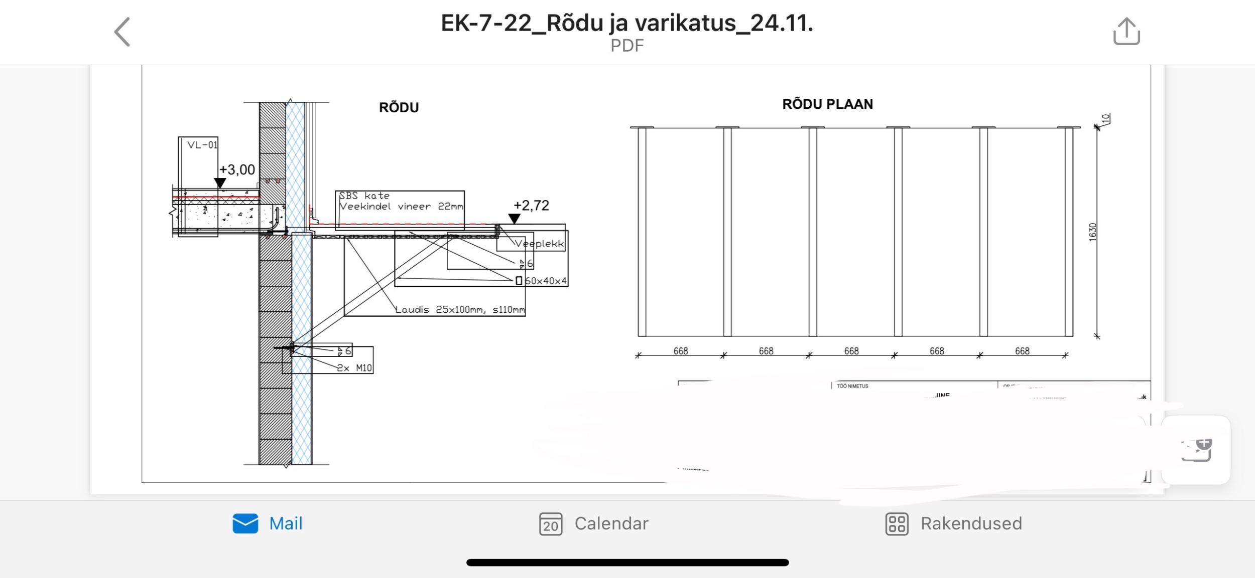 Rõdu: tugipostid on seinas, tuleb ehitada rõdupõrand ja piire vastavalt joonistele. Materjalid: immutatud puittala 95x195mm, immutatud terrassilaud 26x118mm, veekindel vineer, laudis, veeplekid rõduservale ja rõduuksele.