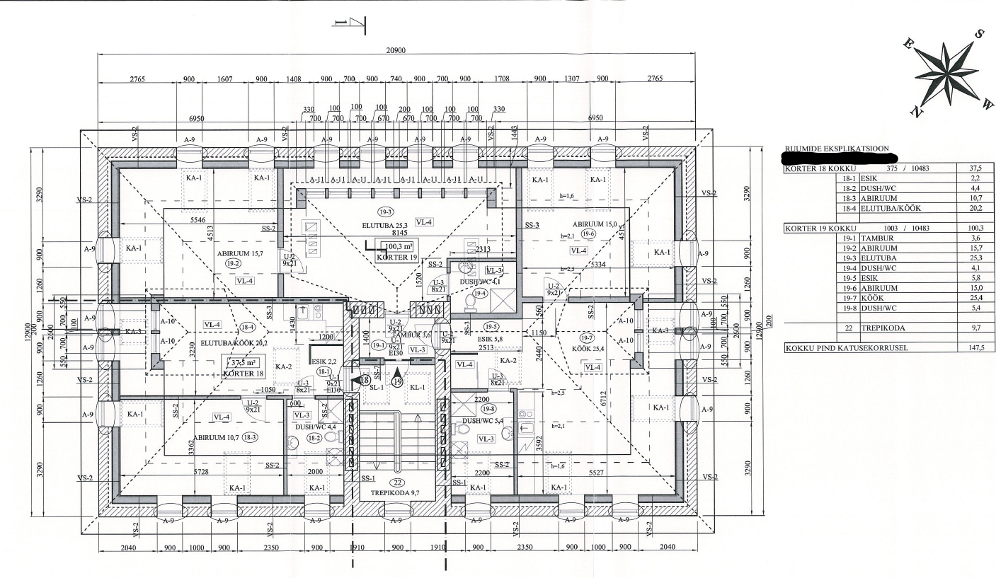 Õigulikul alusel on arendaja poolt 2015 a. ümberehitanud Tallinnas asuv kortermaja, millega on korterid rajatud katusekorrusele. Katusekorruse plaanil kajastuv Korter 19 on registreeritud kaasomandina. Omanikud soovivad tänaseks kaasomandit ümbervormistada korteriomanditeks. Mõlemas korteris on plaani pealt mõõdetuna vähemalt 1 eluruum (elutuba) mis vastab ''eluruumidele esitavatele nõuetele'' ehk saaks korteriomandid moodustada 1 toaliste korteritena. Varasema projekti seinte spetsifikatsioonide põhjal selgub, et korterite vahel juba on tuletõkkesein (SS-03) ja reaaluses olemas ka korteritel tuletõkkeuksed. Vajalik koostada korteri 19 ümberehituse projekt, mis vastaks kõikidele projekteerimisele esitatud nõuetele (seadustik, määrused, standardid), mille alusel moodustada kaks eraldi korteriomandit.