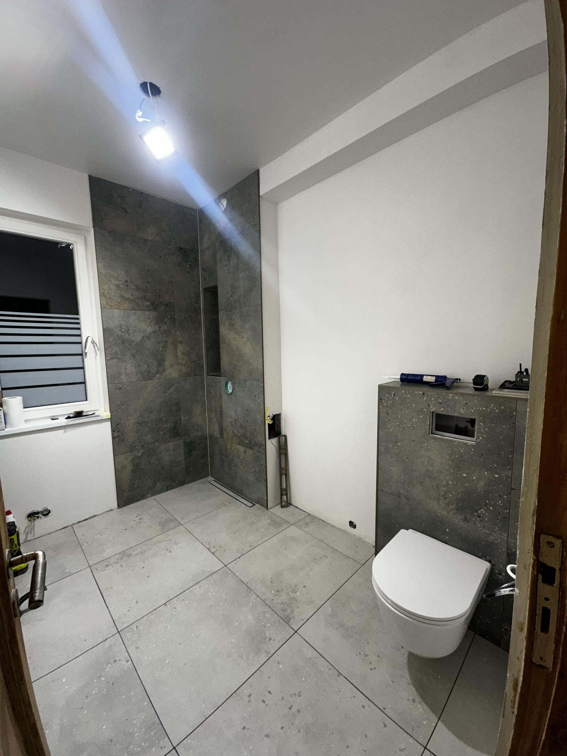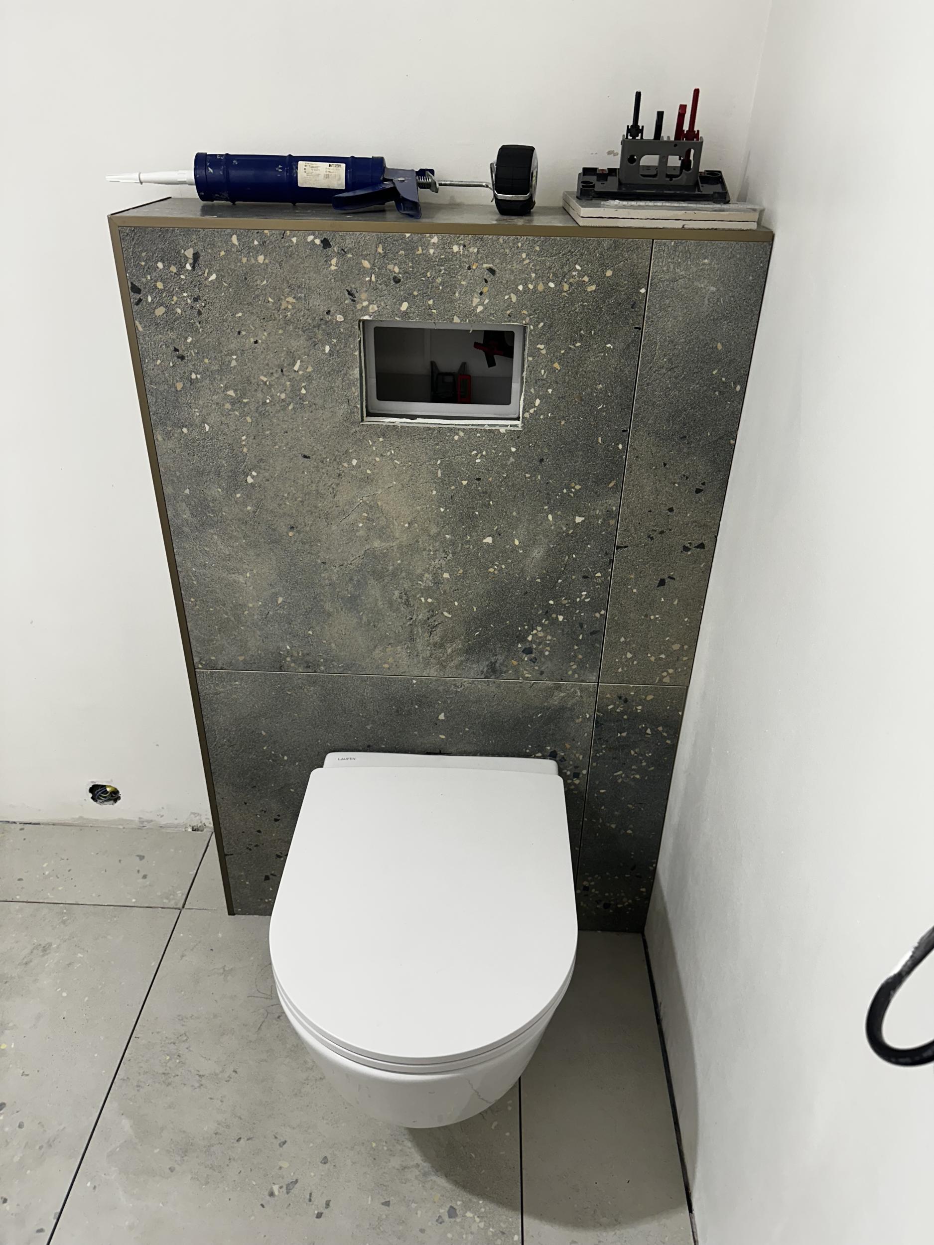 Vaja on paigaldada äsja plaaditud seinale tagasi seinapealne wc pott, paigaldada dushinurga segistisüsteem ja ühendada vannitoa kraanikausi vesi ja äravool.