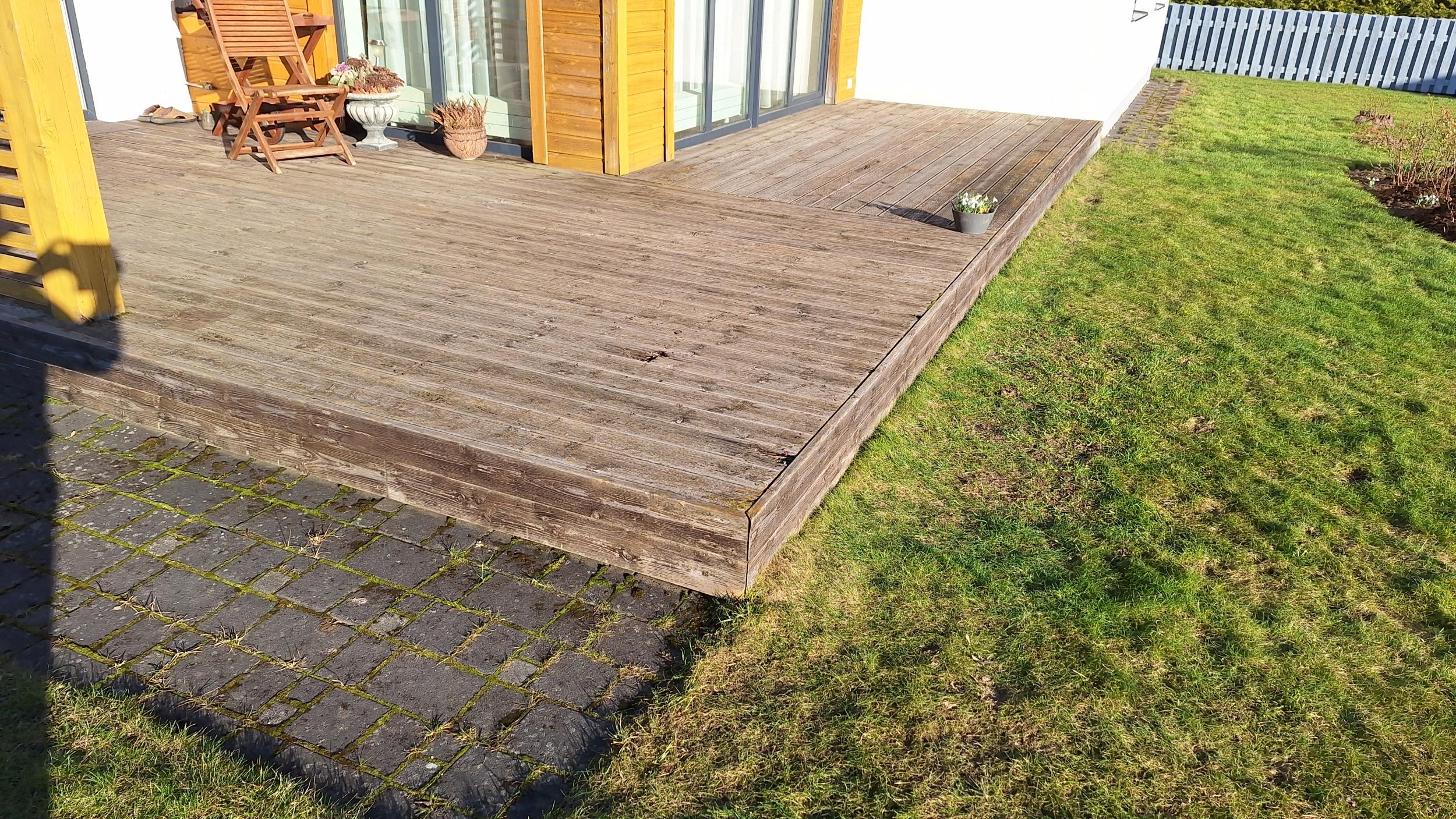 Töö sisuks on terrassi laudade ja prusside vahetus, saab kasutada vanu tugiposte. Terrass koosneb kahest L-kujuliselt paiknevast osast mõõtudega 230x450 ja 320x565 sentimeetrit. Materjalliks 5x15 immutatud prussid 2.3m 9tk, 3.2m 10tk, 5,7m 2tk ja 4,5m 2tk. Terrassiauad 5,8m 28tk, 4,5m 20tk, 3,3m 2tk. Terrassilauad immutatud, rihveldatud pool alla, võib pakkuda erinevaid puuliike (naturaalset).