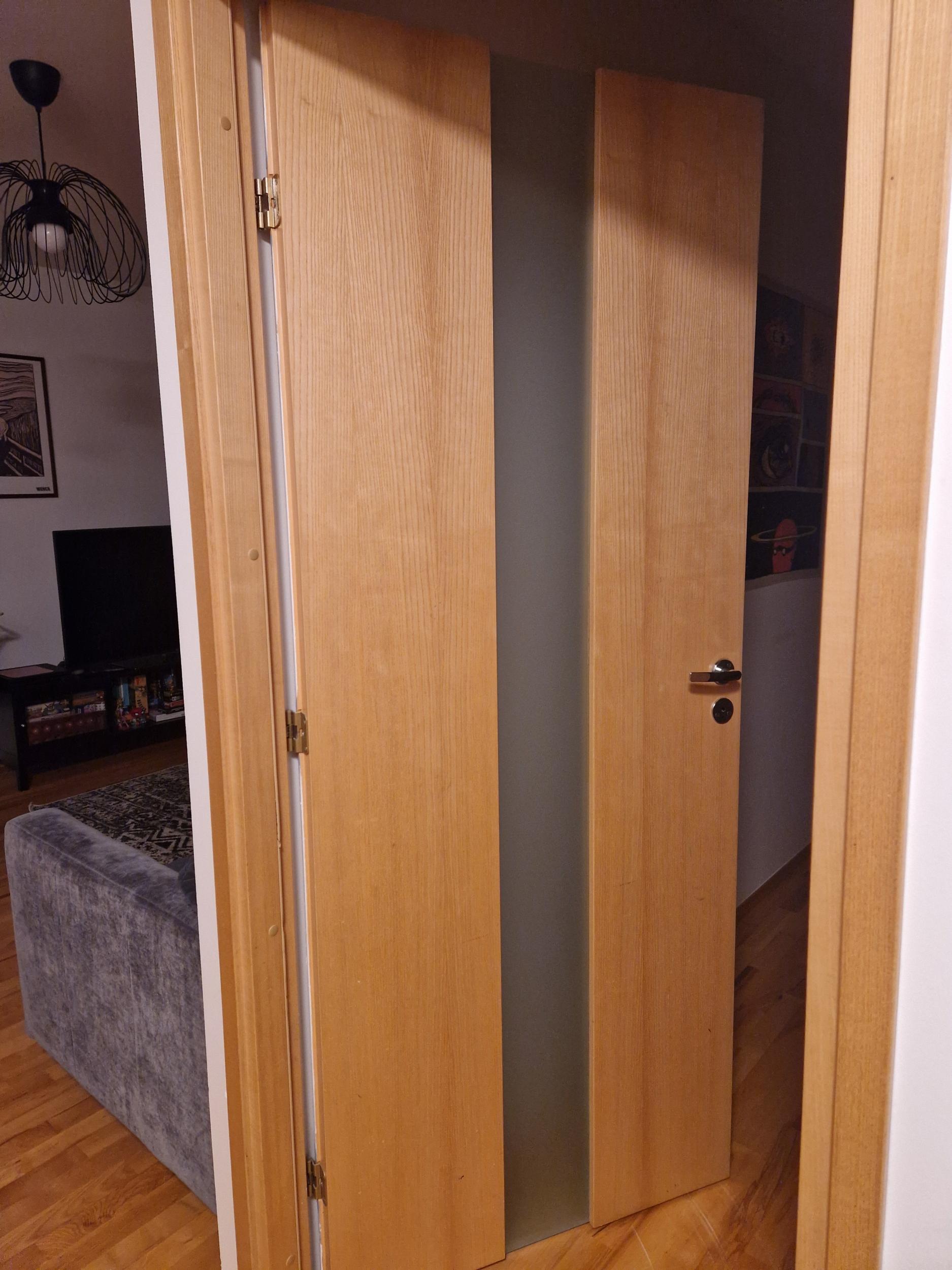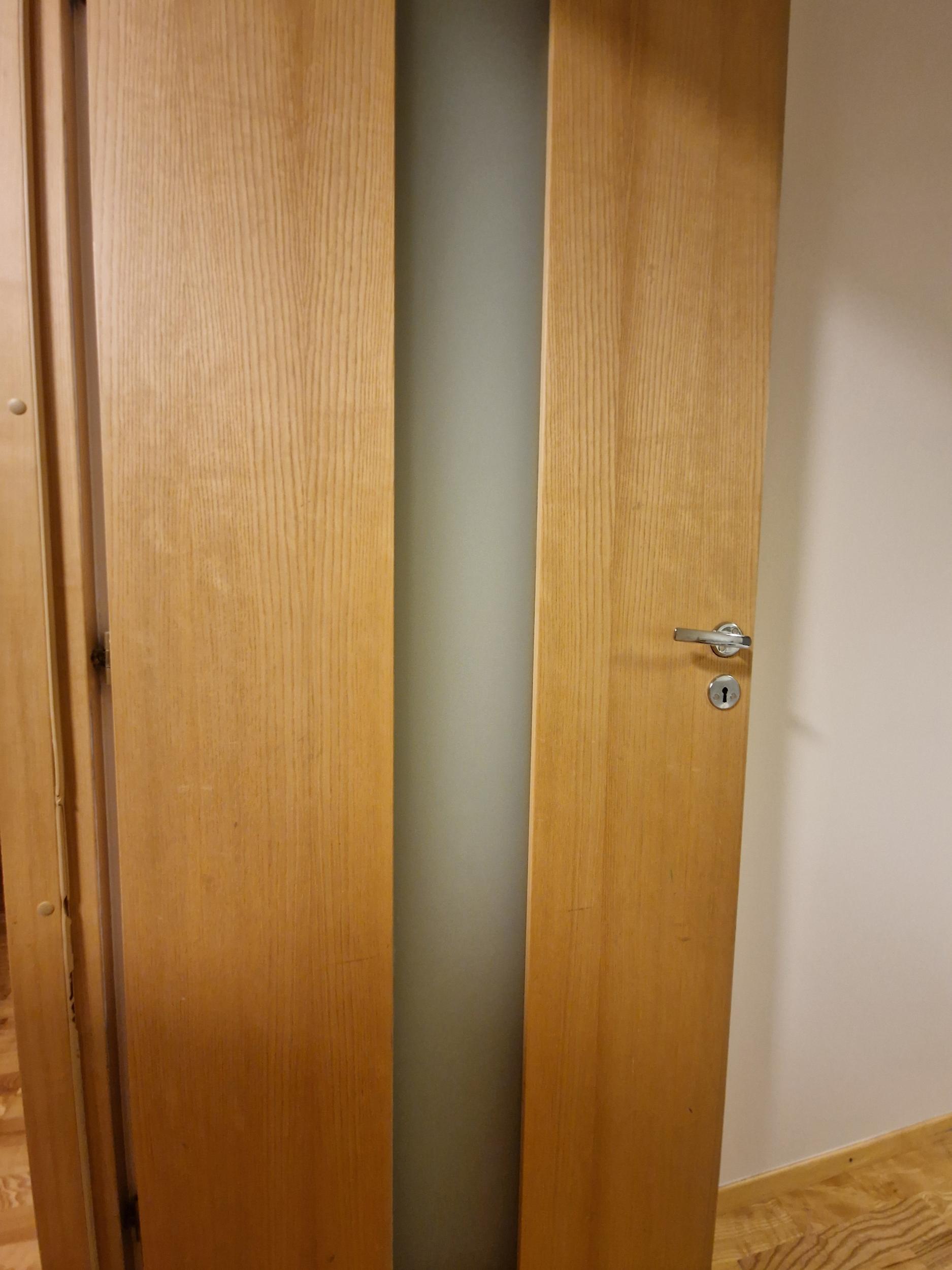 Tegemist on siseuksega, kus kahe paneeli vahele on pandud mattklaas. Paneelid on nihkunud ning üks paneelidest kriibib vastu põrandat.