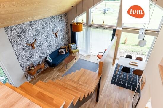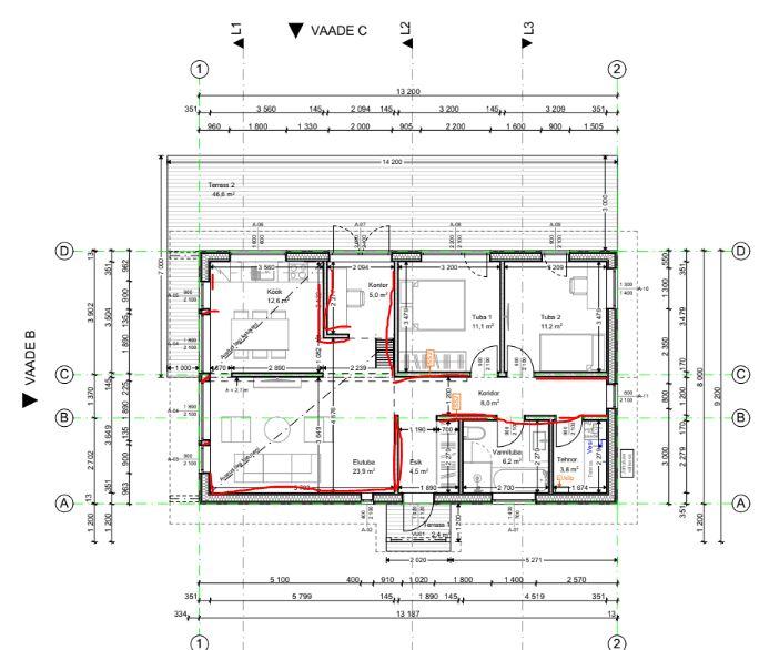 2021.a valminud elementmaja 90m2, kus on seinad krohvitud ja tehtud teatud mahus siseviimistlust. Vaja on kvaliteetsemat tööd. Elutoa ja koridori siseviimistlus ja olemasoleva L-kujulise trepi ümbertõstmine. Siseviimistlusel on vajalik seinte (joonisel punasega märgitud) lihvimine, pahteldus ja värvimine. Seina pindalad ca 100 m2. Akente ja uste ääred vajavad teipimist.