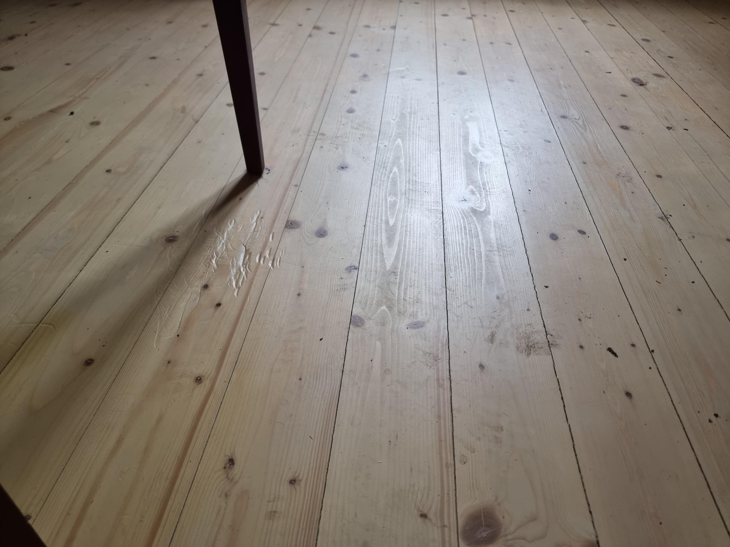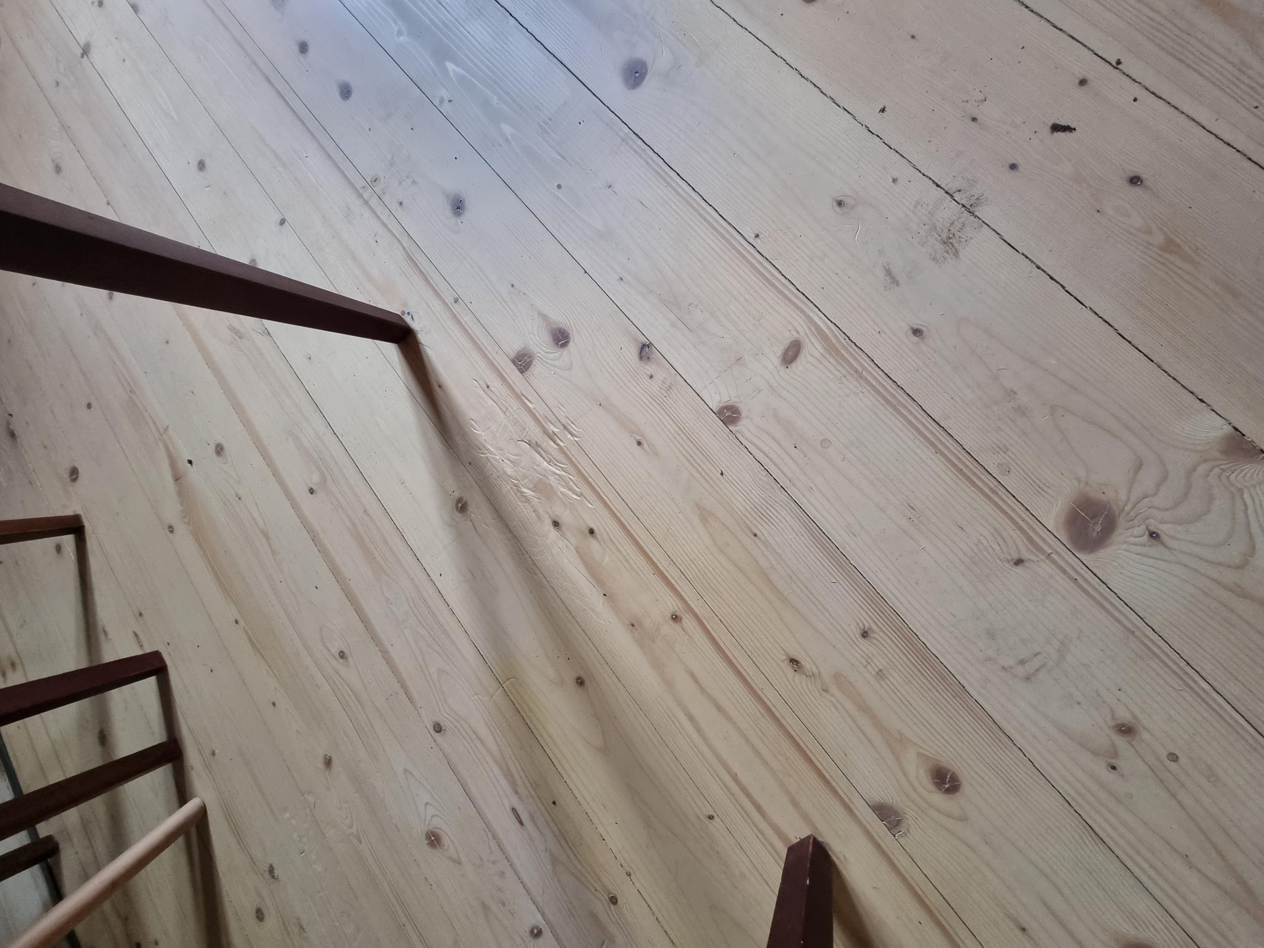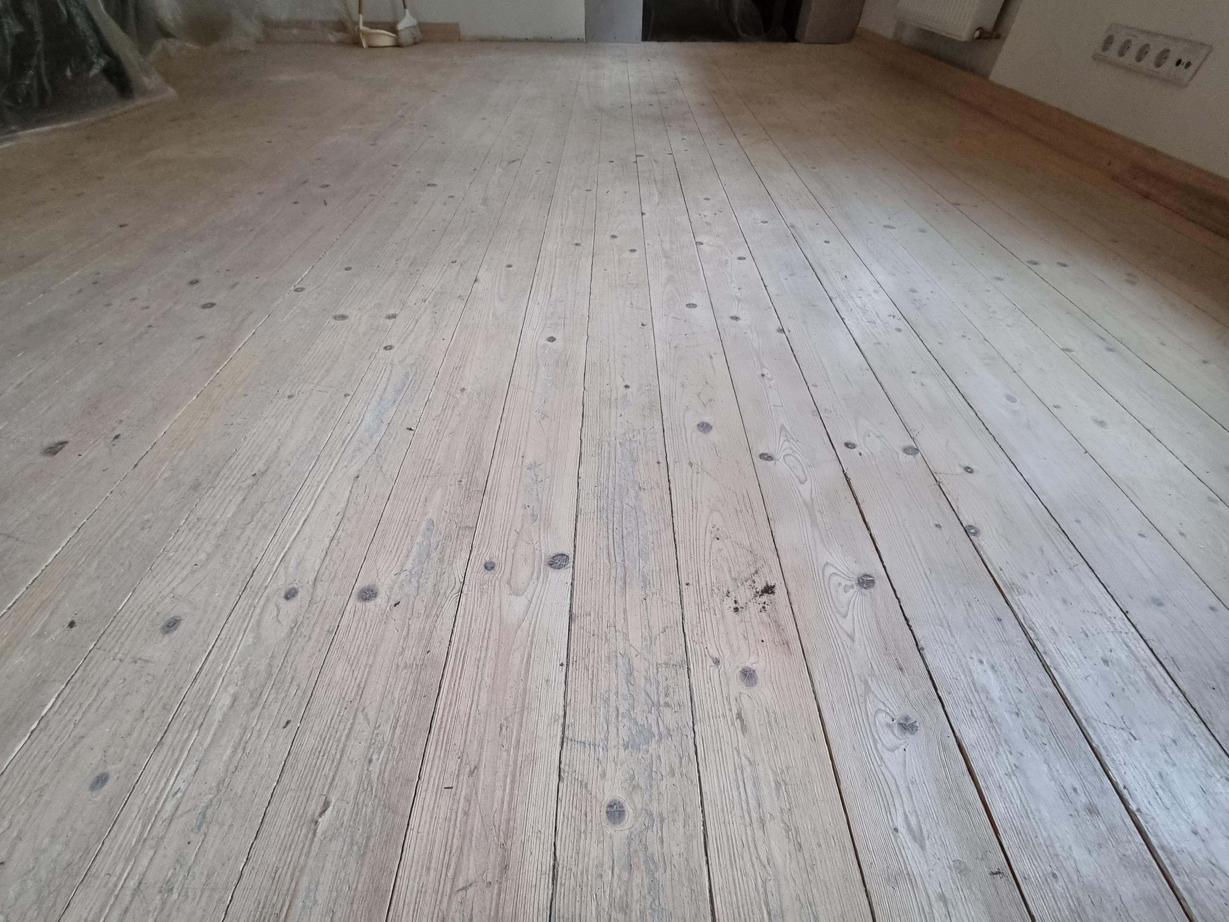 Liistude eemaldamine, suure, ning väiksenurgalihvijaga lihvimine, vahedesse, mis laudade vahel, ning kui ka suuremad praod, puidu kitt, ning 3X Õlivahaga üle. Töö aeg. kitt tahab kuivada, ning ka õlivaha kihtide vahel, et ei oska täpset aja kulu teile ütelda ( milline on temperatuur, milline on ventilatsioon jne.