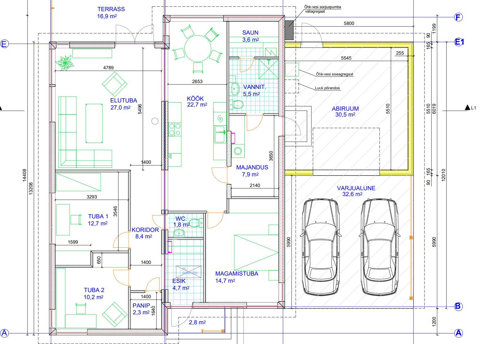 1. Plaatvundamendi tööd Tööd: Pinnase koorimine Pinnase täitmine kruusa ja liivaga Ehituskile paigaldus EPS 120 (300 mm) soojustuse paigaldus L-ploki paigaldus Armeerimise paigaldus Betoneerimine Põrandakütte torustiku paigaldus Materjalid: Kruus/liiv Soojustus EPS 120 (300 mm) L-plokk EPS 120 (100 mm) Ehituskile Armatuur Põrandaküttetoru (20 mm) Betoon 2. Karkassi ja fassaaditööd Tööd: Puitsõrestiku (50×150 mm) püstitamine Tuuletõkkeplaadi (Isoplaat) paigaldus Tuulutusliistude (25×50 mm) paigaldus Värvitud voodrilaua paigaldus Soojustuse (150 mm + 50 mm) paigaldus Ristiroovituse (50×50 mm) paigaldus Aurutõkkekile paigaldus Kipsplaadi paigaldus Varjualuse seina ehitus Materjalid: Puitmaterjal Soojustusvill Aurutõkkekile Voodrilaud Kinnitusvahendid Kipsplaat 3. Katusetööd Tööd: Sarikate paigaldus (50×200 mm) Hingava aluskatte paigaldus Tuulutusliistude (25×50 mm) paigaldus Katuseroovituse (30×100 mm) paigaldus Katusekatte (Klassic plekk) paigaldus Soojustuse (200 mm) paigaldus Aurutõkkekile paigaldus Laekipsi paigaldus Materjalid: Sarikad (50×200×6000 mm) Roovitus (32×100 mm) Tuulutusliist Katusekate (Klassic plekk) Liiteplekid, servaplekid Soojustus (200 mm) Aurutõkkekile Kinnitusvahendid Kipsplaat 4. Avatäidete tööd Tööd: Garaažiukse paigaldus Välisukse paigaldus Akende paigaldus Materjalid: Garaažiuks Aknad (valged, seest ja väljast) Välisuks Montaaživaht Kinnitusvahendid |