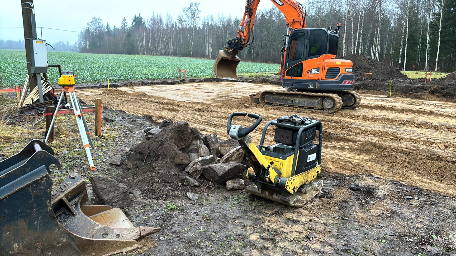 Elektrivarustus olemas, puurkaev rajatud, sissesõidutee rajatud, hoone alune tagasitäide (geotekstiil, kruus, liiv) teostatud. Ehitusprojekt, ehitusluba olemas.