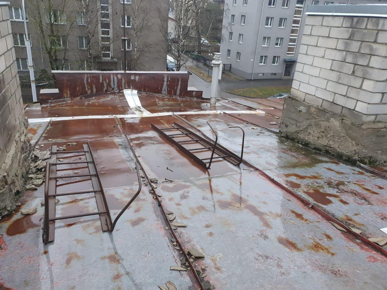 Katkise eterniidi eemaldamine ja utiliseerimine, hävinud roovituse laudade asendus, kattekile paigaldus, uue eterniidi paigaldus, uued harja ja neelu plekid, tuulekasti remont, korstna plekid.