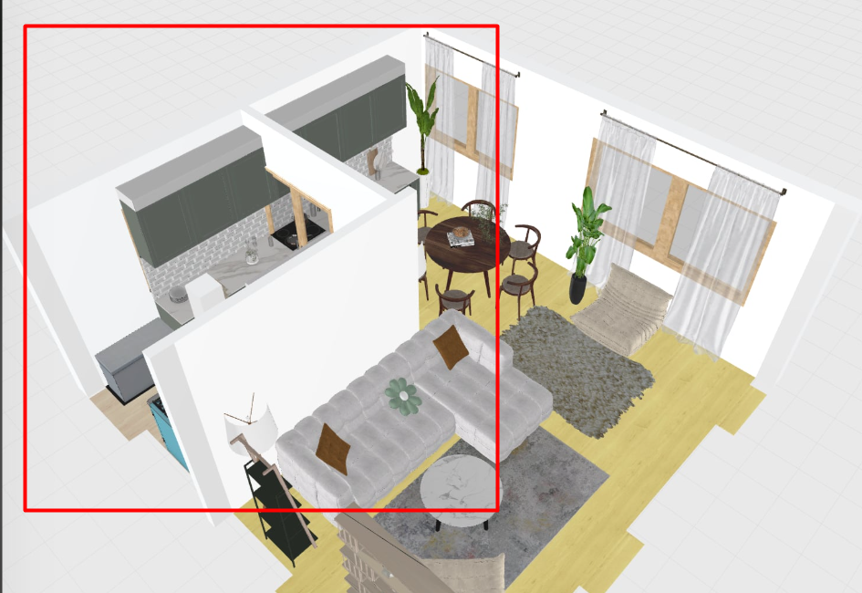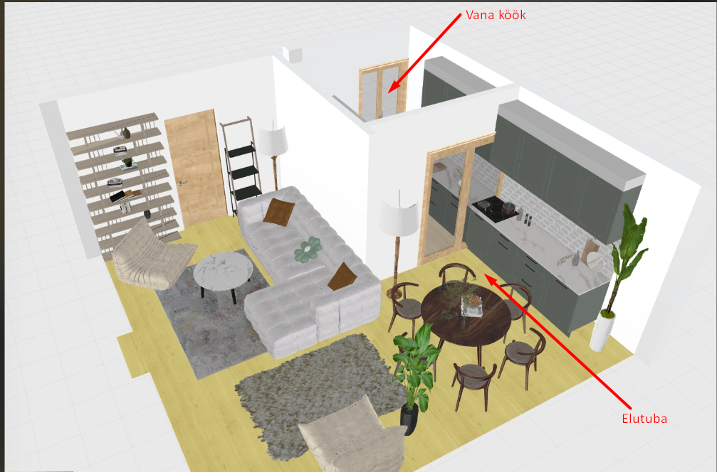 Vana püstpalkmaja planeeringus tehtud muudatus - vana köögi ja elutoa vaheline sein sai eemaldatud ja planeeritud uus köök, mis ulatub osaliselt elutuppa. Kuna aga köögi ja elutoa seinad, põrand ja lagi ei ole ühel joonel, siis on vaja uue köögimööbli jaoks neid korrigeerida.