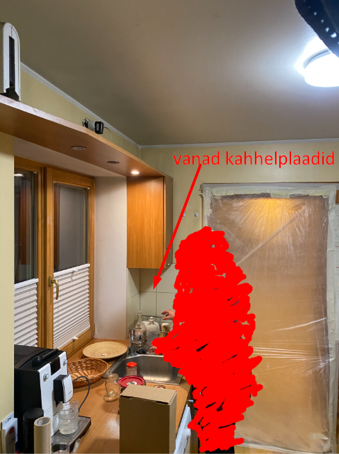 Elutoa poolse lae allapoole toomine köögikappide laiusel osal - Uued köögikapid on planeeritud läbivalt köögist elutuppa. Köögi lagi on varasemalt toodud ripplaena umbes 25 cm madalamale elutoa laest. Uue köögimööbli seinakapid on planeeritud vana köögi laeni ning on soov, et uute köögikappide peale ei jääks tolmu koguvat pinda vaid need ulatuksid ka elutoa poolt vastu "lage" . Selleks tuleb kipsplaadi abil lagi kappide laiuselt/sügavuselt ehitada allapoole.