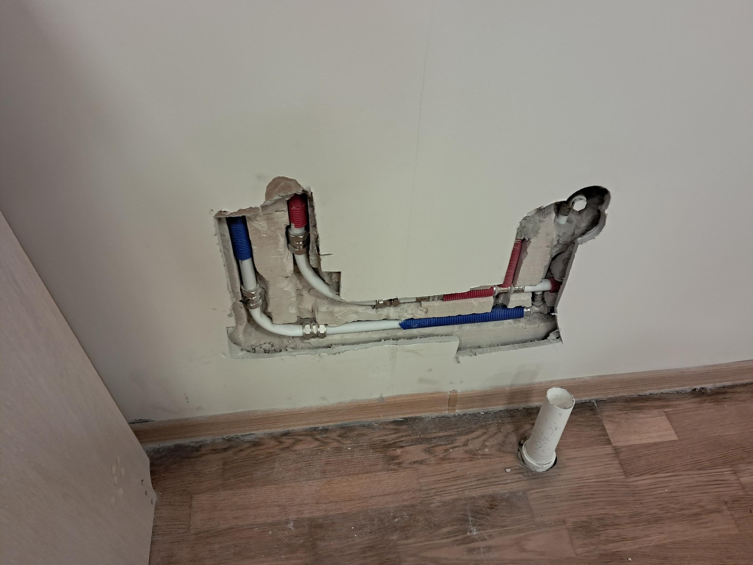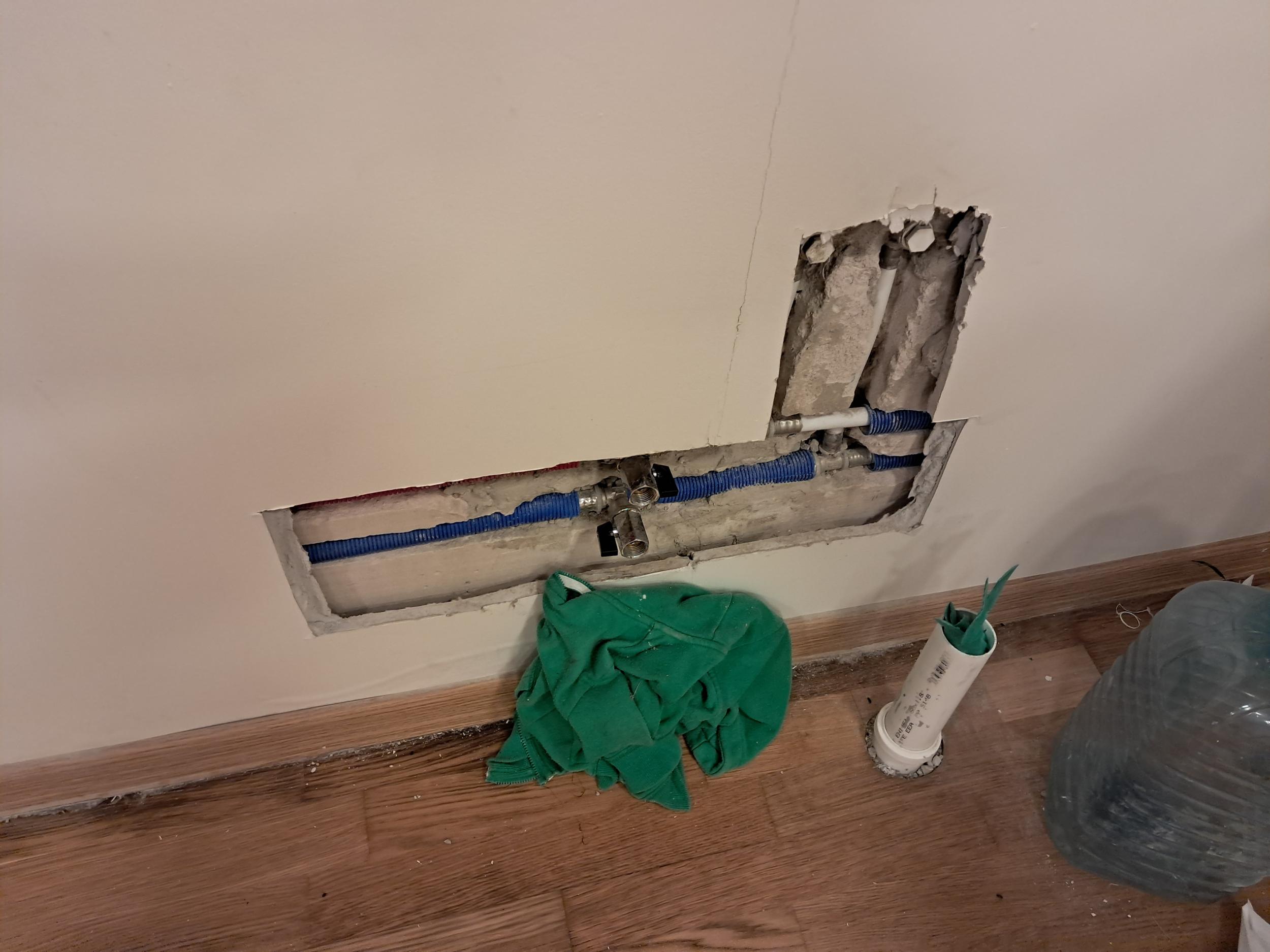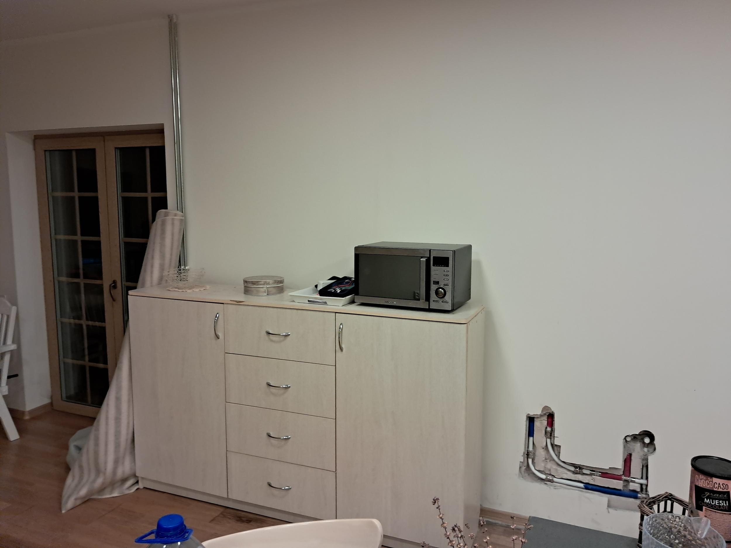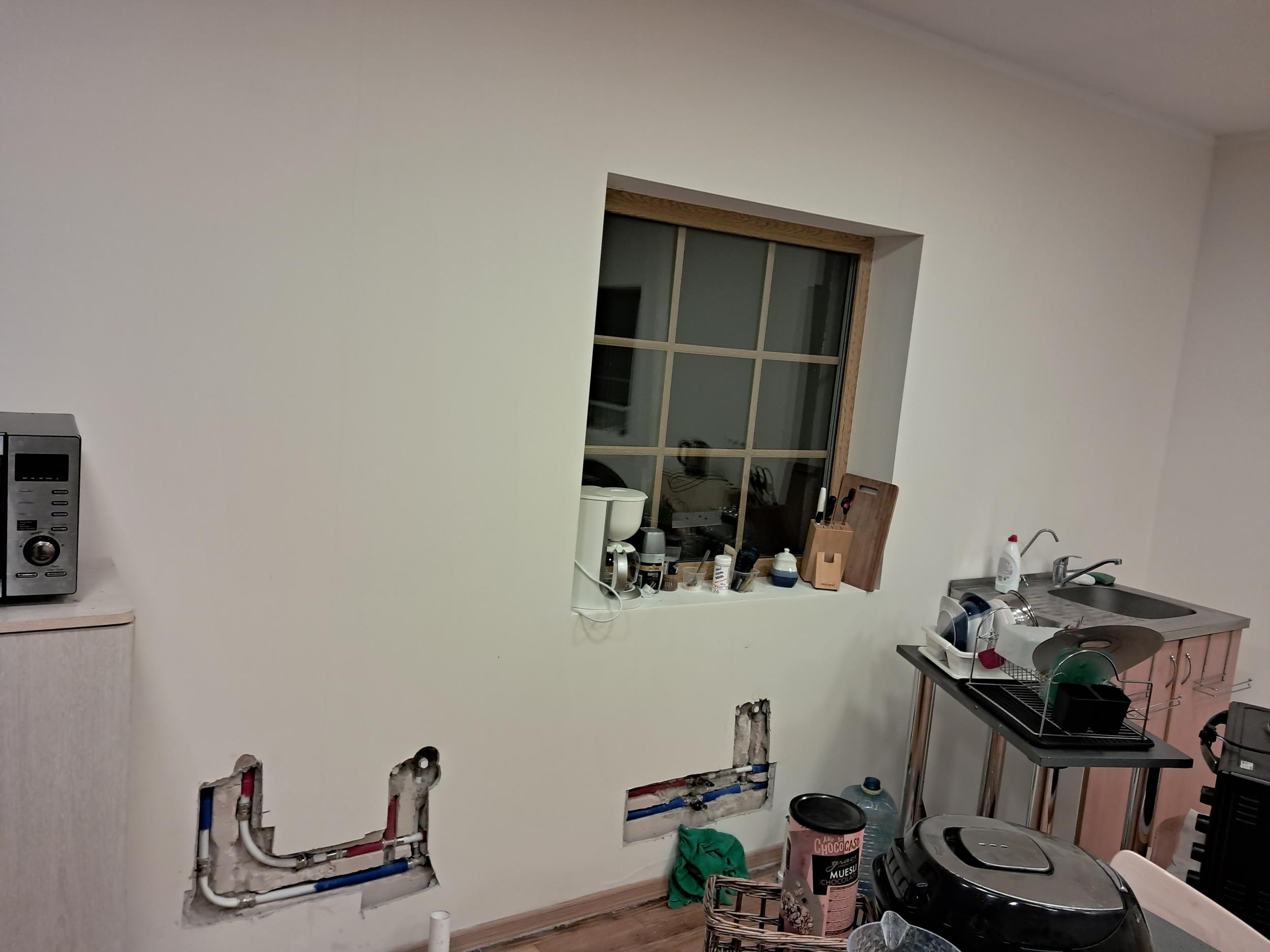 6. Hüprokiga kinni katta augud seinas 0,5x0,4 (2tk) ning pahteldada vuugid ning seejärel värvida 2 korda kogu sein kuni ukseni 12,9m2